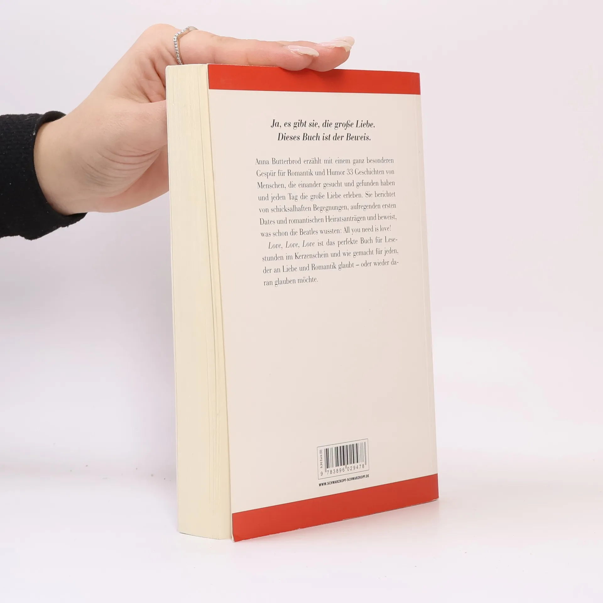 Die Autorin ist der schönsten aller Emotionen auf den Grund gegangen und hat 33 Menschen interviewt, die ihren Traumpartner bereits gefunden haben. Eines hat sie dabei festgestellt: Der oder die Richtige kann überall warten – in einem Swimmingpool in Indien, auf der Quarantänestation eines Krankenhauses oder an einem Hamburger Stromkasten. Denn Amor lauert oft dort, wo man ihn am wenigsten vermutet. Anna Butterbrod hat 33 Geschichten gesammelt, die unterschiedlicher nicht sein könnten: Sie berichtet von Menschen, die sich nur kurz trafen und sofort wussten, dass sie ihr Leben miteinander verbringen würden, und von Paaren, die lange Umwege gehen mussten, ehe sie endlich beieinander ankamen. Da sind Meike und Torsten, die sich zum ersten Mal in einem Online-Rollenspiel über den Weg liefen, oder Sabina und Nico, denen eine an die falsche Nummer verschickte SMS zum großen Glück verhalf. Mit viel Herzenswärme und Humor hat Anna Butterbrod diese bezaubernden Liebesgeschichten aufgeschrieben und damit bewiesen, was bereits die Beatles wussten: »All you need is love!« Das passende Geschenkbuch für alle Romantiker!