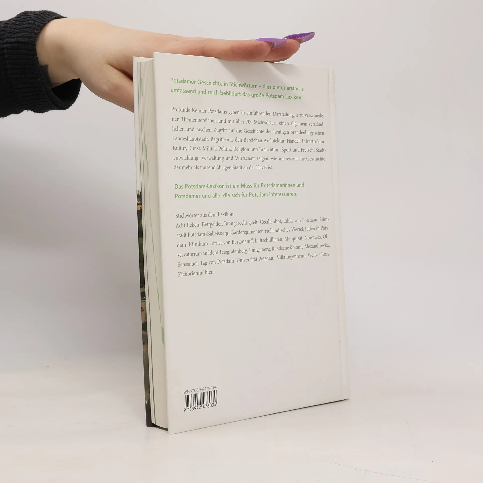 Das Potsdam-Lexikon erschließt in rund 800 Stichworten die über 1000 Jahre Stadtgeschichte der heutigen brandenburgischen Landeshauptstadt. Der Schwerpunkt liegt auf der historischtopografischen Entwicklung Potsdams. Unter diesem Aspekt werden Begriffe aus den Bereichen Architektur, Biografie, Bevölkerung, Geschichte, Handel, Infrastruktur, Kultur, Kunst, Militär, Natur, Politik, Religion und Brauchtum, Sport und Freizeit, Verwaltung und Wirtschaft behandelt. Weiterführende Literaturhinweise zu vielen Stichworten und seltenes Bildmaterial machen das Buch zu einem Muss für alle historisch interessierten Potsdamer und Potsdam-Begeisterte. Herausgeber des Lexikons sind das Haus der Brandenburgisch-Preußischen Geschichte und das Potsdam-Museum, unterstützt von einem Arbeitskreis ausgesuchter Potsdam-Kenner und Historiker.