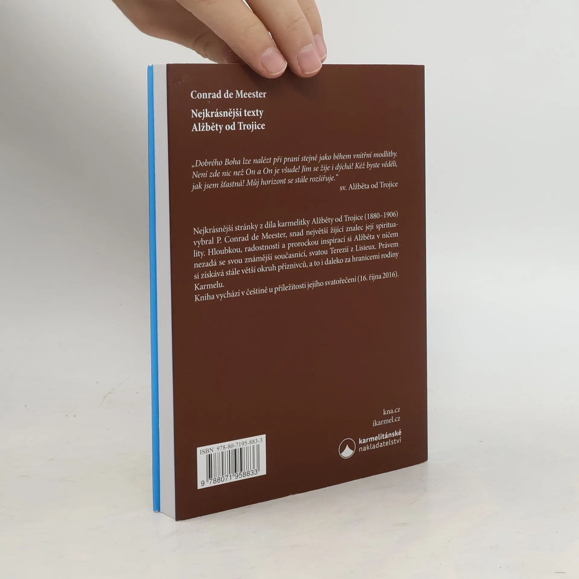 Nejkrásnější stránky z díla karmelitky Alžběty od Trojice (1880–1906) vybral P. Conrad de Meester, snad největší žijící znalec její spirituality. Hloubkou, radostností a prorockou inspirací si Alžběta v ničem nezadá se svou známější současnicí, svatou Terezií z Lisieux. Právem si získává stále větší okruh příznivců, a to daleko za hranicemi rodiny Karmelu. Kniha vychází v češtině u příležitosti jejího svatořečení (16. října 2016).