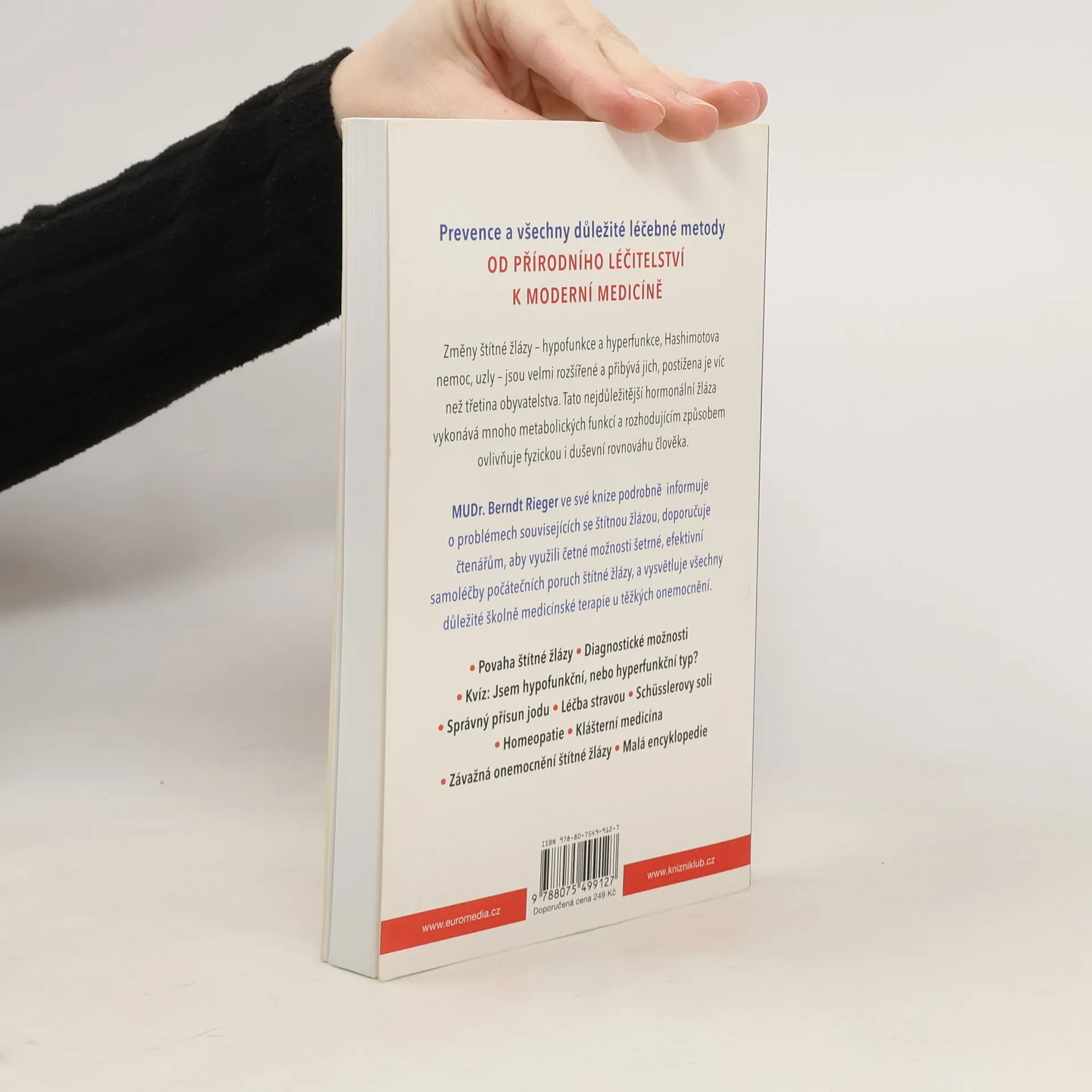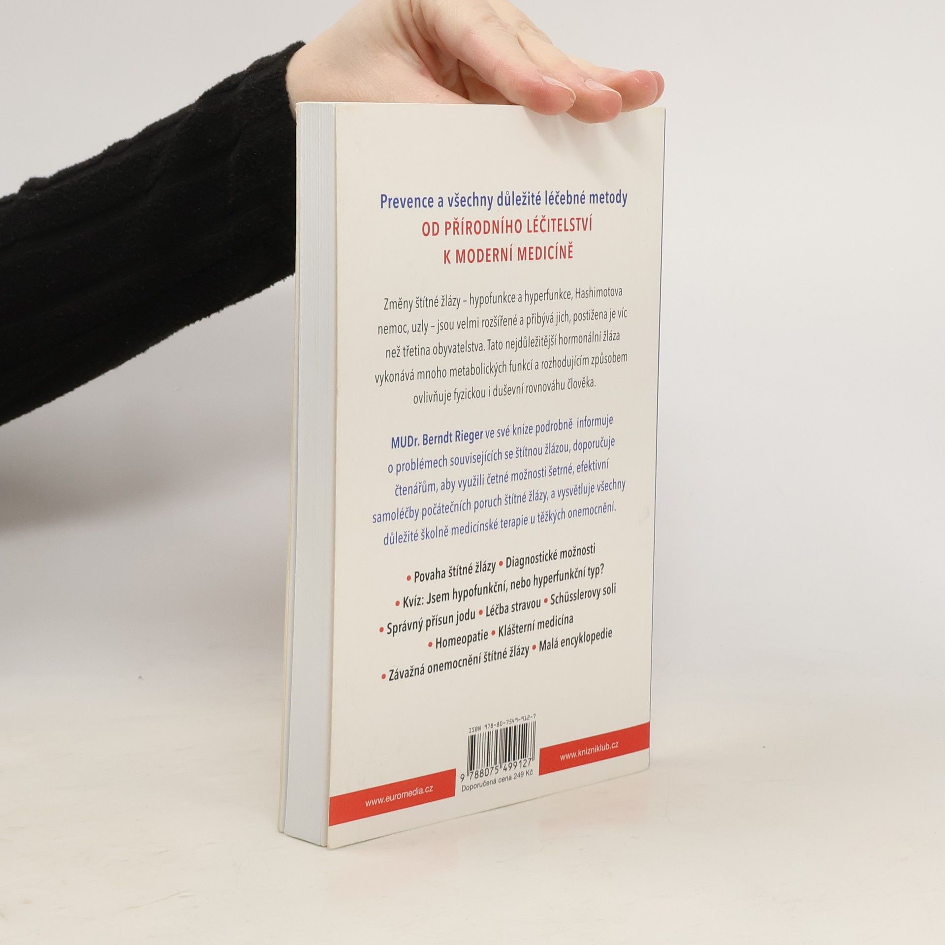 Prevence a všechny důležité léčebné metody – od přírodního léčitelství k moderní medicíně Změny štítné žlázy – hypofunkce a hyperfunkce, Hashimotova nemoc, uzly – jsou velmi rozšířené a přibývá jich, postižena je víc než třetina obyvatelstva. Tato nejdůležitější hormonální žláza vykonává mnoho metabolických funkcí a rozhodujícím způsobem ovlivňuje fyzickou i duševní rovnováhu člověka. MUDr. Berndt Rieger ve své knize podrobně informuje o problémech souvisejících se štítnou žlázou, doporučuje čtenářům, aby využili četné možnosti šetrné, efektivní samoléčby počátečních poruch štítné žlázy, a vysvětluje všechny důležité školně medicínské terapie u těžkých onemocnění.
