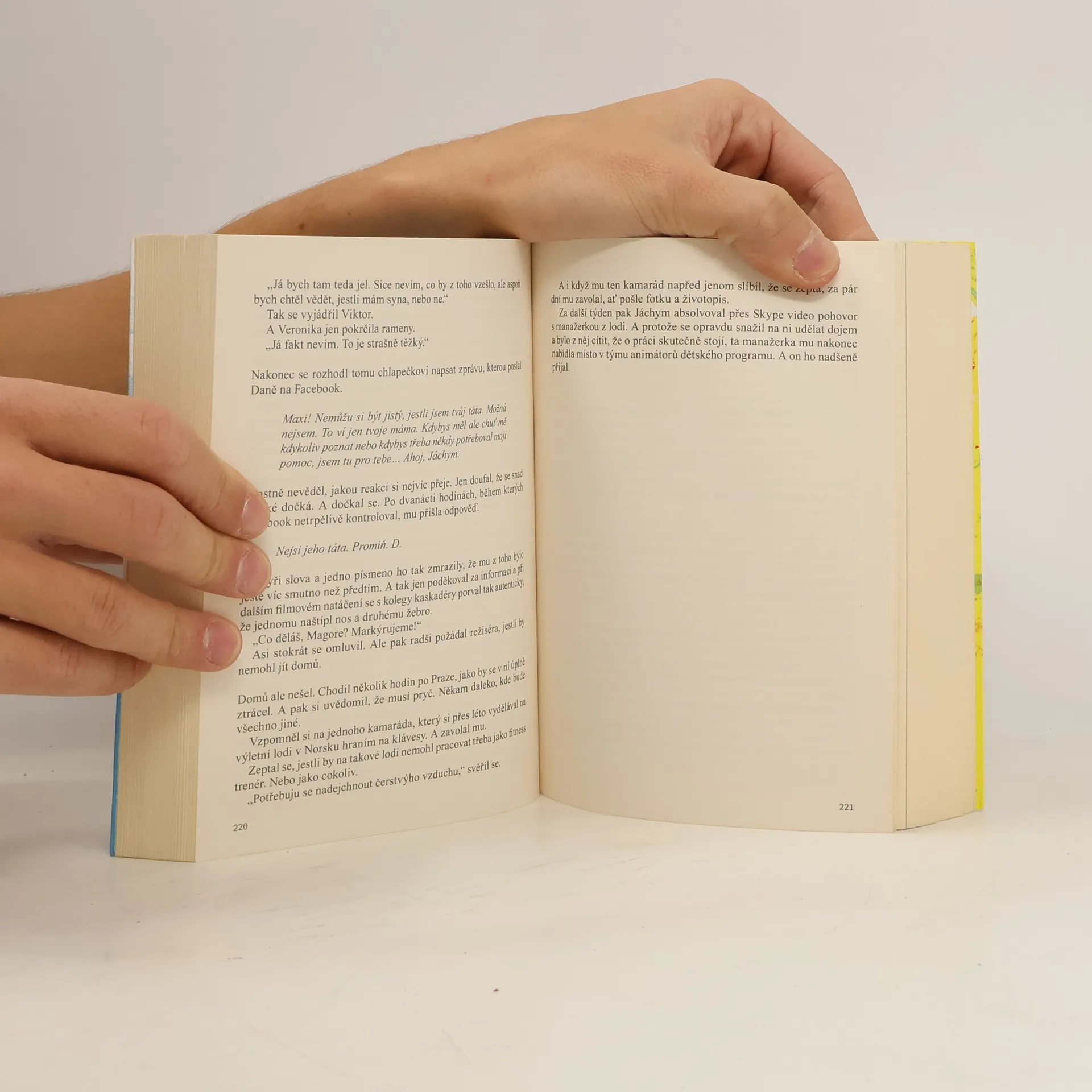 Nový dvojromán Patrika Hartla je možné začít číst z kterékoli strany. Vyberte si! Příběh sourozenců Veroniky a Jáchyma budete prožívat podle toho, který začátek zvolíte. Buďto do života skočíte jako Jáchym volným pádem z výšky čtyř tisíc metrů nebo se jako Veronika budete statečně prokousávat citovými nástrahami ode dne ke dni. Prožijete dva příběhy v jednom. Jako on a jako ona. Nebo v opačném pořadí, což bude překvapivě jiné, než byste očekávali... Můžete s nimi hledat štěstí, doufat, věřit, dělat chyby a napravovat je. Budete se o ně bát, fandit jim a zamilovávat se s nimi. A nejenom s nimi. Taky s Eliškou, Kubou, Dedém, Monikou, Viktorem, Amy, Kryštofem, Danou, Viki a Ondřejem. Protože štěstí a lásku hledá každý. I když to zní jako fráze.