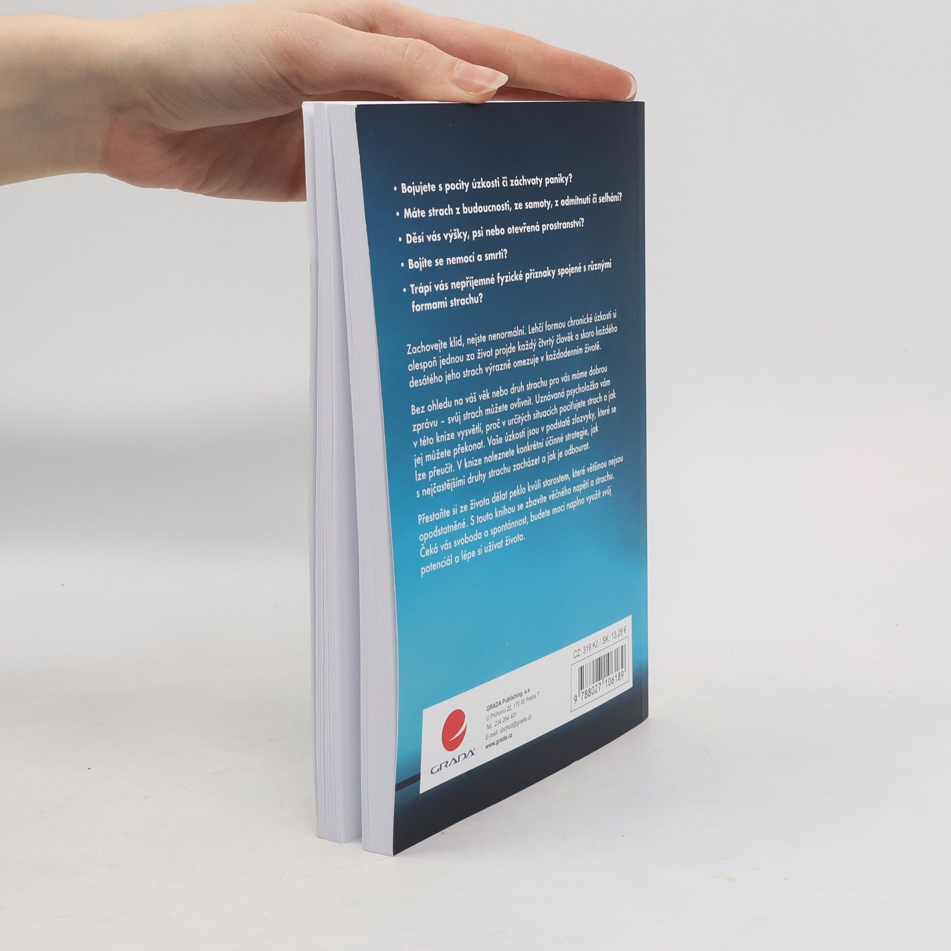 Bojujete s pocity úzkosti či záchvaty paniky? Máte strach z budoucnosti, ze samoty, z odmítnutí či selhání? Děsí vás výšky, psi nebo otevřená prostranství? Bojíte se nemocí a smrti? Trápí vás nepříjemné fyzické příznaky spojené s různými formami strachu? Zachovejte klid, nejste nenormální. Lehčí formou chronické úzkosti si alespoň jednou za život projde každý čtvrtý člověk a skoro každého desátého jeho strach výrazně omezuje v každodenním životě. Bez ohledu na váš věk nebo druh strachu pro vás máme dobrou zprávu – svůj strach můžete ovlivnit. Uznávaná psycholožka vám v této knize vysvětlí, proč v určitých situacích pociťujete strach a jak jej můžete překonat. Vaše úzkosti jsou v podstatě zlozvyky, které se lze přeučit. V knize naleznete konkrétní účinné strategie, jak s nejčastějšími druhy strachu zacházet a jak je odbourat. Přestaňte si ze života dělat peklo kvůli starostem, které většinou nejsou opodstatněné. S touto knihou se zbavíte věčného napětí a strachu. Čeká vás svoboda a spontánnost, budete moci naplno využít svůj potenciál a lépe si užívat života.