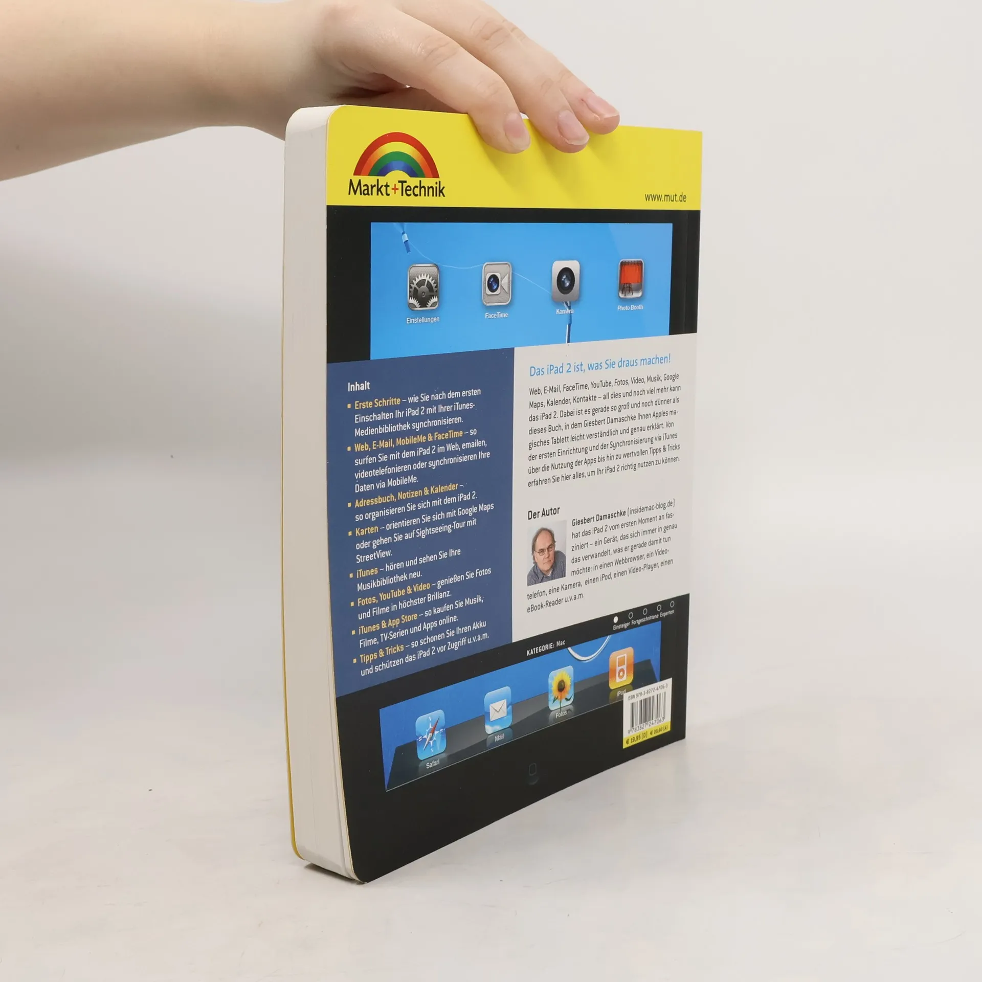 Das iPad 2 ist, was Sie daraus machen! Web, E-Mail, FaceTime, YouTube, Fotos, Video, Musik, Google Maps, Kalender, Kontakte – all dies und noch viel mehr kann das iPad 2. Dabei ist es gerade so groß und noch dünner als dieses Buch, in dem Giesbert Damaschke Ihnen Apples magisches Tablet leicht verständlich und genau erklärt. Von der ersten Einrichtung und der Synchronisierung via iTunes über die Nutzung der Apps bis hin zu wertvollen Tipps & Tricks erfahren Sie hier alles, um Ihr iPad 2 richtig nutzen zu können. Aus dem Inhalt: * Erste Schritte – wie Sie nach dem ersten Einschalten Ihr iPad 2 mit Ihrer iTunes-Medienbibliothek synchronisieren. * Web, E-Mail, MobileMe & FaceTime – so surfen Sie mit dem iPad 2 im Web, emailen, videotelefonieren oder synchronisieren Ihre Daten via MobileMe. * Adressbuch, Notizen & Kalender – so organisieren Sie sich mit dem iPad 2. * Karten – orientieren Sie sich mit Google Maps oder gehen Sie auf Sightseeing-Tour mit StreetView. * iTunes – hören und sehen Sie Ihre Musikbibliothek neu. * Fotos, YouTube & Video – genießen Sie Fotos und Filme in höchster Brillanz. * iTunes & App Store – so kaufen Sie Musik, Filme, TV-Serien und Apps online. * Tipps & Tricks – so schonen Sie Ihren Akku und schützen das iPad 2 vor Zugriff u. v. a. m.