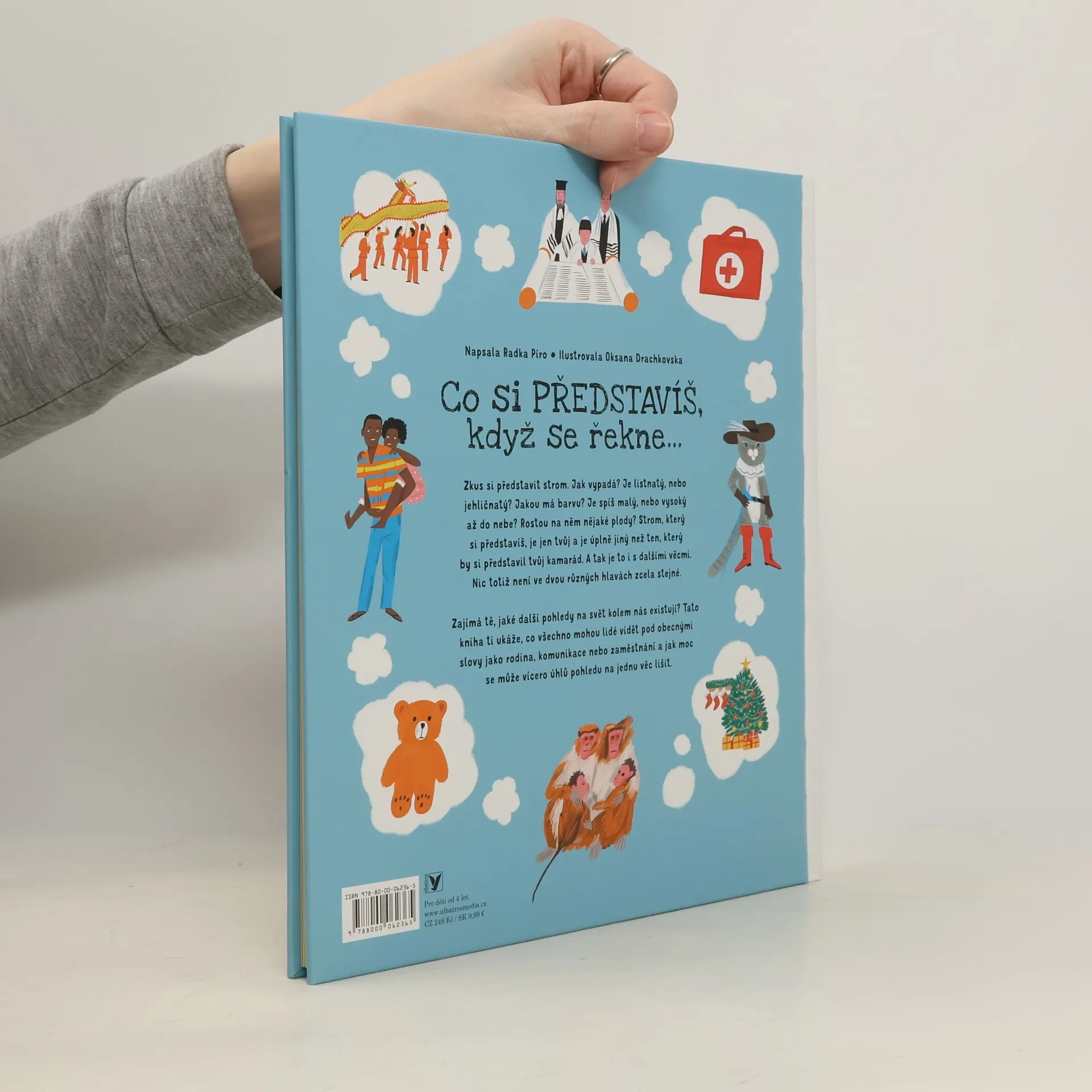 Ponoř se do představ svých i lidí okolo sebe! Zkus si představit strom. Jak vypadá? Je listnatý, nebo jehličnatý? Jakou má barvu? Je spíš malý nebo vysoký až do nebe? Strom, který si představíš je jen tvůj a je úplně jiný než ten, který by si představil tvůj kamarád. A tak je to s dalšími věcmi. Nic totiž není ve dvou různých hlavách zcela stejné. Tato kniha ti ukáže, jak moc se může vícero úhlů pohledu na jednu věc lišit.