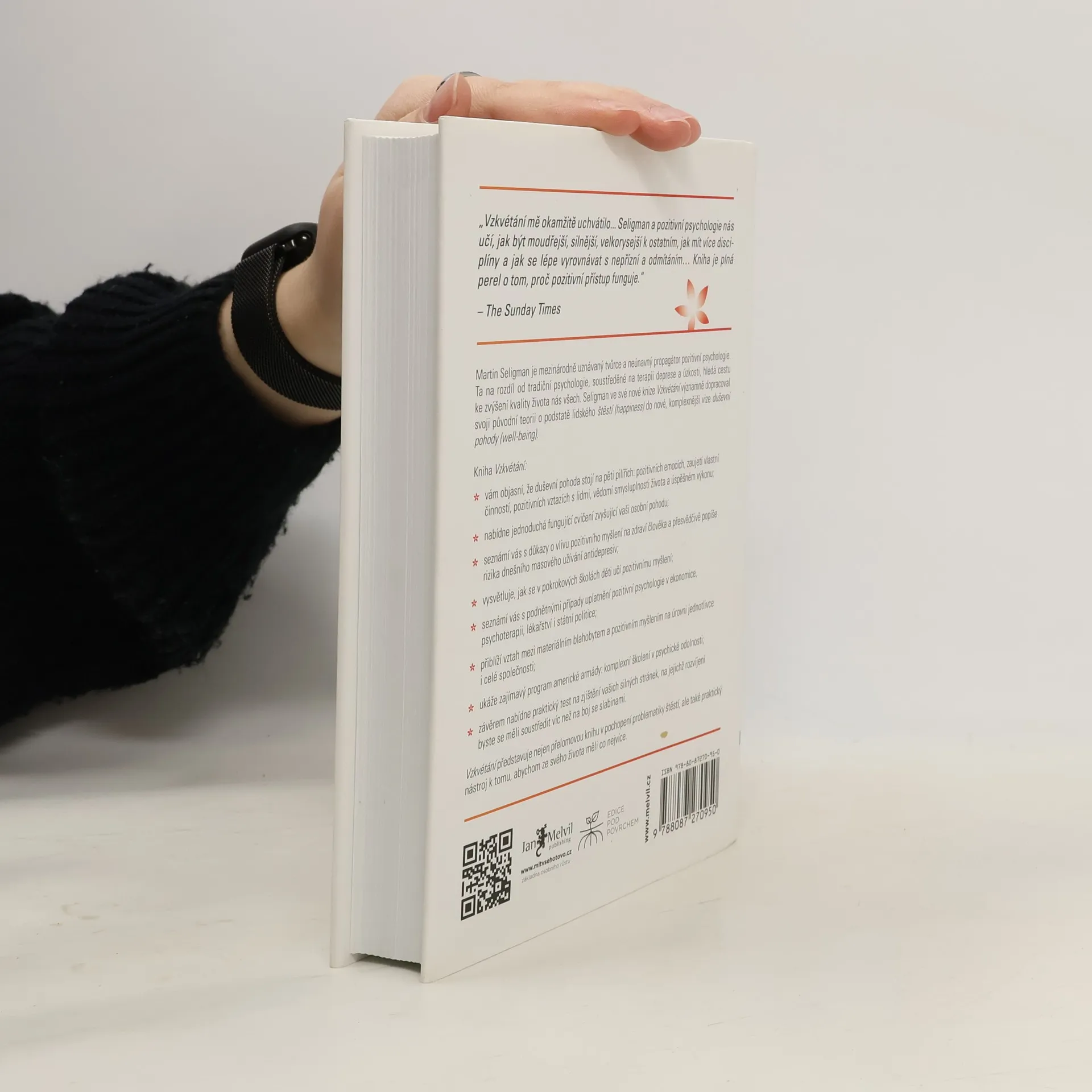 Nové poznatky o podstatě štěstí a duševní pohody Kniha Vzkvétání — Nové poznatky o podstatě štěstí a duševní pohody navazuje na přelomové práce Dr. Martina Seligmana v oblasti optimismu, motivace a lidského charakteru a ukazuje nám, jak ze svého života získat co nejvíce: odhaluje vzrušující novou teorii o tom, co tvoří „dobrý život“ – pro jednotlivce, pro komunity a pro celé národy. Ve fascinující kombinaci vědeckých poznatků a praxe vystihuje kniha Vzkvétání skvěle záměr i obsah pozitivní psychologie. Štěstí samotné, přestože je důležitou součástí osobní pohody, nedává životu člověka úplný a pravý smysl. Seligman nyní klade otázku: Co je tím, co vám umožňuje kultivovat svá nadání, vytvářet hlubší a trvalejší vztahy s ostatními lidmi, cítit radost a smysluplně přispívat světu? Neboli: co je tím, díky čemu můžete prospívat? Do centra zájmu se dostává osobní pohoda (well-being), přičemž štěstí (happiness) neboli pozitivní emoce se stávají jedním z pěti pilířů pozitivní psychologie, spolu se zaujetím, pozitivními vztahy, smysluplností a úspěšným výkonem. Těchto pět prvků, pro které se používá akronym PERMA (z anglických termínů Positive Emotions, Engagement, Relationship, Meaning, Accomplishment), představuje permanentní, trvalé stavební kameny plně uspokojivého života.