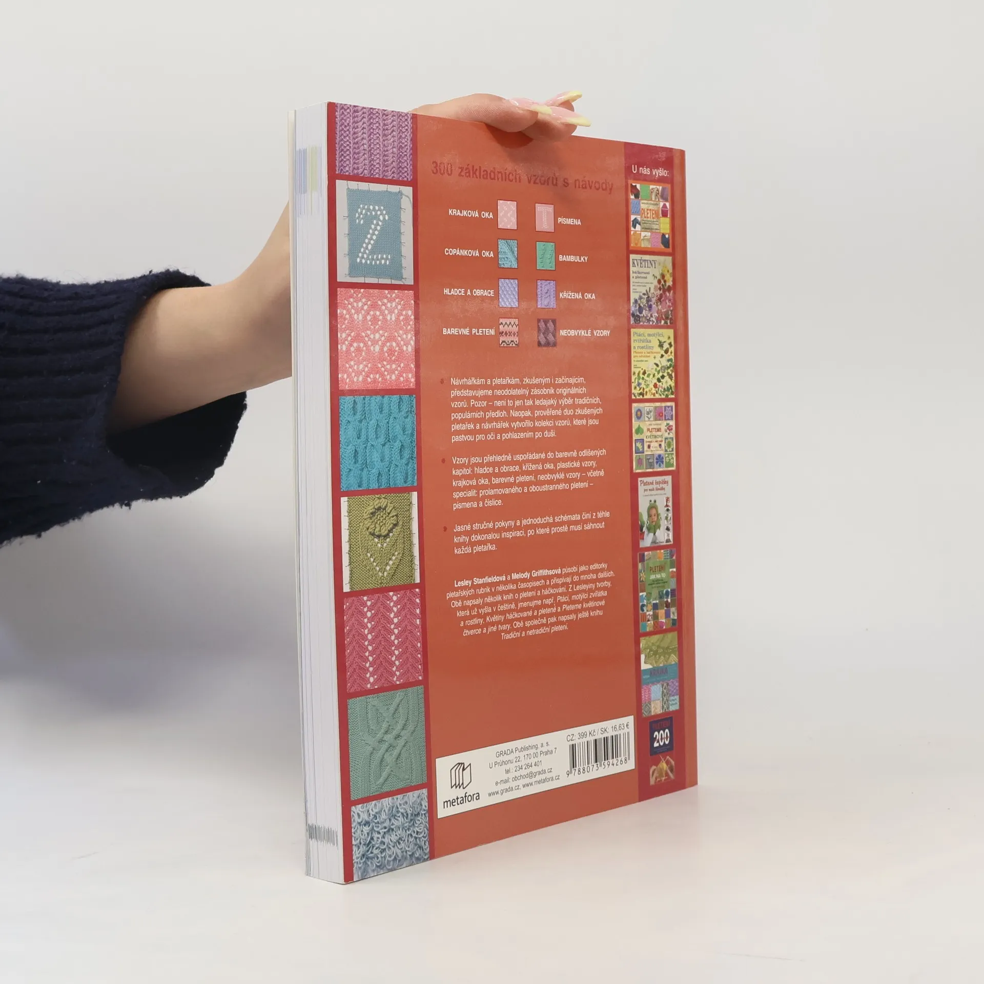 Nápaditý průvodce 300 vzory k pletení, které musíte vyzkoušet – žhavé novinky i nadčasová klasika. Publikace poslouží jako výjimečný zdroj neotřelých nápadů pletařkám všech úrovní pokročilosti. Ani na přeplněném trhu a v obrovské konkurenci se Pletené vzory neztratí, protože se jedná o jedinečnou knihu. Při její přípravě se spojily dvě zkušené návrhářky vzorů ručního pletení a vytvořily dosud nevídanou sbírku vzorů. Každý si přijde na své. Nebude zklamán ani ten, kdo by hledal klasické vzory. Ovšem pravý poklad spočívá v nových předlohách, které nenajdete v žádné jiné knize. Vzory jsou pro přehlednost rozděleny do devíti barevně odlišených kapitol, jsou označeny stupněm obtížnosti a seskupeny podle techniky pletení: hladce a obrace, pružné vzory, křížená oka, copánky, krajkové vzory, bambulky, barevné proužky, norské vzory, neobvyklé vzory – včetně zajímavostí, jako je prolamované a oboustranné pletení – a písmena a číslice. Tato kniha je zkrátka nezbytností pro každou zapálenou pletařku.