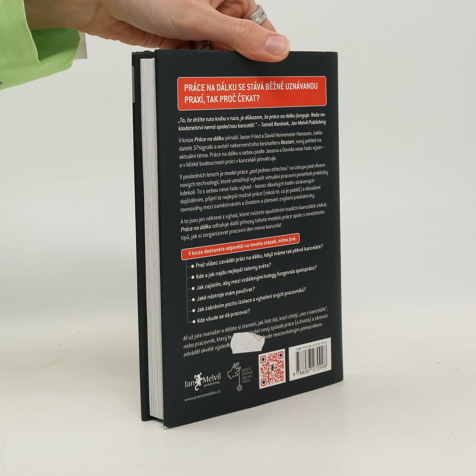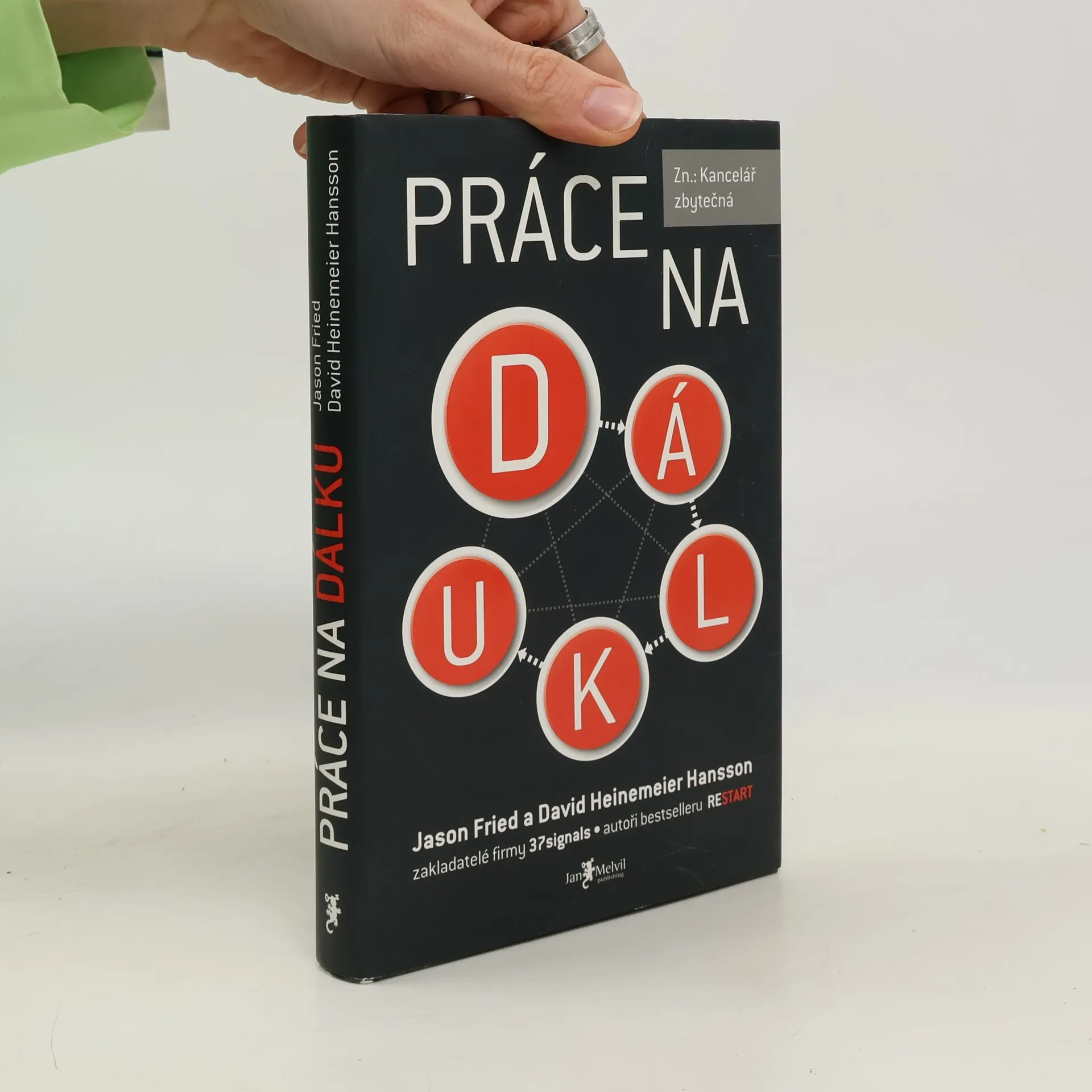 Zn: Kancelář zbytečná. V knize Práce na dálku přináší Jason Fried a David Heinemeier Hansson, zakladatelé 37signals a autoři nekonvenčního bestselleru Restart, nový pohled na aktuální téma. Práce na dálku s sebou podle Jasona a Davida nese řadu výzev - a v blízké budoucnosti práci v kanceláři převálcuje. V posledních letech je model práce "pod jednou střechou" na ústupu pod vlivem nových technologií, které umožňují vytvořit virtuální pracovní prostředky prakticky kdekoli.