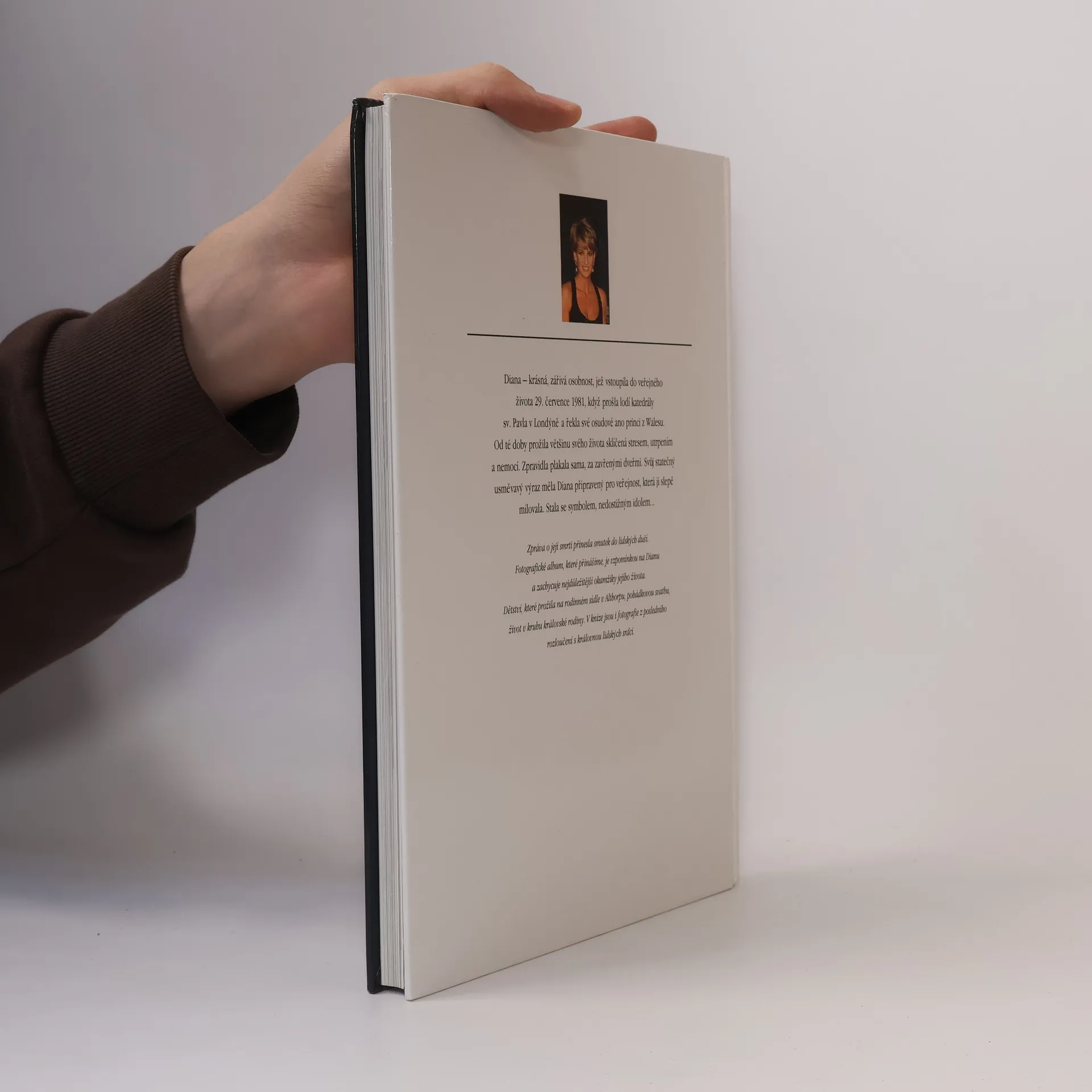 Její tragická smrt vyvolala po celém světě šok a znepokojení. Miliony lidí se rozloučily s princeznou z Walesu v ohromném projevu soucitu a smutku. Toto kniha zachycuje nejen tyto okamžiky, ale především množství fotografií Diany od renomovaných fotografů, které ji činí nezapomenutelnou. Více než 200 snímků vypráví o Dianině životě: její dětství, dospívání a čas jako mladé učitelky, která se stydlivě dívá do objektivu. Následuje oslnivá svatba devatenáctileté Lady Diany Spencer s princem Charlesem, následníkem britského trůnu. Obrázky a vzpomínky na princeznu, která se stala symbolem srdečnosti a tepla, ale také hrdosti, osamělosti a tragického osudu. Pod tlakem médií musela sdílet své problémy, touhy a tajemství s celým světem. Diana fascinovala lidi svou jedinečnou aurou a i po smrti si získala miliony srdcí. Tato kniha opět přináší výjimečné charisma "královny srdcí".