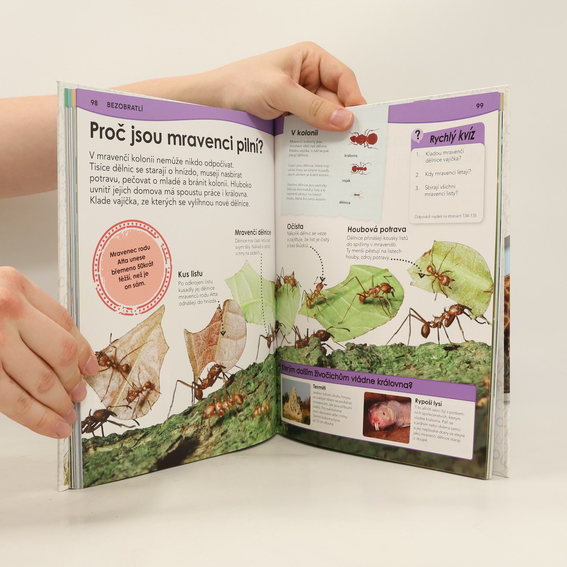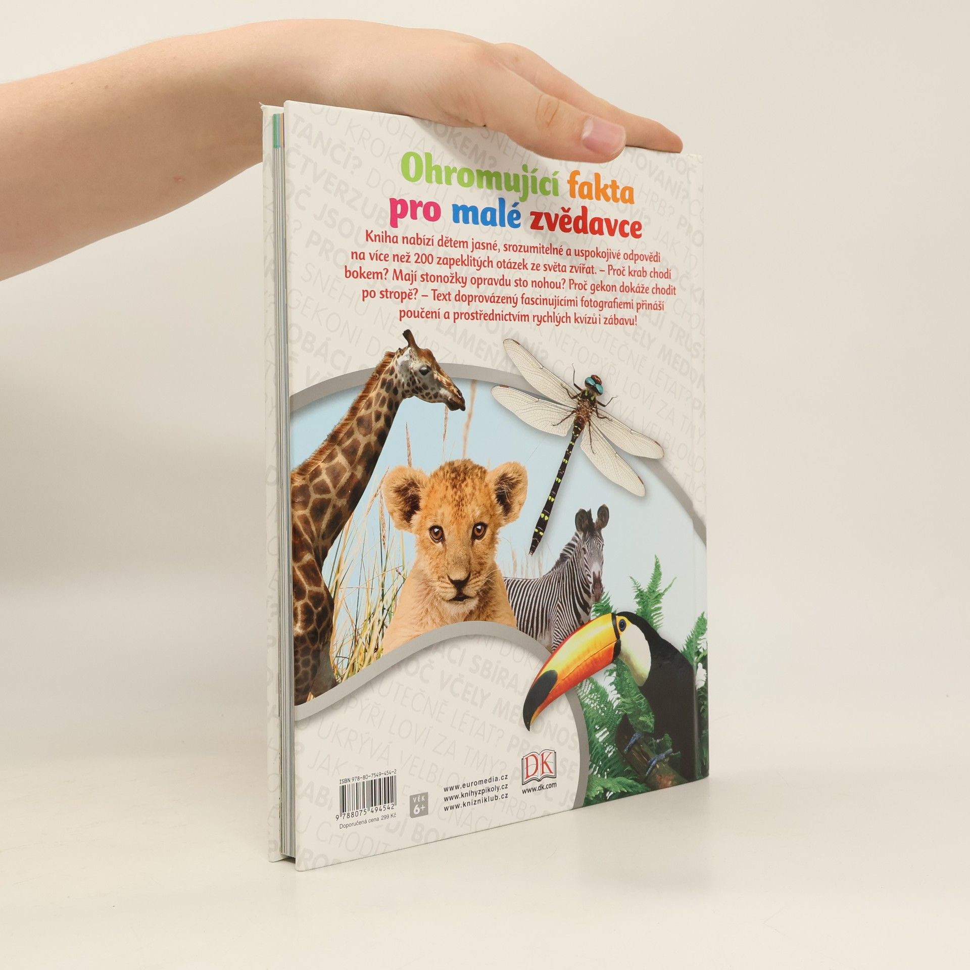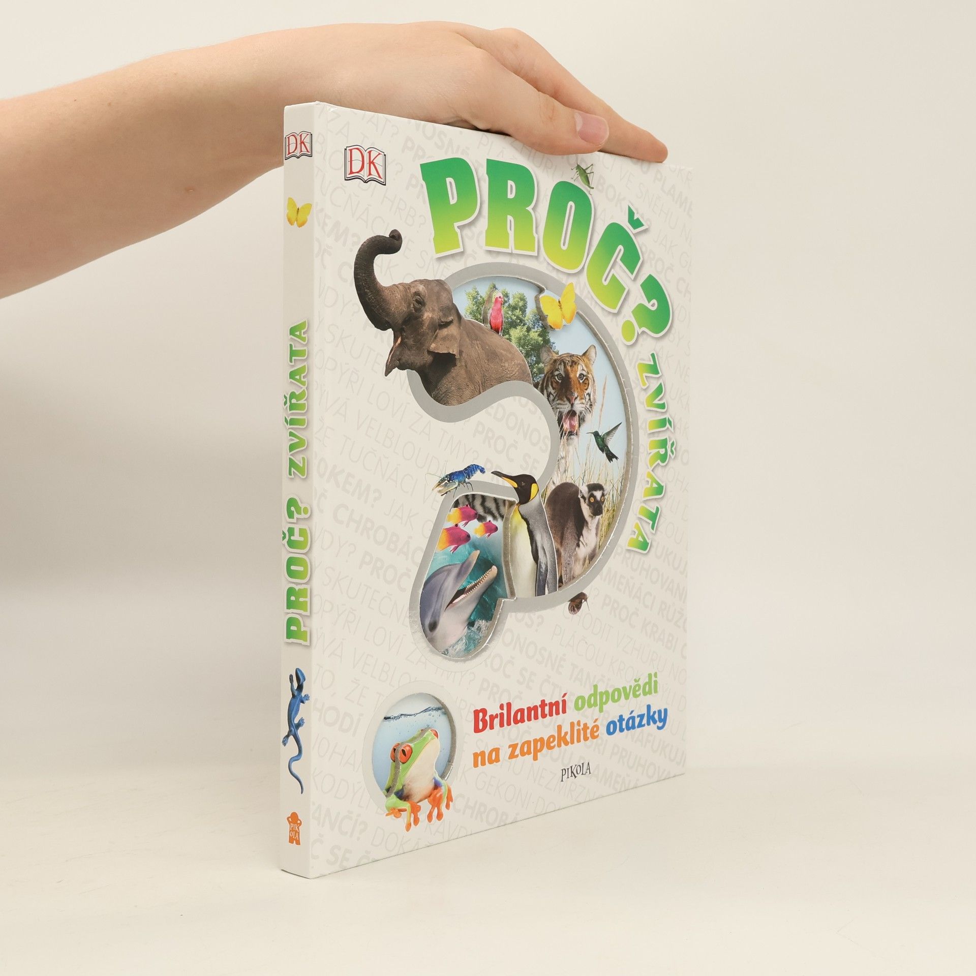 Brilantní odpovědi na zapeklité otázky, to je podnázev této encyklopedie o zvířatech, určené pro děti mladšího školního věku. – Proč krab chodí bokem? Mají stonožky opravdu sto nohou? Proč gekon dokáže chodit po stropě? Jak mohou netopýři najít potravu potmě? Proč tučňáci ve velkých mrazech nezmrznou? Proč jsou mravenci tak činorodí? – Na více než 200 bezprostředních a prostých otázek dostávají děti jasné, srozumitelné a uspokojivé odpovědi plné informací doprovázených fascinujícími fotografiemi.