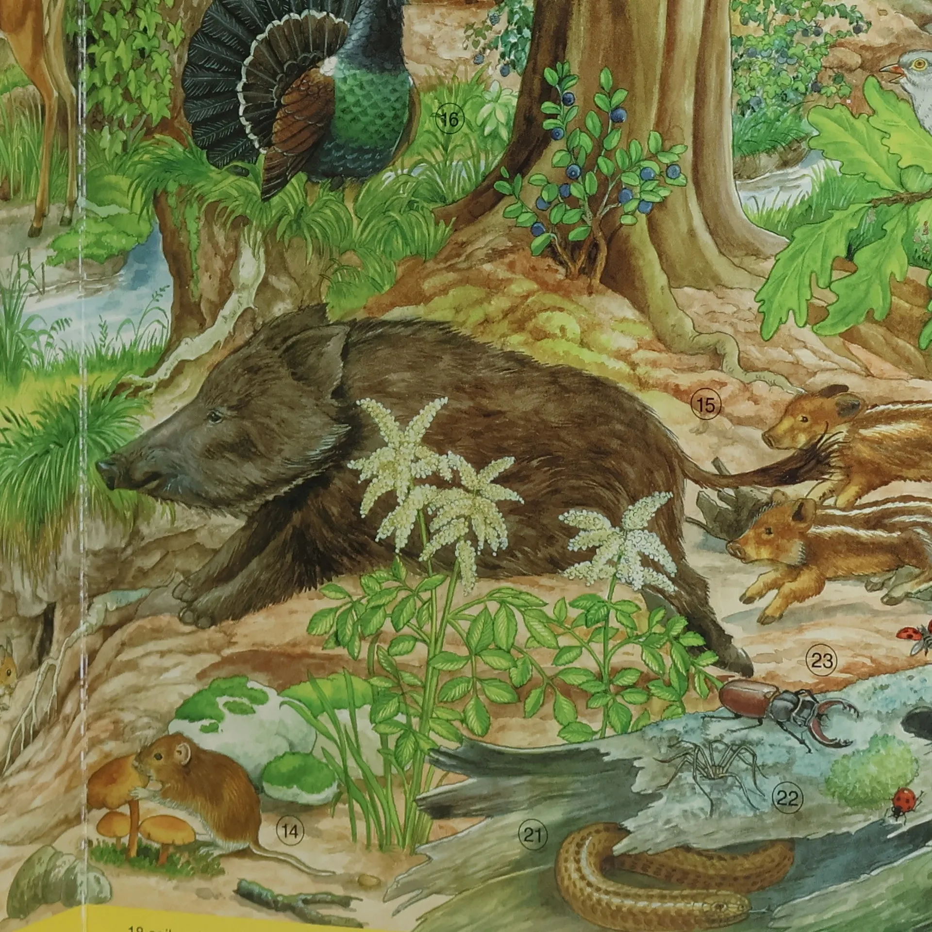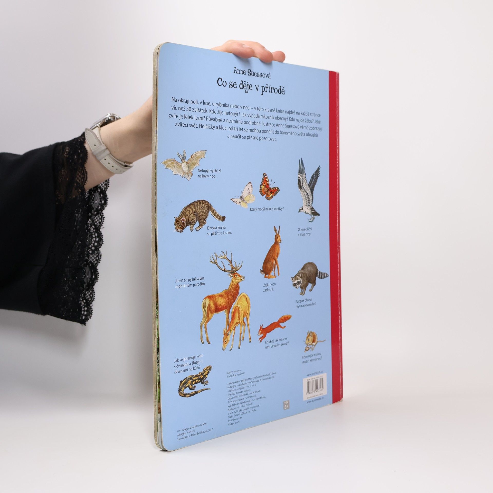 Na okraji polí, v lese, u rybníka nebo v noci – v této krásné knize najdeš na každé stránce víc než 30 zvířátek. Kde žije netopýr? Jak vypadá rákosník obecný? Kdo najde žábu? Jaké zvíře je lelek lesní? Půvabné a nesmírně podrobné ilustrace Anne Suessové věrně zobrazují zvířecí svět. Holčičky a kluci od tří let se mohou ponořit do barevného světa obrázků a naučit se přesně pozorovat.