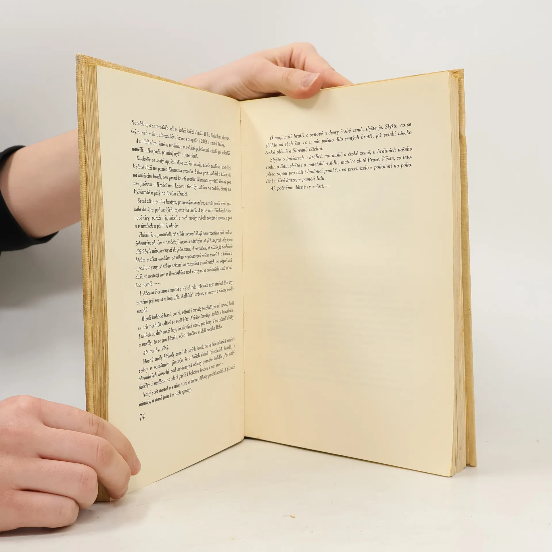 Poslyšte o našem praotci, o předcích, jak přišli do končin naší vlasti a usadili se po Labi a po Vltavě i po jiných řekách této země. Slyšte i, co více dochovalo se z temnoty věků, co zůstalo z báječných vypravování přešlých pokolení, jež klaněla se bohům v šeru starých hájů a jež obětovala studánkám v tichých ouvalech, jezerům i řekám i svatému, živému ohni ... Pojďte a poslyšte pověsti dávných časů...