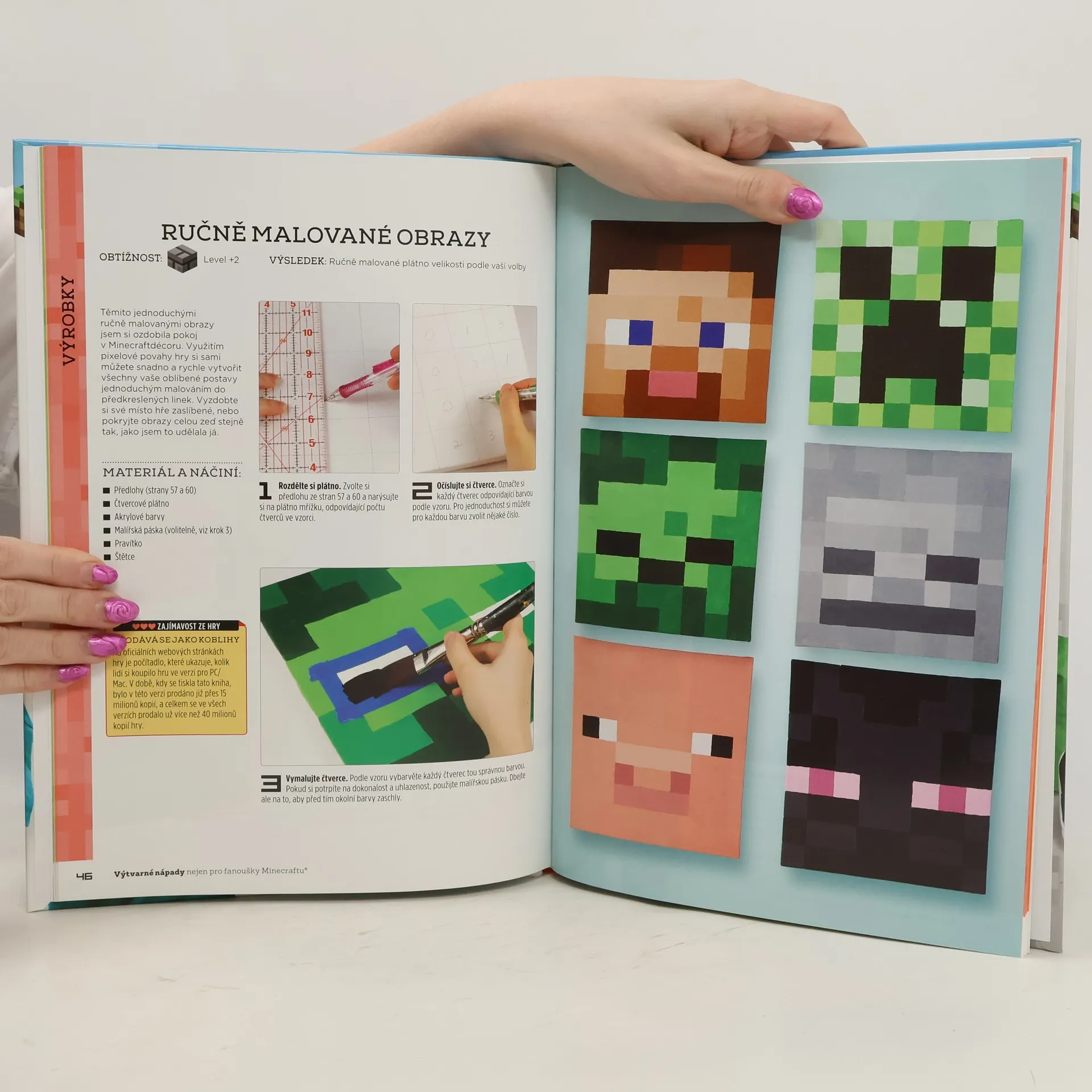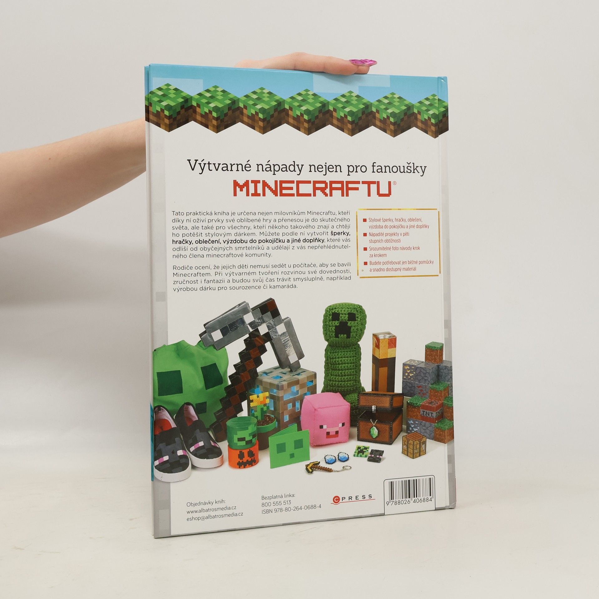 Tato praktická kniha je určena nejen milovníkům Minecraftu, kteří díky ní oživí prvky své oblíbené hry a přenesou je do skutečného světa, ale také pro všechny, kteří někoho takového znají a chtějí ho potěšit stylovým dárkem. Můžete podle ní vytvořit šperky, hračky, oblečení, výzdobu do pokojíčku a jiné doplňky, které vás odliší od obyčejných smrtelníků a udělají z vás nepřehlédnutelného člena minecraftové komunity. Rodiče ocení, že jejich děti nemusí sedět u počítače, aby se bavili Minecraftem. Při výtvarném tvoření rozvinou své dovednosti, zručnost i fantazii a budou svůj čas trávit smysluplně, například výrobou dárku pro sourozence či kamaráda. •Stylové šperky, hračky, oblečení, výzdoba do pokojíčku a jiné doplňky •Nápadité projekty v pěti stupních obtížnosti •Srozumitelné foto návody krok za krokem •Budete potřebovat jen běžné pomůcky a snadno dostupný materiál