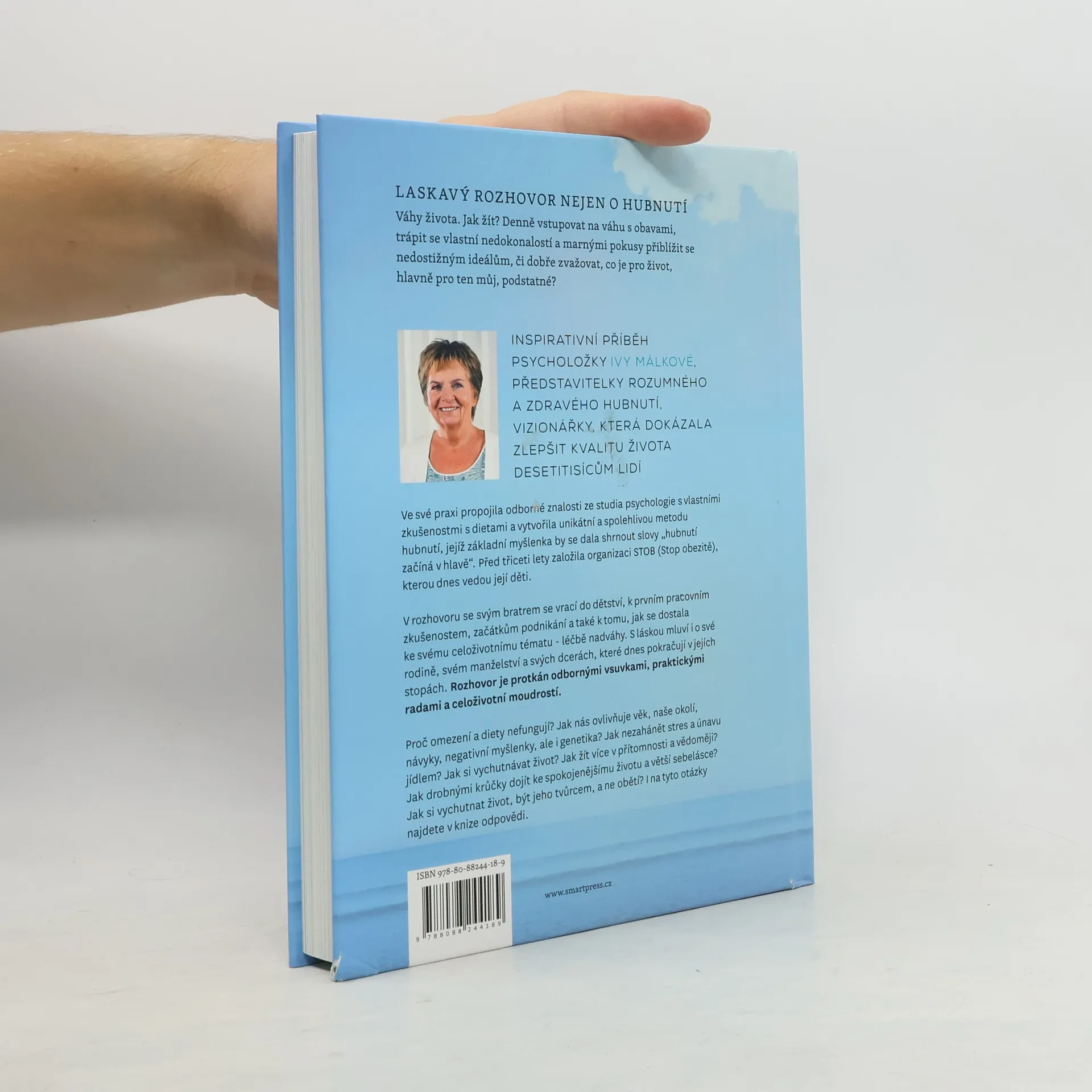 Váhy života. Jak žít? Denně vstupovat na váhu s obavami, trápit se vlastní nedokonalostí a marnými pokusy přiblížit se nedostižným ideálům, či dobře zvažovat, co je pro život, hlavně pro ten můj, podstatné? Inspirativní příběh psycholožky, představitelky rozumného a zdravého hubnutí, vizionářky, která dokázala zlepšit kvalitu života desetitisícům lidí. Ve své praxi propojila odborné znalosti ze studia psychologie s vlastními zkušenostmi s dietami a vytvořila unikátní a spolehlivou metodu hubnutí, jejíž základní myšlenka by se dala shrnout slovy "hubnutí začíná v hlavě". Před třiceti lety založila organizaci STOB (Stop obezitě), kterou dnes vedou její děti. V rozhovoru se svým bratrem se vrací do dětství, k prvním pracovním zkušenostem, začátkům podnikání a také k tomu, jak se dostala ke svému celoživotnímu tématu - léčbě nadváhy. S láskou mluví i o své rodině, svém manželství a svých dcerách, které dnes pokračují v jejích stopách. Rozhovor je protkán odbornými vsuvkami, praktickými radami a celoživotní moudrostí. Proč omezení a diety nefungují? Jak nás ovlivňuje věk, naše okolí, návyky, negativní myšlenky, ale i genetika? Jak nezahánět stres a únavu jídlem? Jak si vychutnávat život? Jak žít více v přítomnosti a vědoměji? Jak drobnými krůčky dojít ke spokojenějšímu životu a větší sebelásce? Jak si vychutnat život, být jeho tvůrcem, a ne obětí? I na tyto otázky najdete v knize odpovědi.