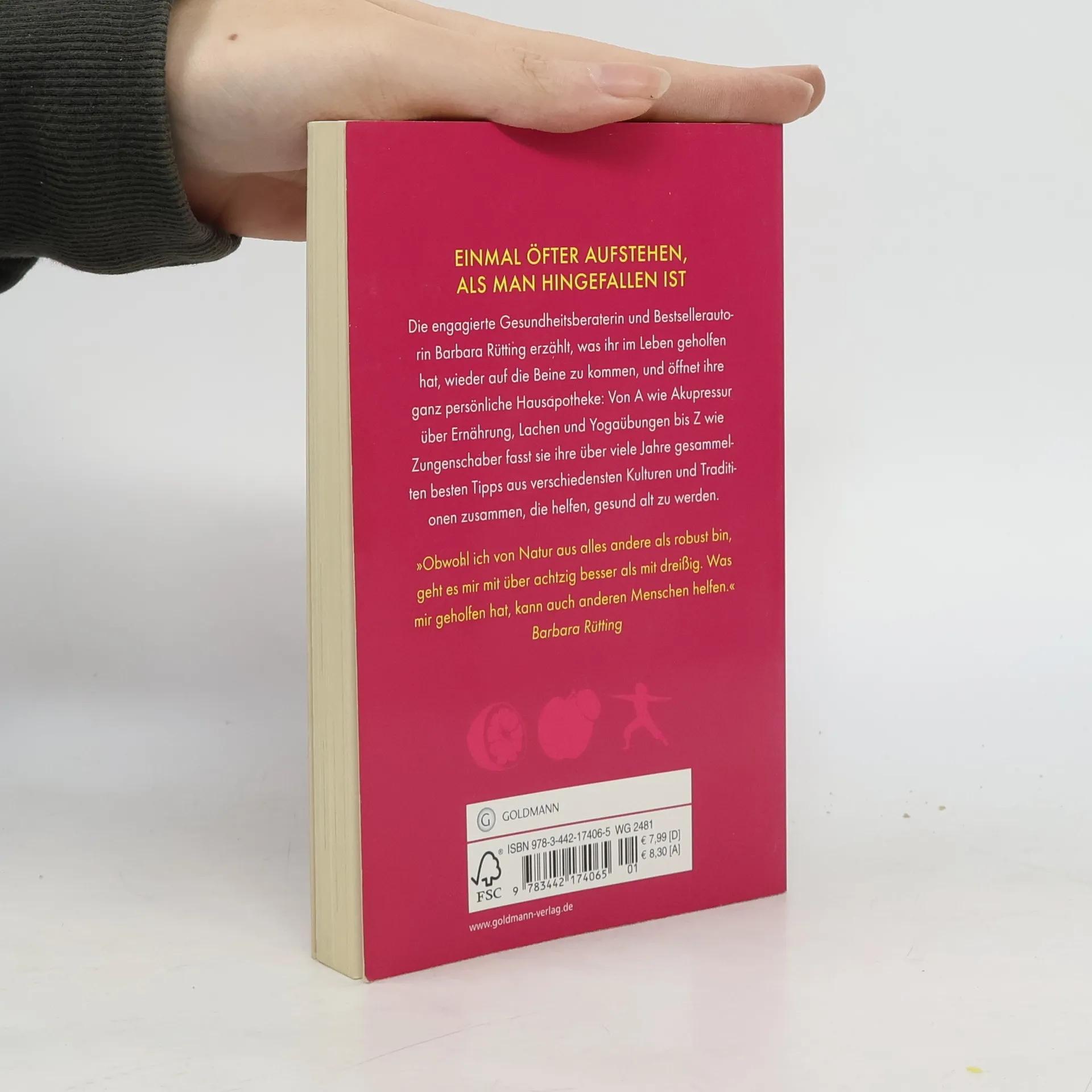 Die engagierte Gesundheitsberaterin und Bestsellerautorin Barbara Rütting erzählt, was ihr im Leben geholfen hat, wieder auf die Beine zu kommen, und öffnet ihre ganz persönliche Hausapotheke: Von A wie Akupressur über Ernährung, Lachen und Yogaübungen bis Z wie Zungenschaber fasst sie ihre über viele Jahre gesammelten besten Tipps aus verschiedensten Kulturen und Traditionen zusammen, die helfen, gesund alt zu werden.