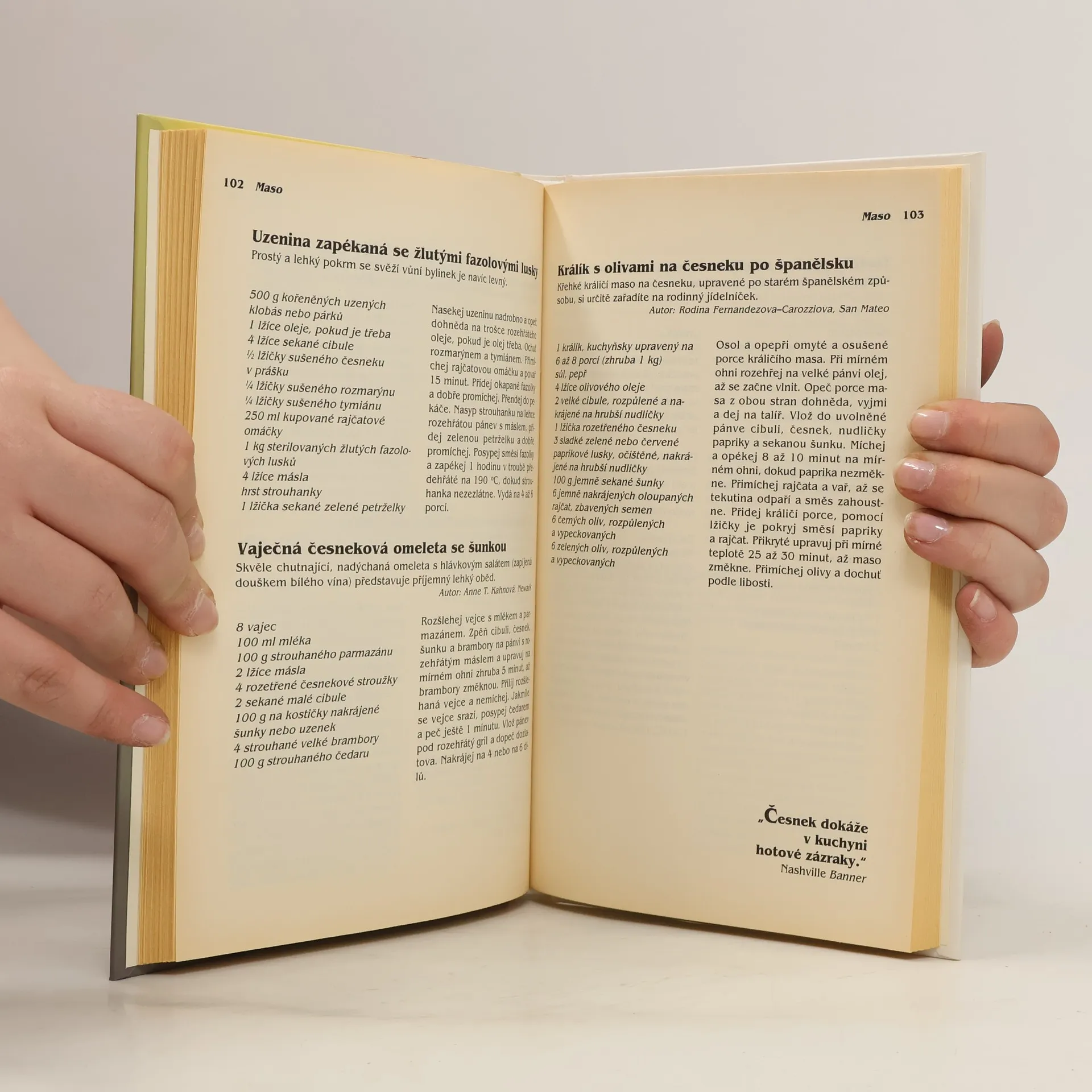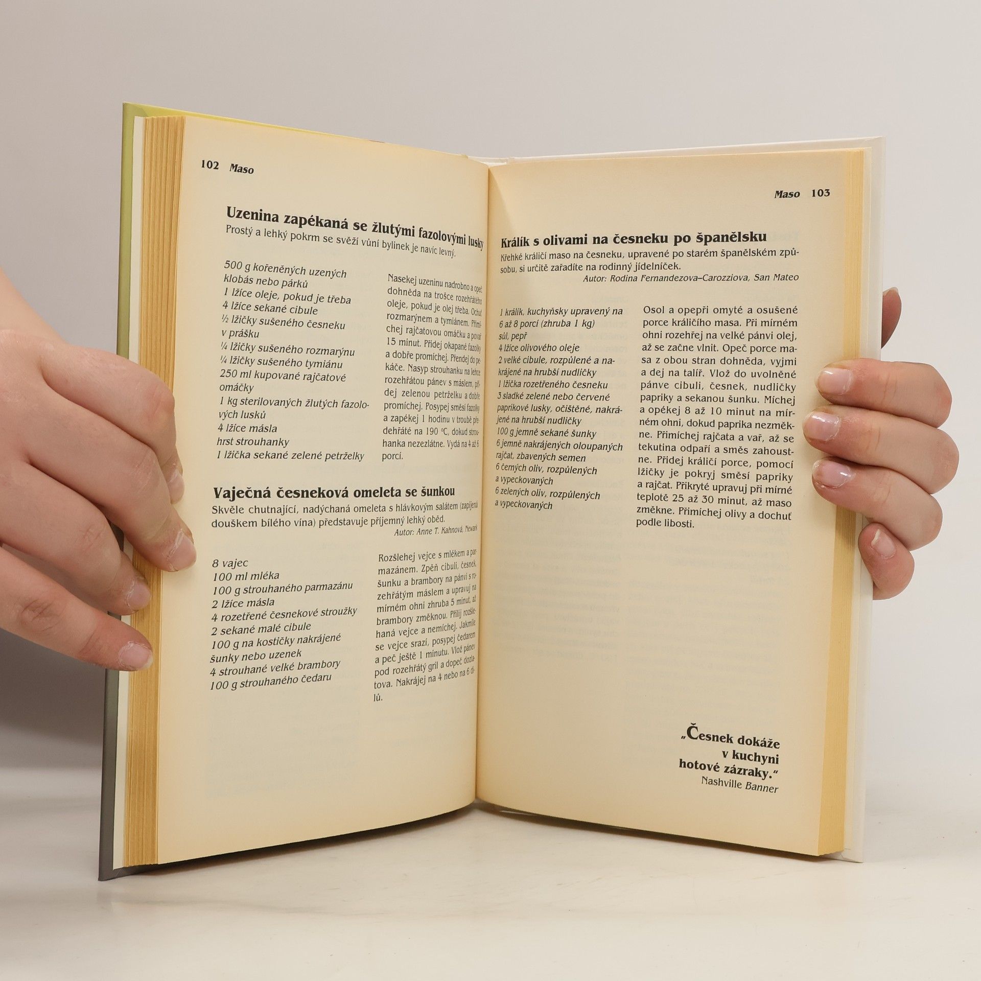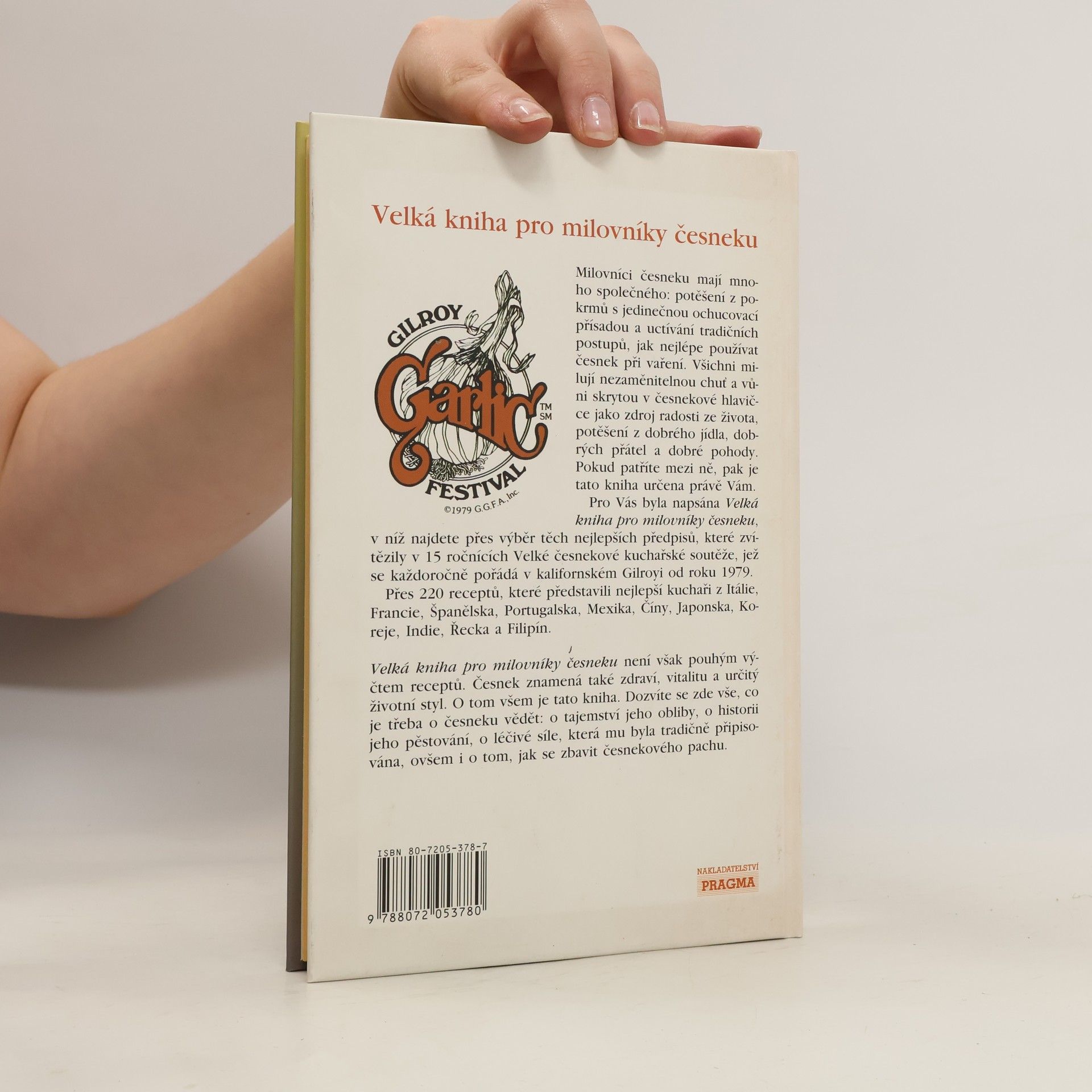 Obsahuje vítězné předpisů z 15 ročníků kuchařských soutěží v kalifornské česnekářské metropoli Gilroy. *** Více než 220 receptů od nejlepších kuchařů z Itálie, Francie, Španělska, Portugalska, Mexika, Číny, Japonska, Koreje, Indie, Řecka a Filipín, které zvítězily v patnácti ročnících Velké česnekové kuchařské soutěže, nejsou jen pouhým výčtem předpisů. Česnek znamená zdraví, vitalitu a určitý životní styl. Dozvíte se zde vše, co je třeba o česneku vědět: o tajemství jeho obliby, o historii jeho pěstování, o léčivé síle, která mu byla tradičně připisována, i tom, jak se zbavit česnekového pachu. ISBN 978-80-7205-378-0 (dotisk 2010)