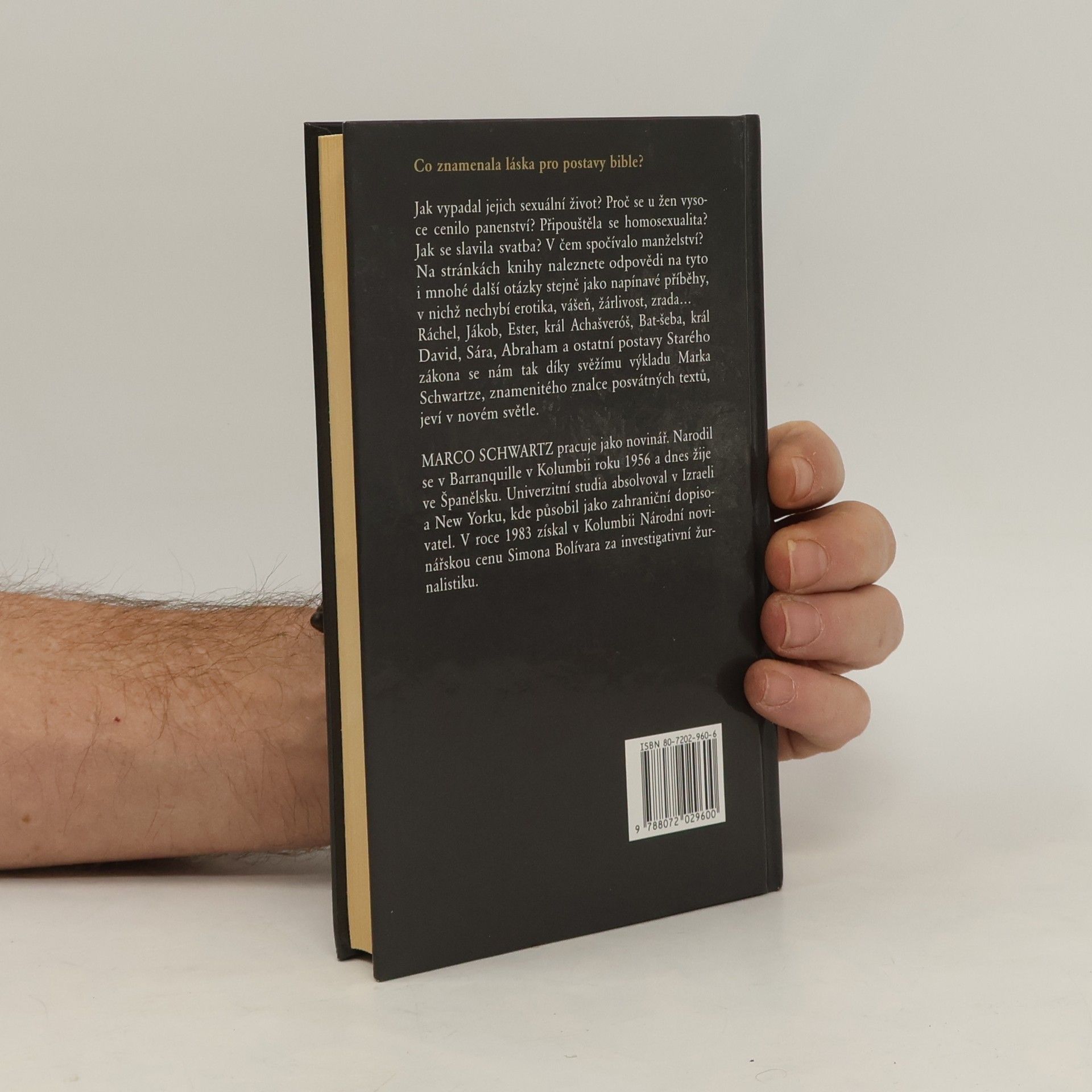 Co znamenala láska pro postavy bible? Jak vypadal jejich sexuální život? Proč se u žen vysoce cenilo panenství? Připouštěla se homosexualita? Jak se slavila svatba? V čem spočívalo manželství? Na stránkách knihy naleznete odpovědi na tyto i mnohé další otázky stejně jako napínave příběhy, v nichž nechybí erotika, vášeň, žárlivost, zrada... Ráchel, Jákob, Ester, král Achašveróš, Batšeba, král David, Sára, Abraham a ostatní postavy Starého zákona se nám tak díky svěžímu výkladu Marka Schwartze, znamenitého znalce posvátných textů, jeví v novém světle. Vydání první