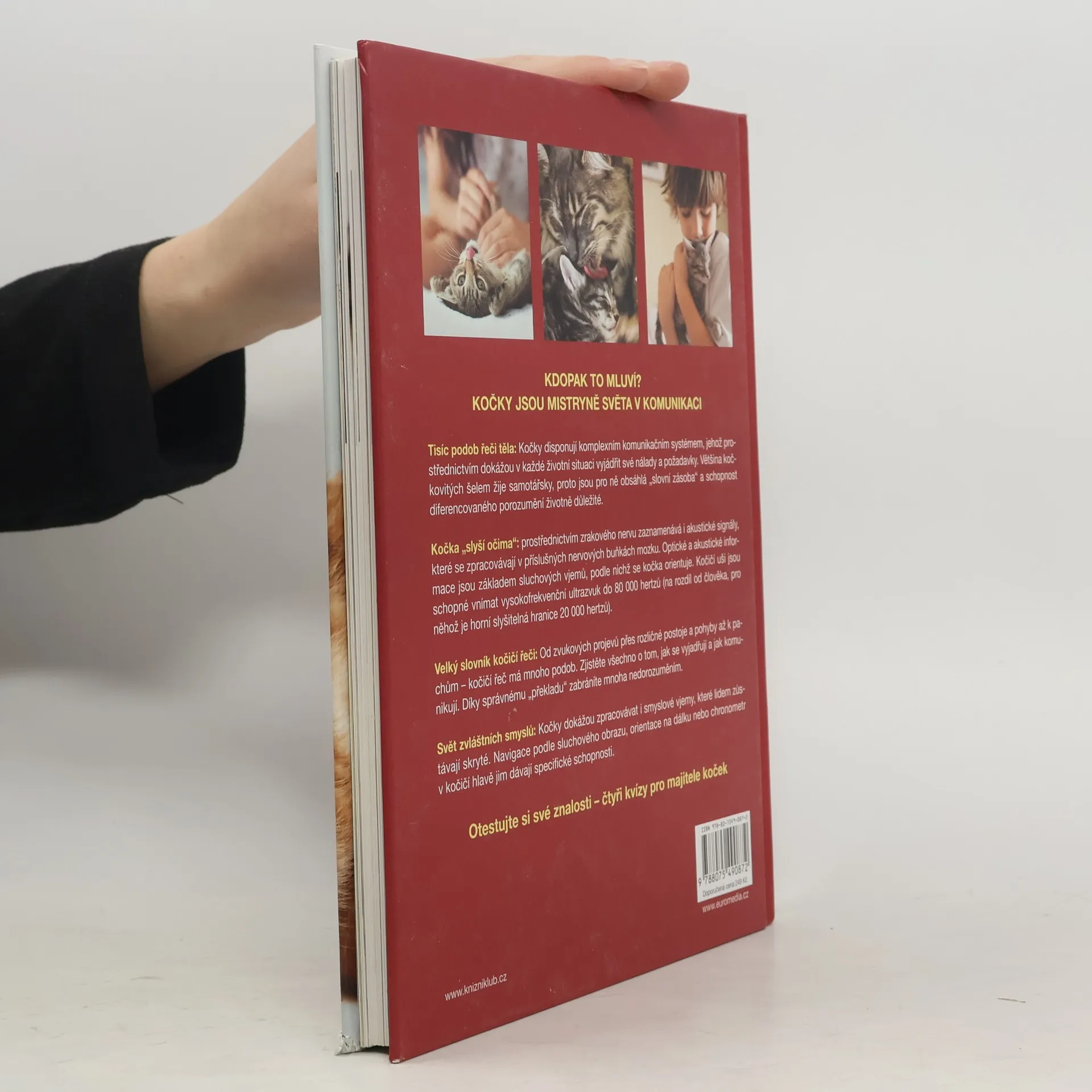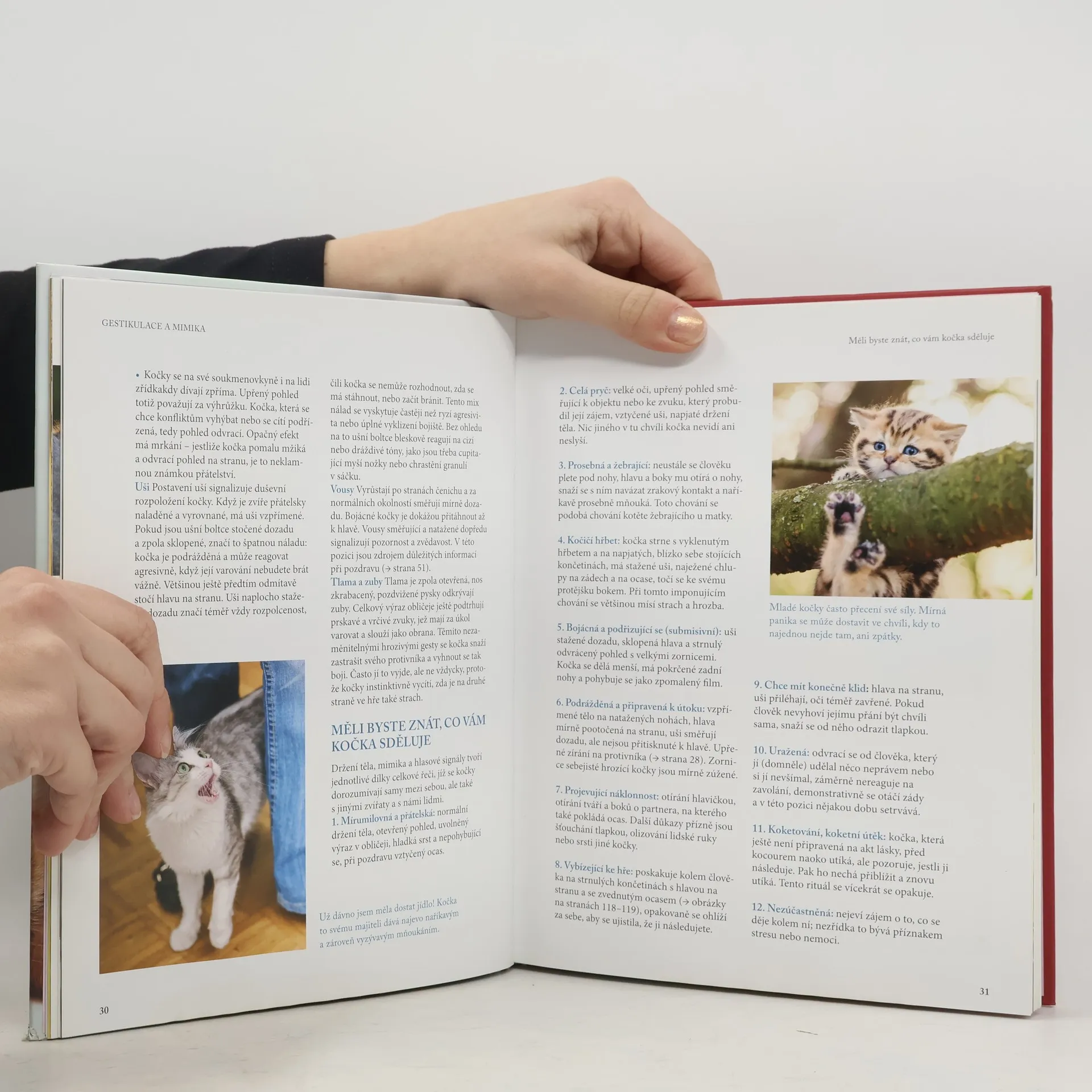 Přehledně udělaná příručka o tom, jak se krok za krokem naučit porozumět kočičí řeči. V úvodu se zabývá obecnou charakteristikou, jak kočky jako dravci vnímají okolí a jak uvažují. Rozebírá jednotlivé kočičí smysly a řeč těla. Základ knihy tvoří „slovník kočičí řeči“, v němž autor podrobně popisuje, jak s námi kočka komunikuje: pomocí očí, hřbetu, ocasu, tlapek, hlasových projevů, značkování teritoria a chování k druhým kočkám, a ukazuje, jak jednotlivé náznaky rozpoznat a správně interpretovat. Kniha obsahuje také informace o péči, vývoji, zdraví a o vztahu k dětem. Uvádí rovněž, jak si poradit s případnými nešvary, jako například když kočka loudí u stolu, ničí drápky čalounění nebo žárlí. Nechybí ani kapitola o doporučených hrách.