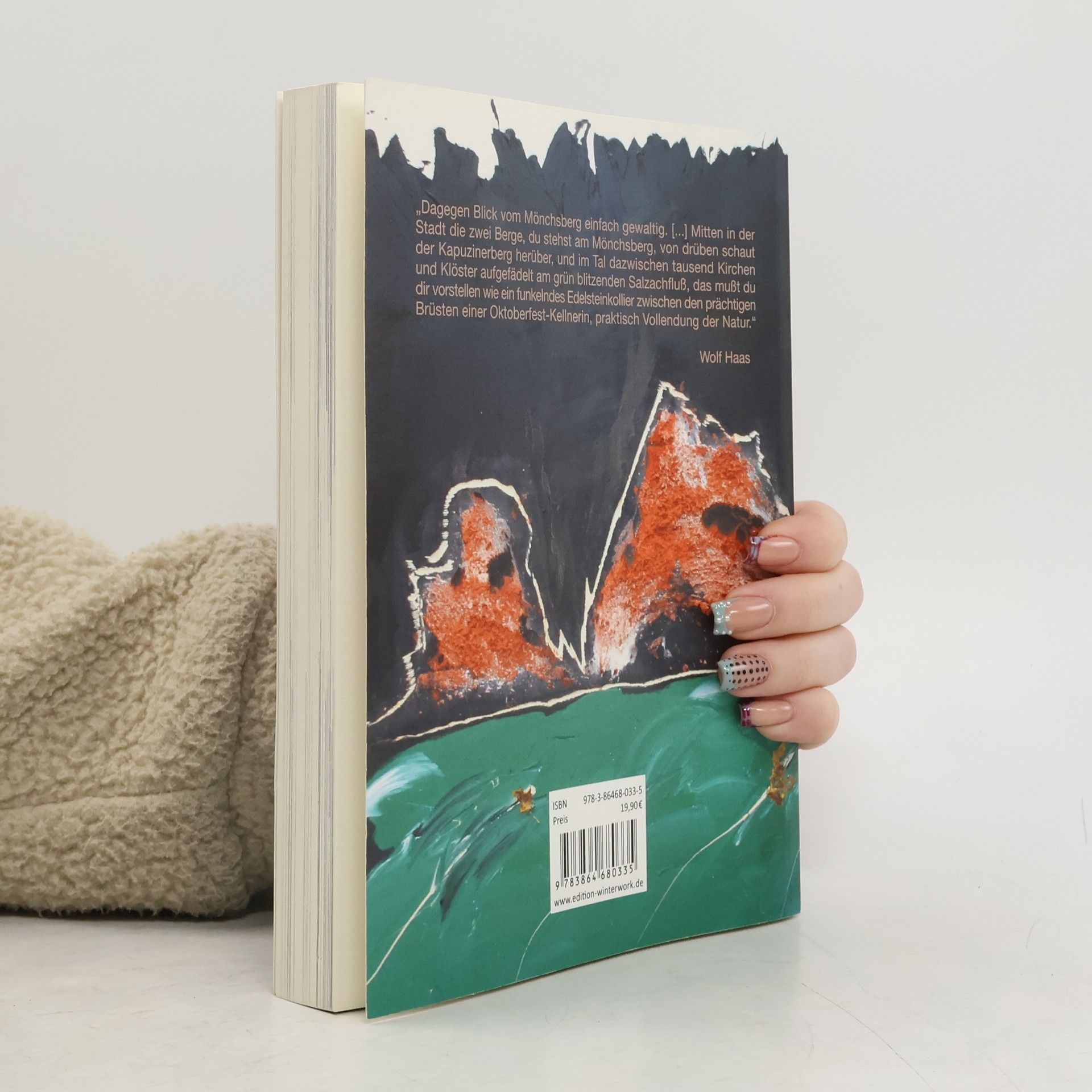 „Dagegen Blick vom Mönchsberg einfach gewaltig. [] Mitten in der Stadt die zwei Berge, du stehst am Mönchsberg, von drüben schaut der Kapuzinerberg herüber, und im Tal dazwischen tausend Kirchen und Klöster aufgefädelt am grün blitzenden Salzachfluß, das mußt du dir vorstellen wie ein funkelndes Edelsteinkollier zwischen den prächtigen Brüsten einer Oktoberfest-Kellnerin, praktisch Vollendung der Natur.“ Wolf Haas