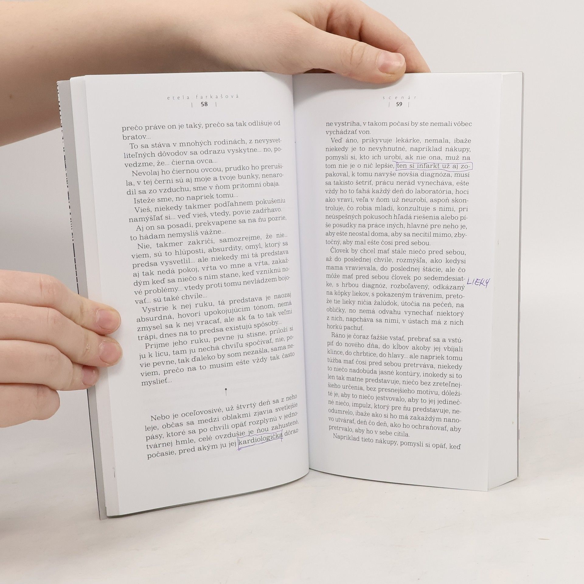 Farkašová v novej rozsiahlejšej próze Scenár rozvíja témy prítomné v jej predchádzajúcej tvorbe,do istej miery sa vracia aj k typom postáv,ktoré sú pre ňu príznačné.Tentoraz je to manželský pár,umelecká prekladateľka a prírodovedec,stretávame sa s nimi v čase,ked´prechádzajú procesom vyrovnávania sa z vlastným starnutím.Autorka tematizuje starobu/starnutie nielen ako individuálny psychický problém ....