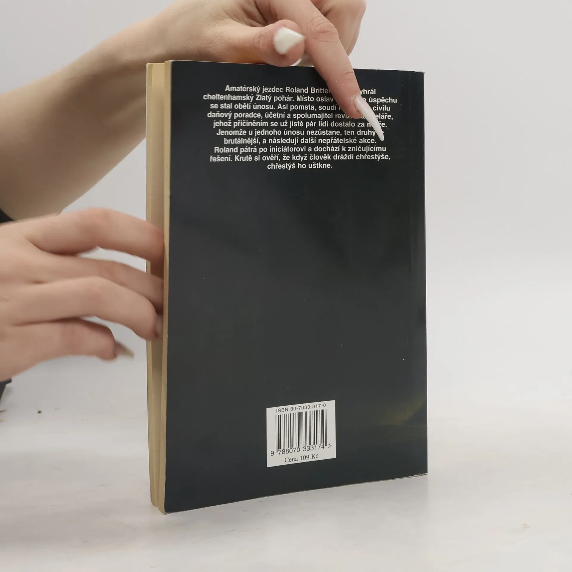 Amatérský jezdec Roland Britten právě vyhrál cheltenhamský Zlatý pohár. Místo oslav životního úspěchu se stal obětí únosu. Asi pomsta, soudí Roland, v civilu daňový poradce, účetní a spolumajitel revizní kanceláře, jehož přičiněním se už jistě pár lidí dostalo za mříže. Jenomže u jednoho únosu nezůstane, ten druhý je brutálnější, a následují další nepřátelské akce. Roland pátrá po iniciátorovi a dochází k zničujícímu řešení. Krutě si ověří, že když člověk dráždí chřestýše, chřestýš ho uštkne. Dotisk r. 2000, 2. dotisk 2005