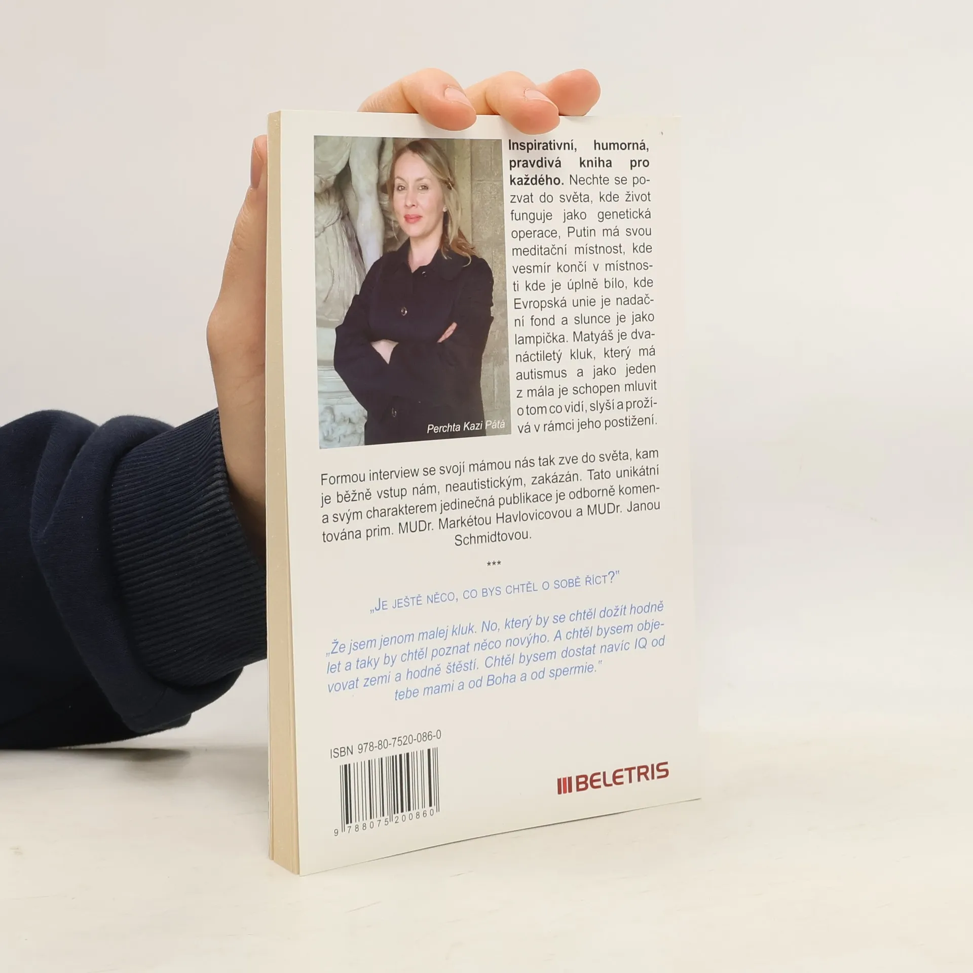 Inspirativní, humorná, pravdivá kniha pro každého. Nechte se pozvat do světa, kde život funguje jako genetická operace, Putin má svou meditační místnost, kde vesmír končí v místnosti kde je úplně bílo, kde Evropská unie je nadační fond a slunce je jako lampička. Matyáš je dvanáctiletý kluk, který má autismus a jako jeden z mála je schopen mluvit o tom co vidí, slyší a prožívá v rámci jeho postižení. Formou interview se svojí mámou nás tak zve do světa, kam je běžně vstup nám, neautistickým, zakázán. Tato unikátní a svým charakterem jedinečná publikace je odborně komentována prim. MUDr. Markétou Havlovicovou a MUDr. Janou Schmidtovou.
