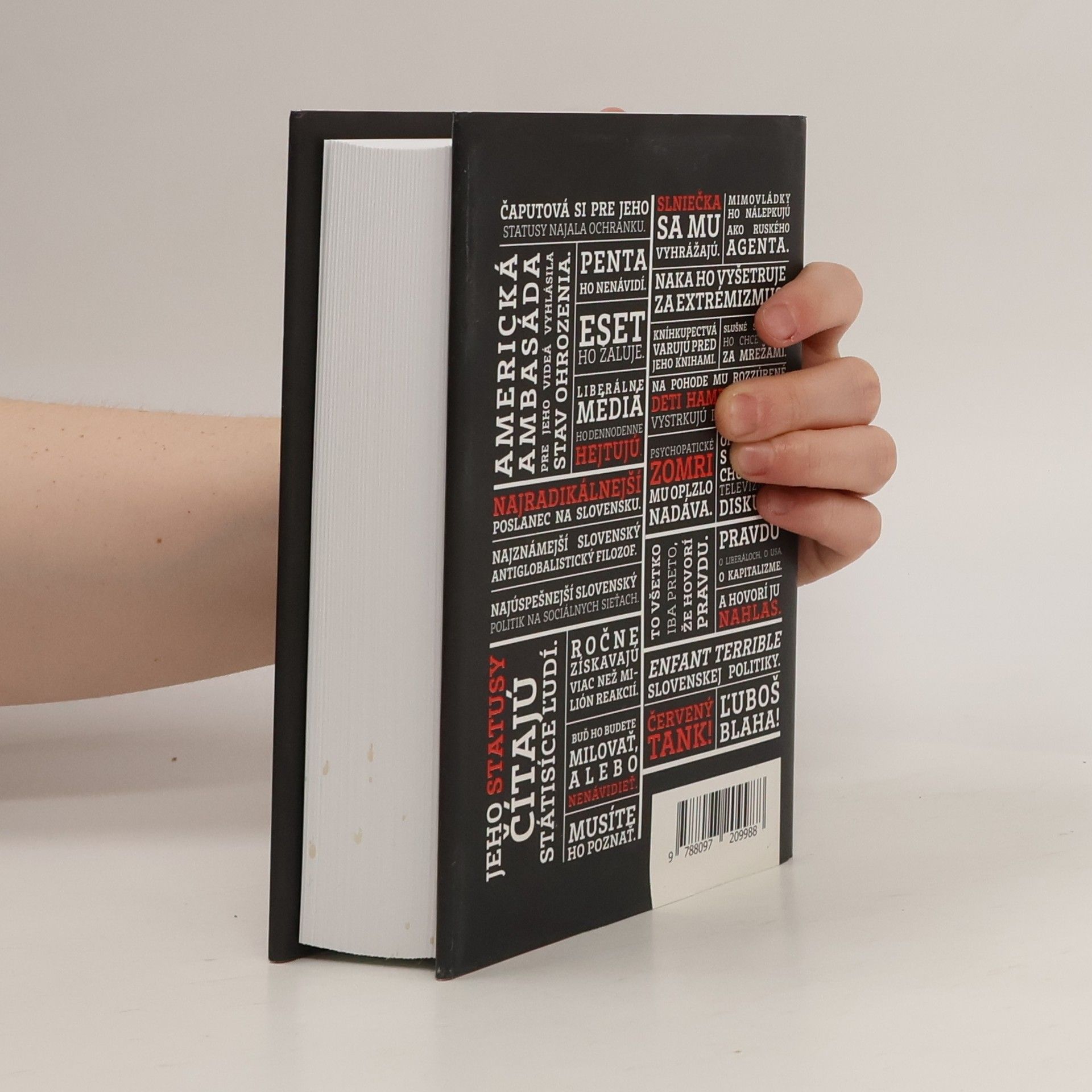 Čaputová si pre jeho statusy najala ochranku. Americká ambasáda pre jeho videá vyhlásila stav ohrozenia. PENTA ho nenávidí. ESET ho žaluje. Liberálne médiá ho dennodenne hejtujú. Slniečka sa mu vyhrážajú. Mimovládky ho nálepkujú ako ruského agenta. NAKA ho vyšetruje za extrémizmus. Kníhkupectvá varujú pred jeho knihami. Na Pohode mu rozzúrené deti hamburgerov vystrkujú prostredníky. Slušné Slovensko ho chce vidieť za mrežami. Psychopatické Zomri mu oplzlo nadáva. Opozícia sa s ním bojí chodiť do televíznych diskusií. To všetko iba preto, že hovorí pravdu. Pravdu o liberáloch, o USA, o kapitalizme. A hovorí ju nahlas. Najradikálnejší poslanec na Slovensku. Najznámejší slovenský antiglobalistický filozof. Najúspešnejší slovenský politik na sociálnych sieťach. Jeho statusy čítajú státisíce ľudí. Ročne získavajú viac než milión reakcií. Buď ho budete milovať, alebo nenávidieť. Ale musíte ho poznať. Enfant terrible slovenskej politiky. Červený tank! Ľuboš Blaha!