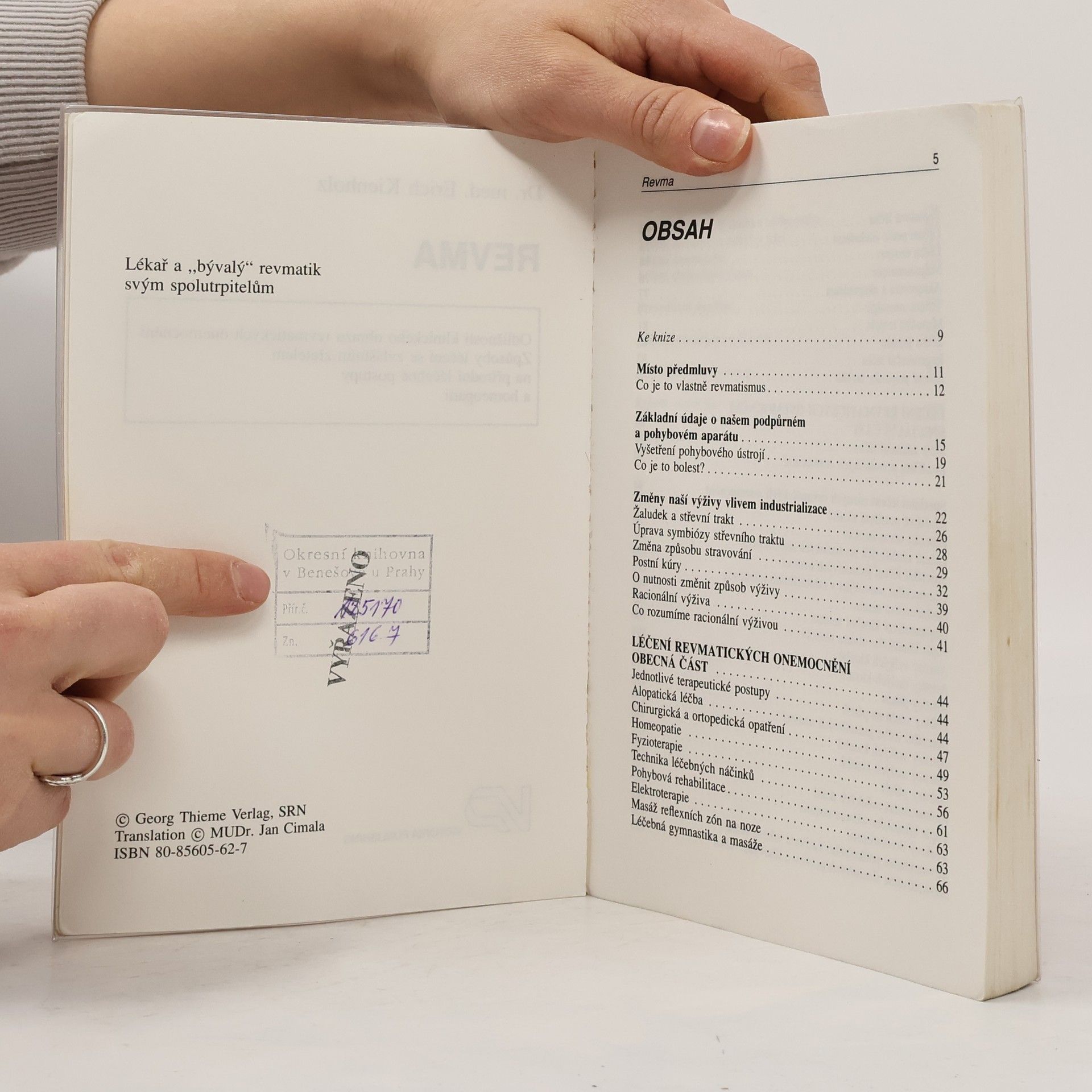 MUDr. Erich Kienholz: Revma. Odlišnosti klinického obrazu revmatických onemocnění. Způsoby léčení se zvláštním zřetelem na přírodní léčebné postupy a homeopatii. Věnování autora: "Lékař a "bývalý" revmatik svým spolutrpitelům."