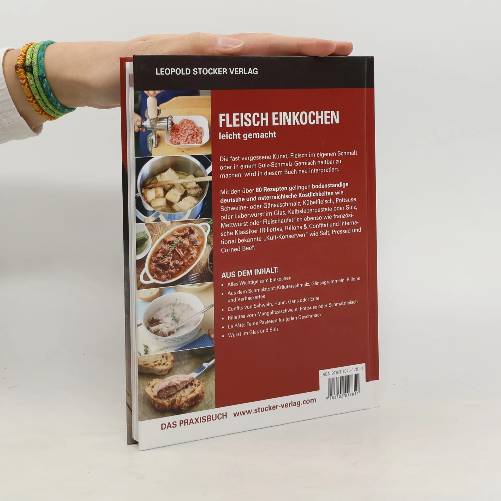 Die fast vergessene Kunst, Fleisch im eigenen Schmalz oder in einem Sulz-Schmalz-Gemisch haltbar zu machen, wird in diesem Buch neu interpretiert. Mit den rund 80 Rezepten gelingen bodenständige deutsche und österreichische Köstlichkeiten wie Schweine- oder Gänseschmalz, Kübelfleisch, Pottsuse oder Leberwurst im Glas, Kalbsleberpastete sowie Sulz, Mettwurst oder Fleischaufstrich ebenso wie französische Klassiker (Rillettes, Rillons & Confits) und international bekannte „Kult-Konserven“ wie Pressed und Corned Beef.
