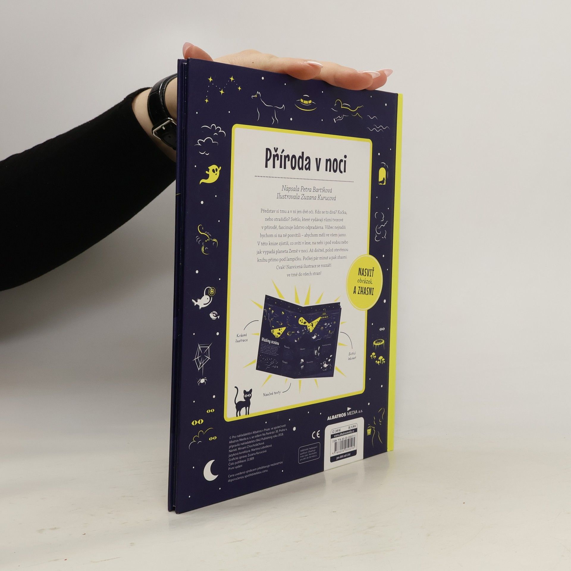 Představ si tmu a v ní jen dvě oči. Kdo se to dívá? Kočka, nebo strašidlo? Světlo, které vydávají různí tvorové v přírodě, fascinuje lidstvo odpradávna. Vůbec nejradši bychom si na ně posvítili – abychom měli ve všem jasno. V této knize zjistíš, co svítí v lese, na nebi i pod vodou nebo jak vypadá planeta Země v noci. Až dočteš, polož otevřenou knihu přímo pod lampičku. Počkej pár minut a pak zhasni. Cvak! Nasvícená ilustrace se rozzáří ve tmě do všech stran!