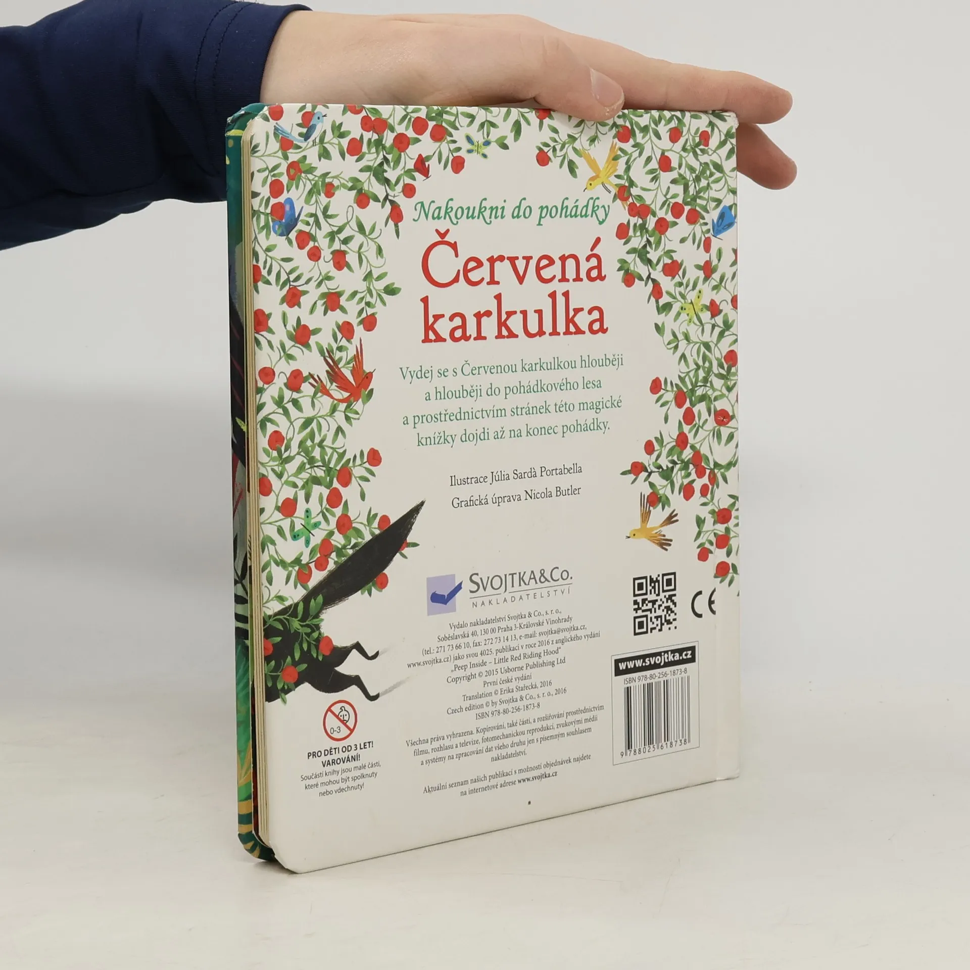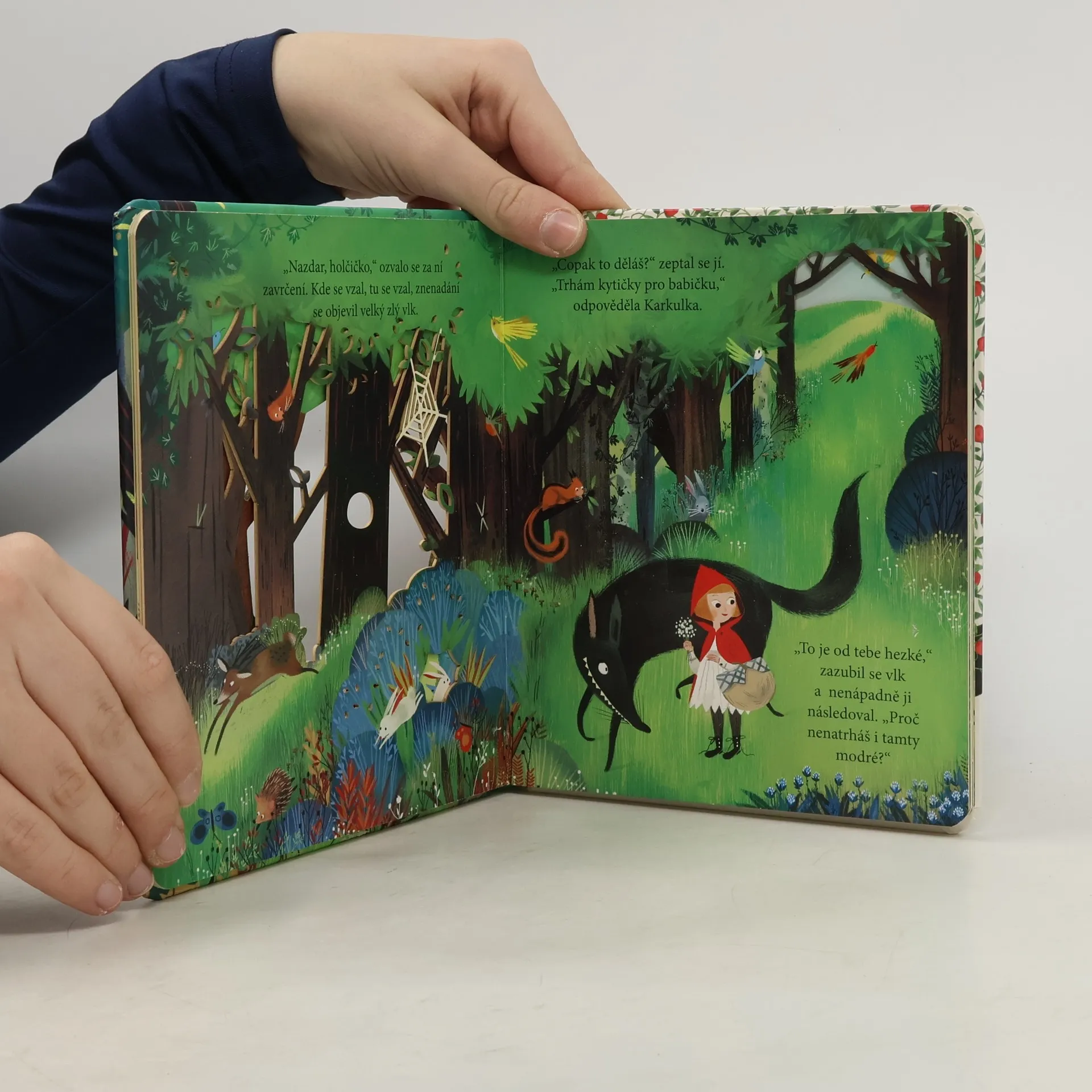 V této půvabně ilustrované knížce najdete klasickou a dětmi oblíbenou pohádku o Červené karkulce. Vyprávění o děvčátku, které se vydalo cestou necestou lesem za babičkou, vám zpestří mnoho otevíracích okének a průhledů v jednotlivých stránkách, které jitří dětskou fantazii tak, že se nemohou dočkat, až otočíte na další stránku. Kdopak to vykukuje z dutiny stromu? Kdo se ukrývá za keřem? Kdo bydlí v domečku uprostřed černého lesa? Co to má vlk v břiše? Vydejte se s Červenou karkulkou do lesa, nakoukněte do pohádky a postupně otevírejte všechna okénka. Jak to všechno dopadne? To se dozvíte na konci pohádky.