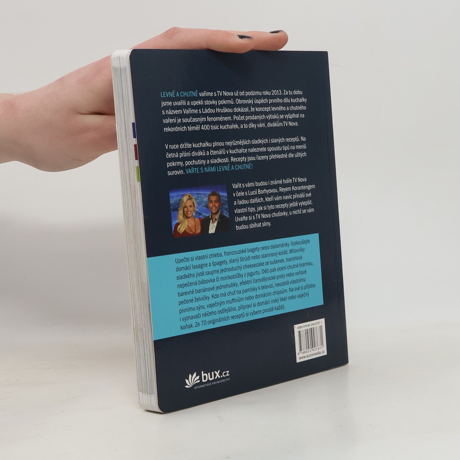 Vařit levně a chutně, to je současný trend všech fanoušků oblíbené rubriky televize Nova, ve které se připravují unikátní recepty za pár korun. Jednoduchý postup, časová nenáročnost a chutný výsledek – to sice zní jako nedostižný ideál, ale s nápaditými pokrmy z této kuchařky to půjde samo! Upečte si vlastní chleba, francouzské bagety nebo dalamánky. Vyzkoušejte domácí lasagne a špagety, slaný štrúdl nebo slaninový koláč. Milovníky sladkého jistě zaujme jednoduchý cheesecake ze sušenek, tvarohová nepečená bábovka či minikoblížky z jogurtu. Děti pak ocení chutné tiramisu, barevné banánové jednohubky, efektní čarodějnické prsty nebo voňavé pečené želvičky. Kdo má chuť na pamlsky k televizi, neodolá vlastnímu pivnímu sýru, vaječným muffinům nebo domácím chipsům. Na své si přijdou i vyznavači něčeho ostřejšího, připraví si domácí irský likér nebo vaječný koňak. Ze 70 originálních receptů si vybere prostě každý. Vařit s vámi budou i známé tváře TV Nova v čele s Lucií Borhyovou, Reyem Korantengem a řadou dalších, kteří vám navíc přináší své vlastní tipy, jak si tyto recepty ještě vylepšit. Uvařte si s TV Nova chuťovky, u nichž se vám budou sbíhat sliny.