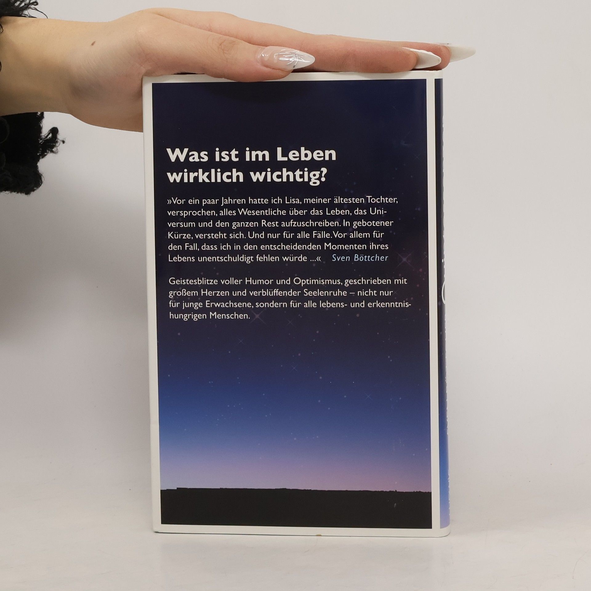 Was ist im Leben wirklich wichtig? Vor einigen Jahren versprach der Autor, alles Wesentliche über das Leben, das Universum und den ganzen Rest für seine älteste Tochter Lisa aufzuschreiben – in gebotener Kürze und für den Fall, dass er in entscheidenden Momenten ihres Lebens fehlen würde. Mit Humor und Optimismus, geschrieben aus vollem Herzen und mit bemerkenswerter Seelenruhe, richtet sich der Text nicht nur an junge Erwachsene, sondern an alle, die nach Erkenntnis streben. Nach einer Diagnose von Multipler Sklerose und der Aussicht auf einen schweren Krankheitsverlauf beschließt der Autor, die verbleibende Zeit zu nutzen, um seinen drei Töchtern schriftlich das mitzugeben, was er möglicherweise nicht mehr persönlich sagen kann. Die gängigen Sinnsprüche sucht man vergeblich, stattdessen bietet er unkonventionelle Einsichten wie „Geld ist Zeit“, „Sei unnatürlich“ oder „Heirate dich selbst“. In rund 50 kurzen Texten entfaltet er eine umfassende Philosophie der Lebenskunst, die das Herz und den Verstand aller berührt, die über den Kosmos, die Liebe, das Leben und den Tod nachdenken.