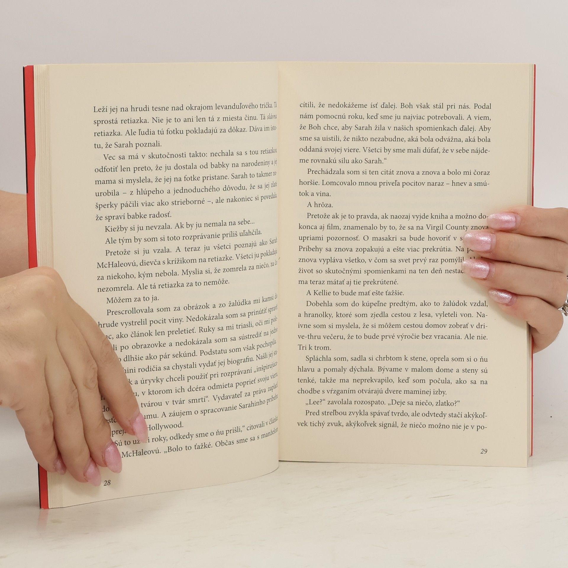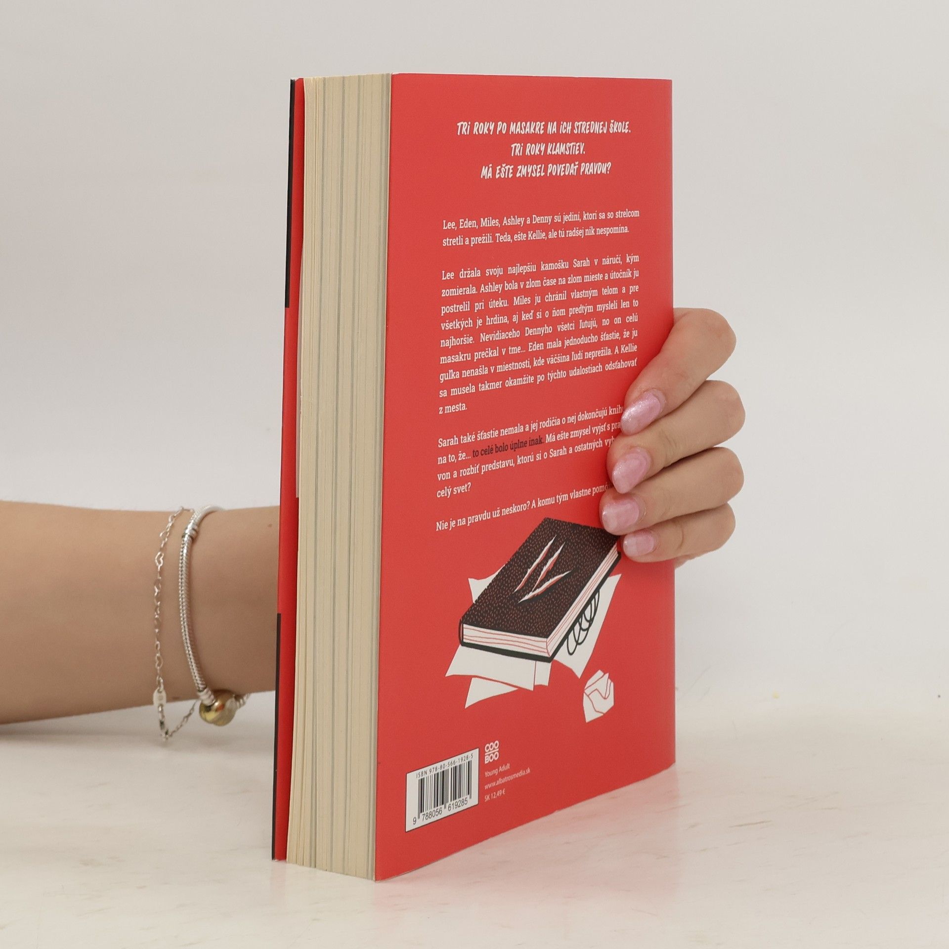 Tri roky po masakre na ich strednej škole. Tri roky klamstiev. Má ešte zmysel povedať pravdu? Lee, Eden, Miles, Ashley a Denny sú jediní, ktorí sa so strelcom stretli a prežili. Teda, ešte Kellie, ale tú radšej nik nespomína. Lee držala svoju najlepšiu kamošku Sarah v náručí, kým zomierala. Ashley bola v zlom čase na zlom mieste a útočník ju postrelil pri úteku. Miles ju chránil vlastným telom a pre všetkých je hrdina, aj keď si o ňom predtým mysleli len to najhoršie. Nevidiaceho Dennyho všetci ľutujú, no on celú masakru prečkal v tme... Eden mala jednoducho šťastie, že ju guľka nenašla v miestnosti, kde väčšina ľudí neprežila. A Kellie sa musela takmer okamžite po týchto udalostiach odsťahovať z mesta. Sarah také šťastie nemala a jej rodičia o nej dokončujú knihu, až na to, že... to celé bolo úplne inak. Má ešte zmysel vyjsť s pravdou von a rozbiť predstavu, ktorú si o Sarah a ostatných vybudoval celý svet? Nie je na pravdu už neskoro? A komu tým vlastne pomôžu? Výnimočný príbeh od autorky románu The Duff. To pravé pre fanúšikov kníh Jeden z nás klame, Farby smútku a Mŕtve dievča neklame.