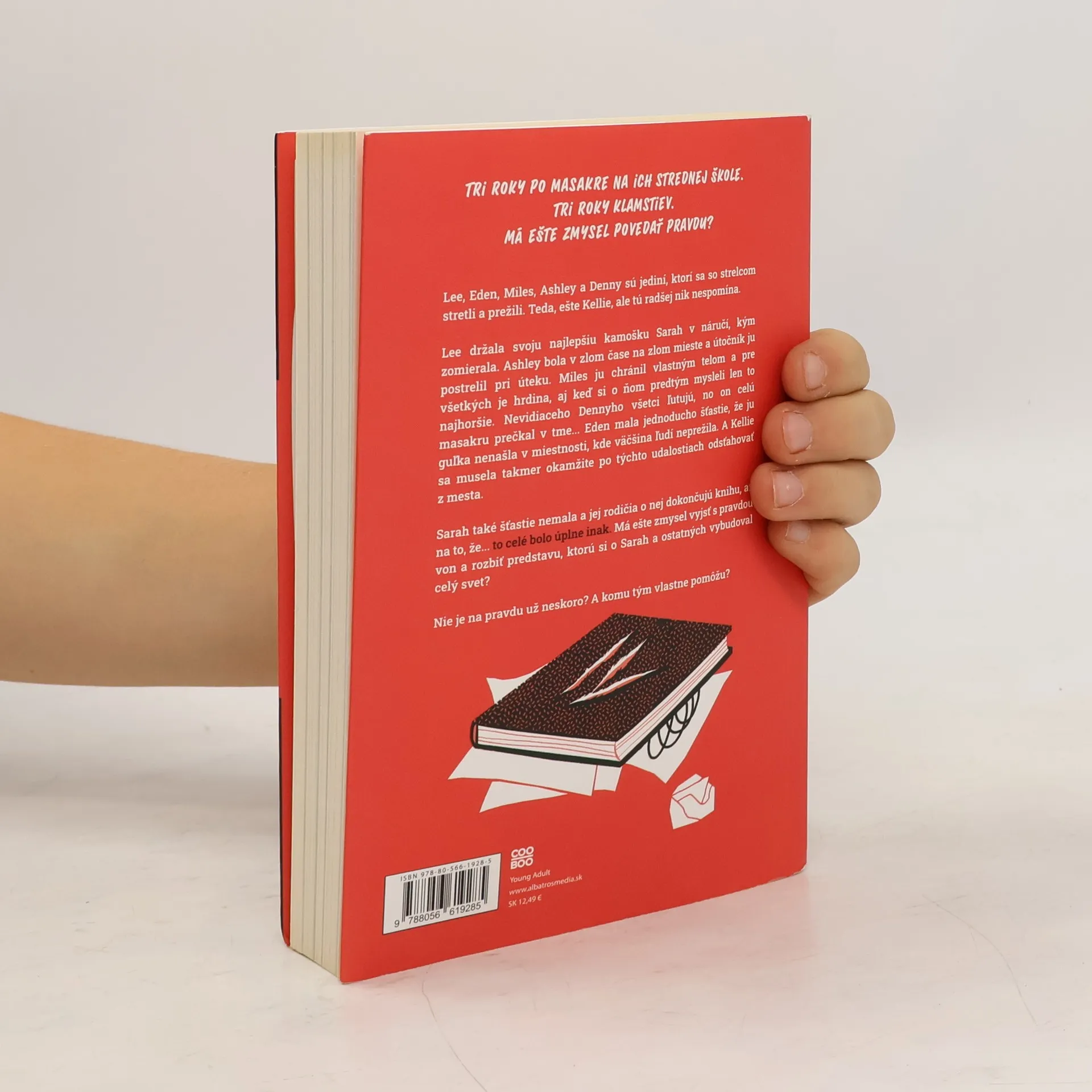 Tri roky po masakre na ich strednej škole. Tri roky klamstiev. Má ešte zmysel povedať pravdu? Lee, Eden, Miles, Ashley a Denny sú jediní, ktorí sa so strelcom stretli a prežili. Teda, ešte Kellie, ale tú radšej nik nespomína. Lee držala svoju najlepšiu kamošku Sarah v náručí, kým zomierala. Ashley bola v zlom čase na zlom mieste a útočník ju postrelil pri úteku. Miles ju chránil vlastným telom a pre všetkých je hrdina, aj keď si o ňom predtým mysleli len to najhoršie. Nevidiaceho Dennyho všetci ľutujú, no on celú masakru prečkal v tme... Eden mala jednoducho šťastie, že ju guľka nenašla v miestnosti, kde väčšina ľudí neprežila. A Kellie sa musela takmer okamžite po týchto udalostiach odsťahovať z mesta. Sarah také šťastie nemala a jej rodičia o nej dokončujú knihu, až na to, že... to celé bolo úplne inak. Má ešte zmysel vyjsť s pravdou von a rozbiť predstavu, ktorú si o Sarah a ostatných vybudoval celý svet? Nie je na pravdu už neskoro? A komu tým vlastne pomôžu? Výnimočný príbeh od autorky románu The Duff. To pravé pre fanúšikov kníh Jeden z nás klame, Farby smútku a Mŕtve dievča neklame.