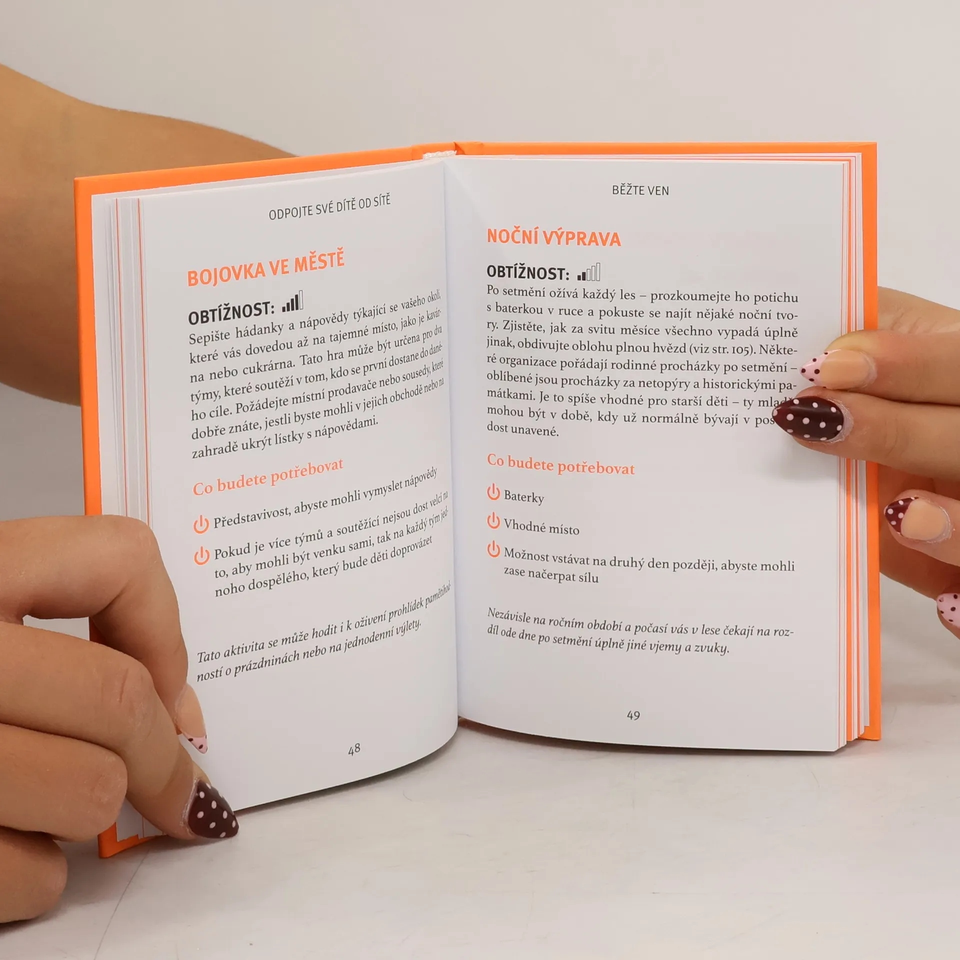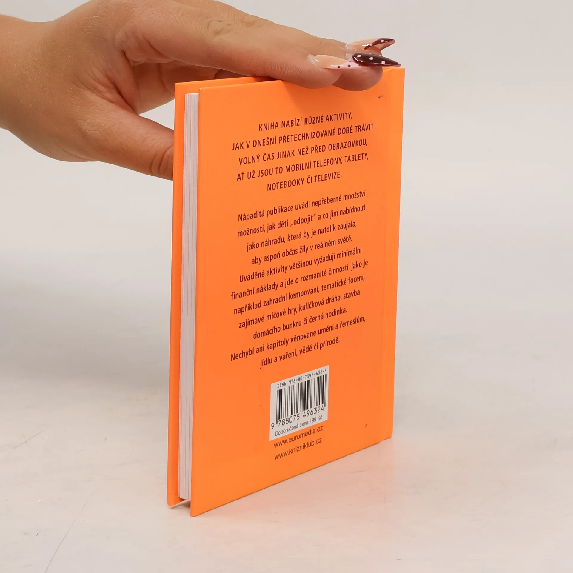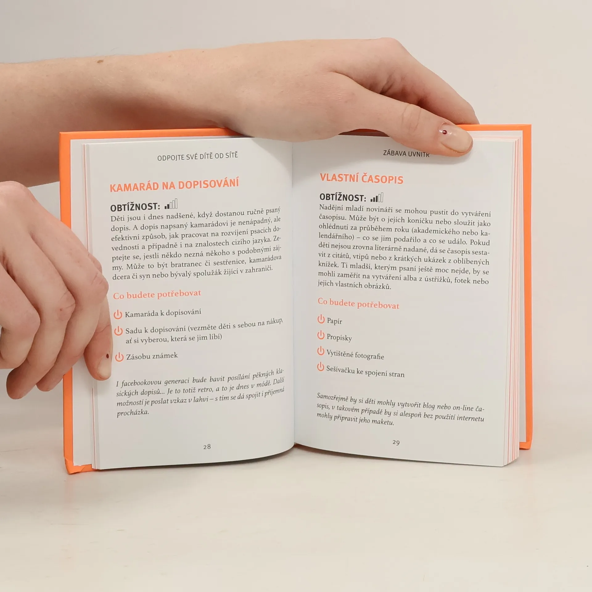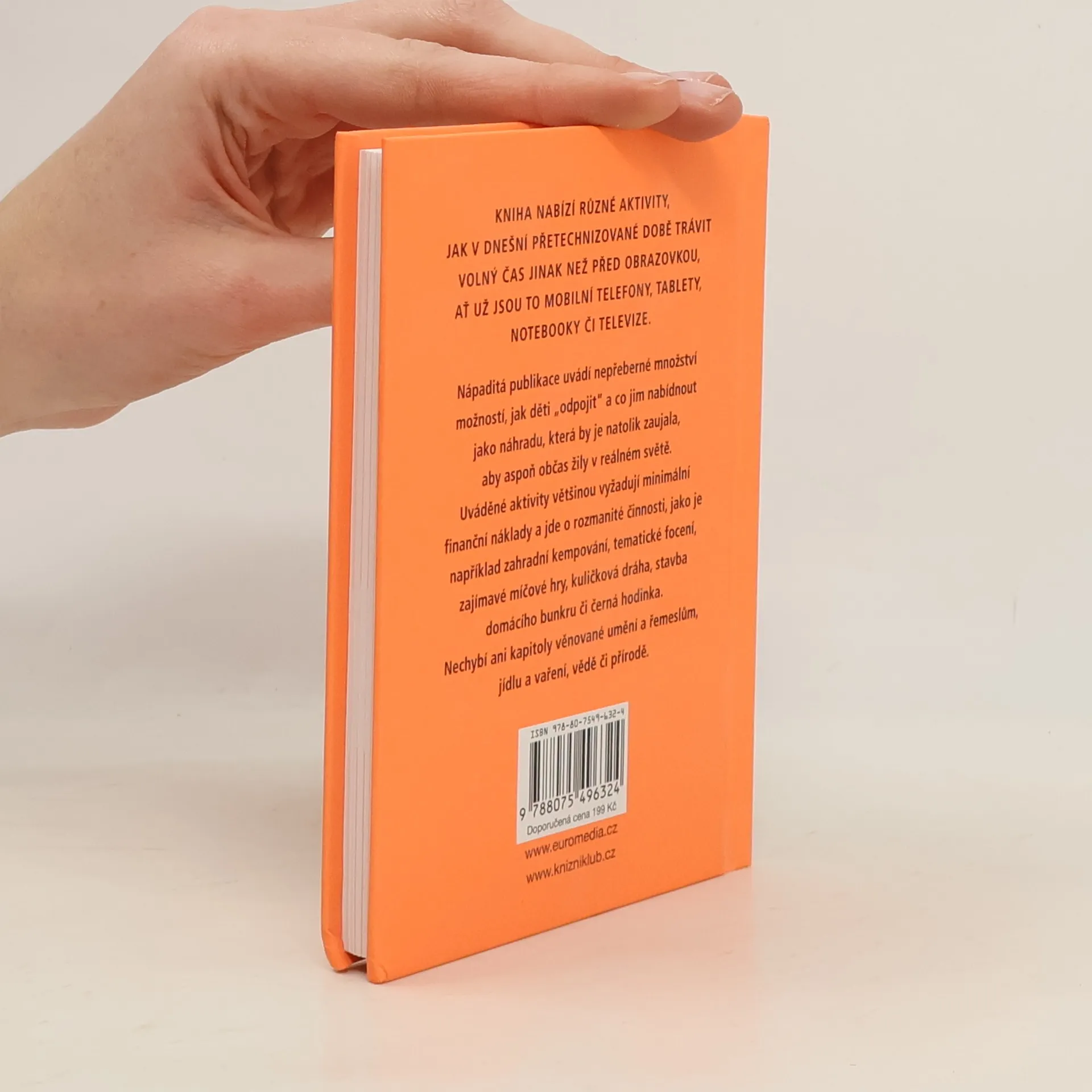 Kniha nabízí různé aktivity, jak v dnešní přetechnizované době trávit volný čas jinak než před obrazovkou, ať už jsou to mobilní telefony, tablety, notebooky či televize. Uvádí nepřeberné množství možností, jak děti „odpojit“ a co jim nabídnout jako náhradu, která by je natolik zaujala, aby aspoň občas žily v reálném světě. Uváděné aktivity vyžadují minimální finanční náklady a jde o rozmanité činnosti, například zahradní kempování, tematické focení, zajímavé míčové hry, závody papírových vlaštovek, večerní černá hodinka při vypnuté elektrice, nechybí ani kapitoly věnované uměn a řemeslům, jídlu a vaření, vědě či přírodě.