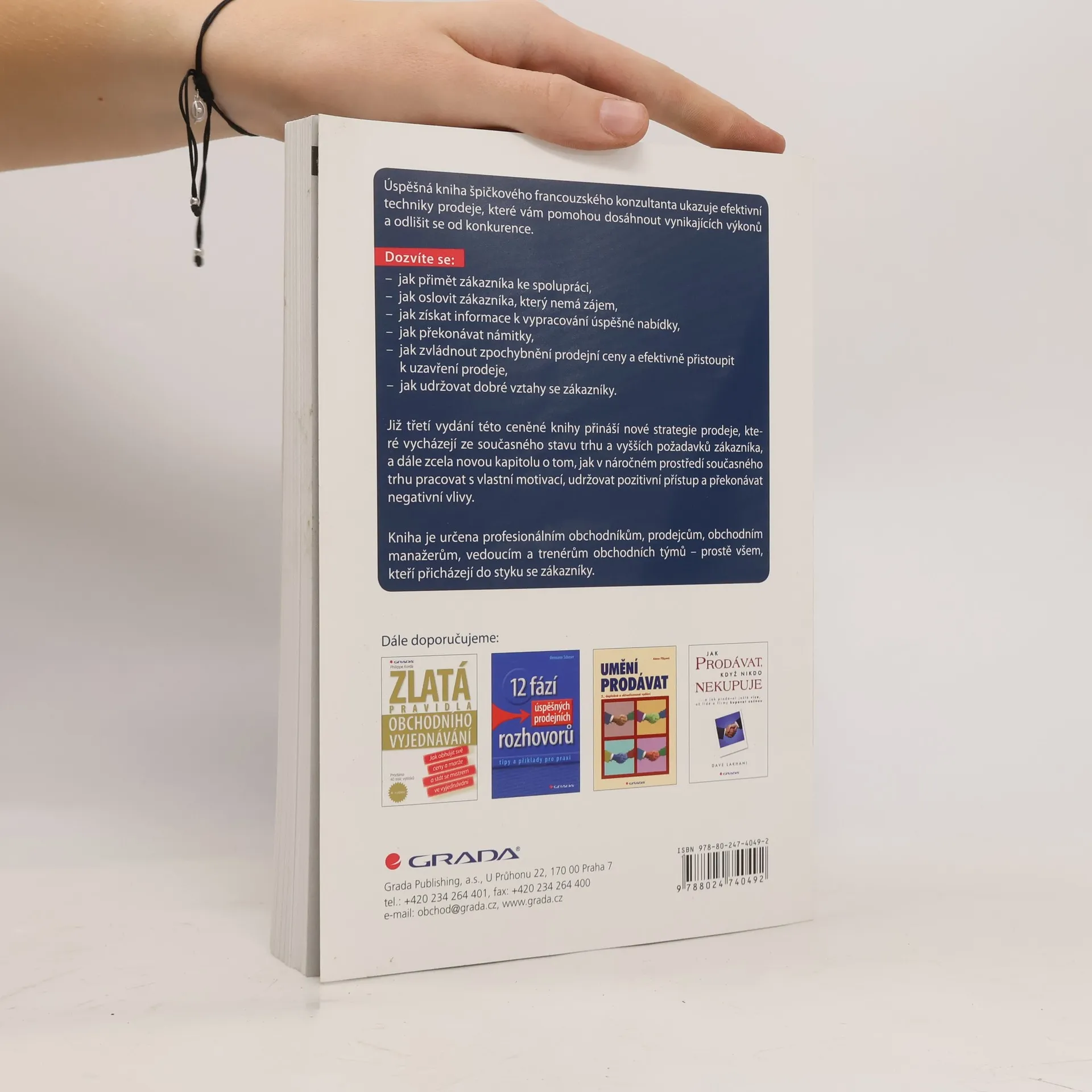 Úspěšná kniha špičkového francouzského konzultanta ukazuje efektivní techniky prodeje, které vám pomohou dosáhnout vynikajících výkonů a odlišit se od konkurence. Dozvíte se, jak přimět zákazníka ke spolupráci, jak oslovit zákazníka, který nemá zájem, jak získat informace k vypracování úspěšné nabídky, jak překonávat námitky, jak zvládnout zpochybnění prodejní ceny a efektivně přistoupit k uzavření prodeje, jak udržovat dobré vztahy se zákazníky. Již třetí vydání této ceněné knihy přináší nové strategie prodeje, které vycházejí ze současného stavu trhu a vyšších požadavků zákazníka, a dále zcela novou kapitolu o tom, jak v náročném prostředí současného trhu pracovat s vlastní motivací, udržovat pozitivní přístup a překonávat negativní vlivy. Kniha je určena profesionálním obchodníkům, prodejcům, obchodním manažerům, vedoucím a trenérům obchodních týmů - prostě všem, kteří přicházejí do styku se zákazníky.
