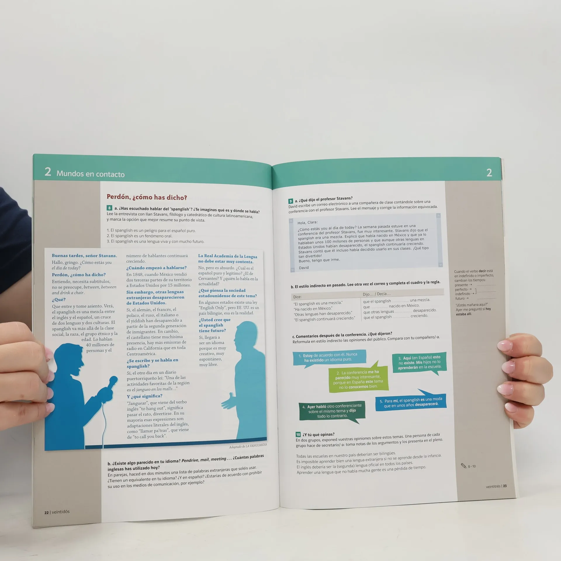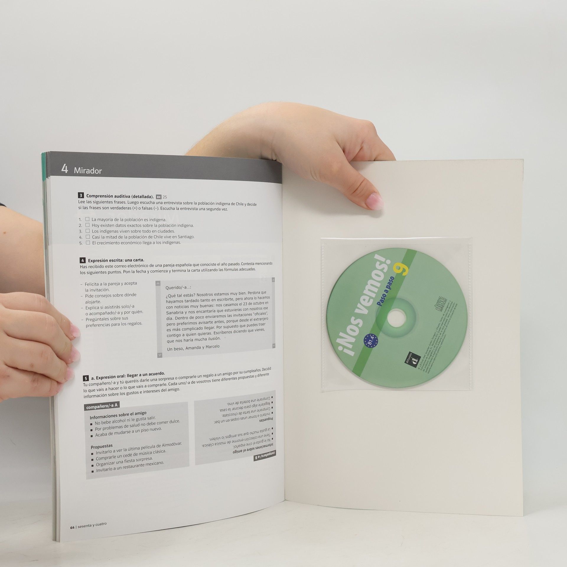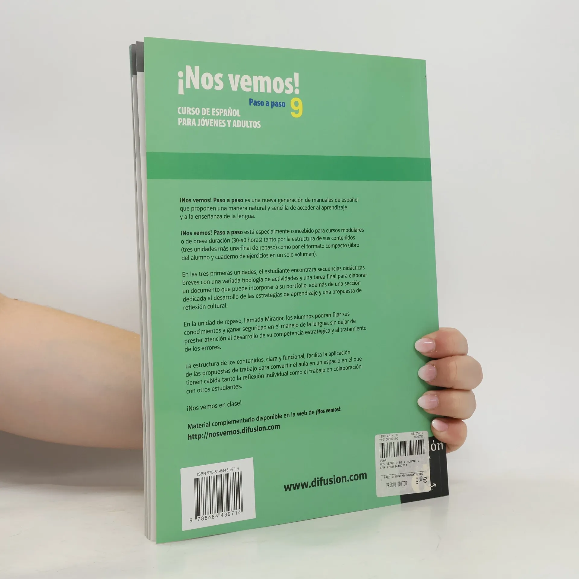 ¡Nos vemos! Paso a paso 9 está especialmente concebido para cursos modulares o de breve duración (30-40 horas) tanto por la estructura de sus contenidos (tres unidades más una final de repaso) como por el formato compacto (libro del alumno y cuaderno de ejercicios en un solo volumen). En las tres primeras unidades, el estudiante encontrará secuencias didácticas breves con una variada tipología de actividades y una tarea final para elaborar un documento que puede incorporar a su portfolio, además de una sección dedicada al desarrollo de las estrategias de aprendizaje y una propuesta de reflexión cultural. En la unidad de repaso, llamada Mirador, los alumnos podrán fijar sus conocimientos y ganar seguridad en el manejo de la lengua, sin dejar de prestar atención al desarrollo de su competencia estratégica y al tratamiento de los errores. La estructura de los contenidos, clara y funcional, facilita la aplicación de las propuestas de trabajo para convertir el aula en un espacio en el que tienen cabida tanto la reflexión individual como el trabajo en colaboración con otros estudiantes.