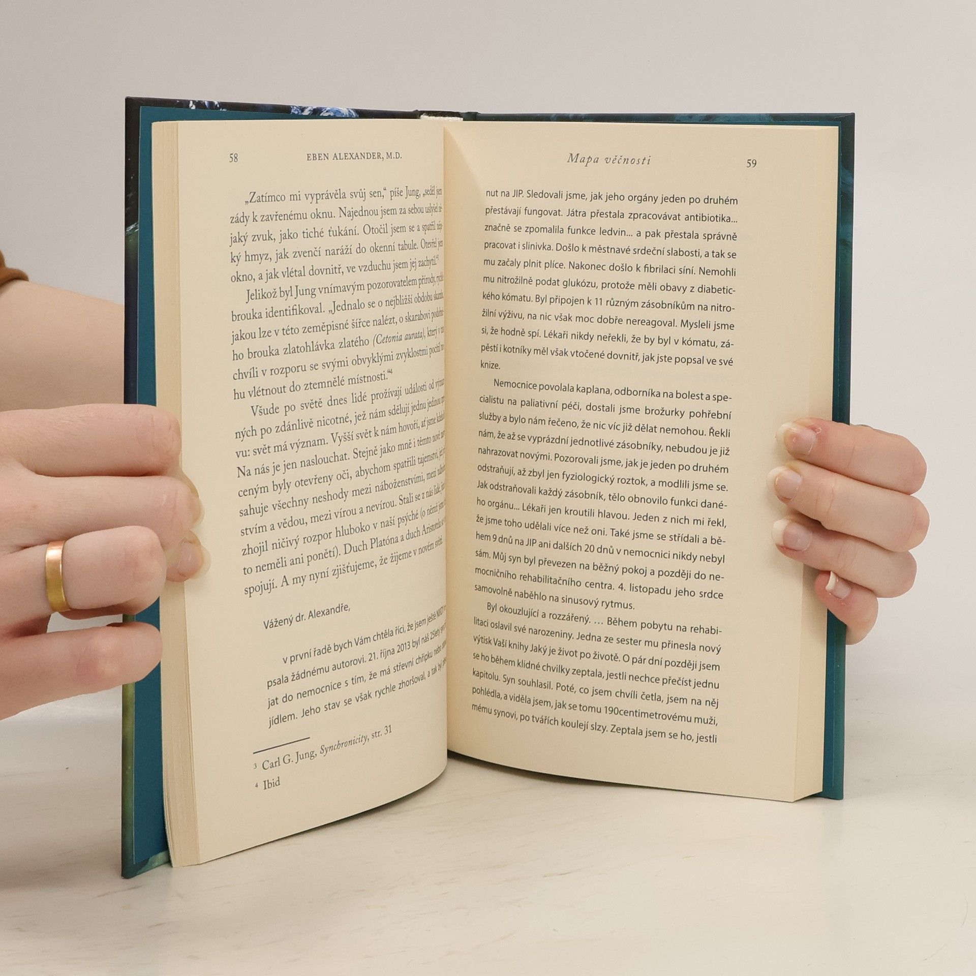Život po životě existuje. Smělé tvrzení potvrzuje věda, náboženství i běžní lidé. Dr. Eben Alexander v druhé knize představuje realitu věčnosti a odhaluje naši pravou, duchovní identitu. Vychází z tvrzení starověkých mudrců, současných vědců i běžných lidí, kteří měli hluboké duchovní zážitky. Když vyšla kniha Jaký je život po životě, čtenáři ho kontaktovali, aby mu řekli, že jeho zážitek na prahu smrti se nemohl odehrát tak, jak ho popsal. Mnozí se mu však svěřili s tím, že příběh je hluboce zasáhl. Uvědomil si, že když se podělil s lidmi o svůj zážitek, uvěřili v to, co věděli už naši starověcí předkové: život – a vesmír – není omezený na jedinou pozemskou existenci. Dr. Alexander se setkal s tisíci jednotlivci, které jeho příběh silně ovlivnil. Kromě toho zkoumal tvrzení světových náboženských tradic a různých filozofů, že duše přežije smrt. Velmi ho překvapilo, že hlasy z minulosti často harmonizují s tím, co mu říkají současníci. V Mapě věčnosti se dělí se čtenáři o některé příběhy, které mu lidé vyprávěli, a dává je do souvislosti s tím, co o putování duše hovoří světové duchovní tradice.