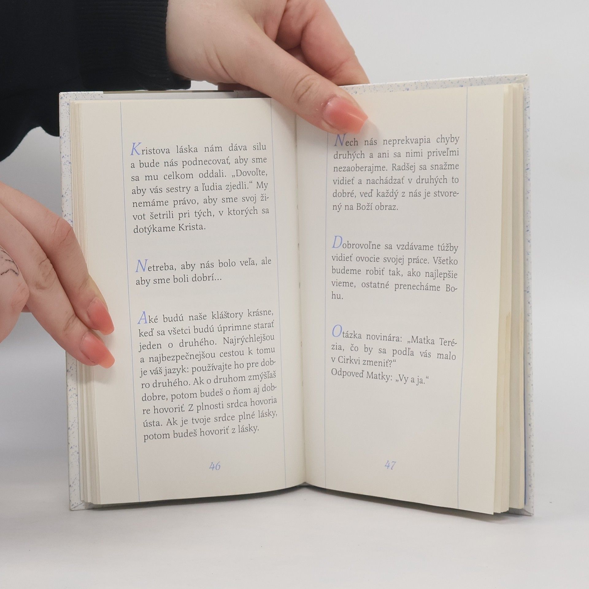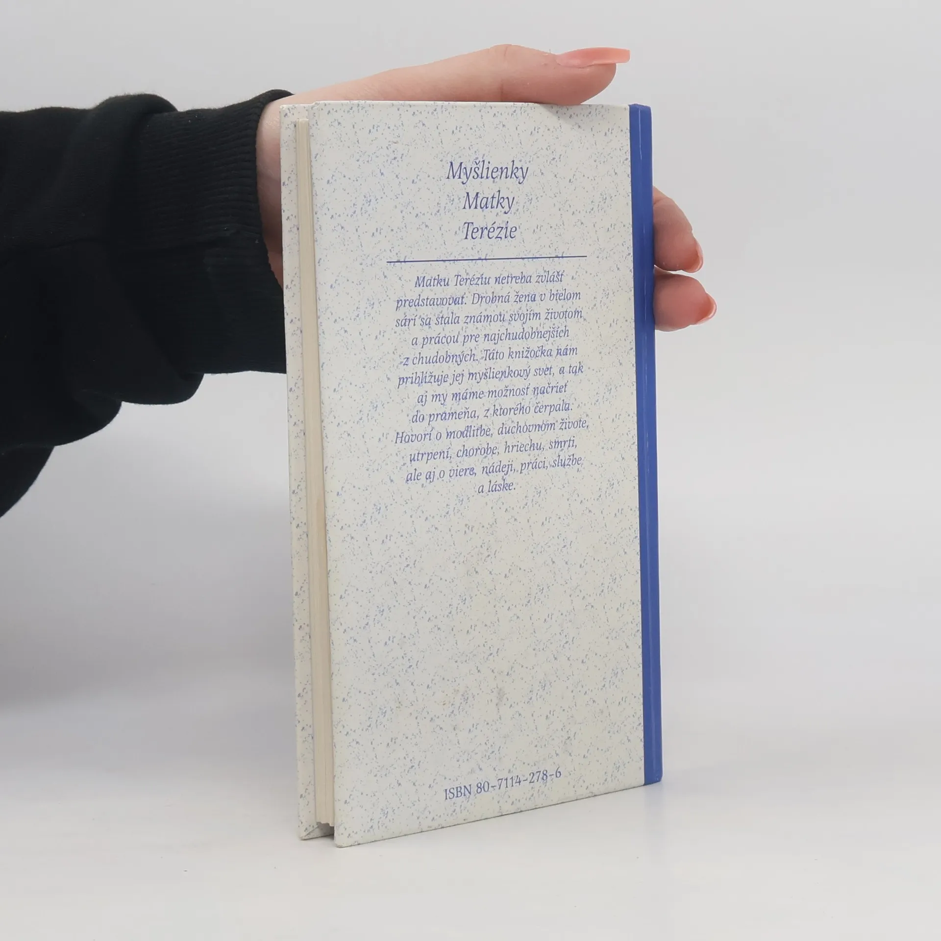 Kniha myšlienok Matky Terézie nám približuje hĺbku vnútorného života tejto nezvyčajnej ženy, podľa ktorej svätosť nie je len výsadou niektorých, ale jednoduchou povinnosťou nás všetkých. Matka Terézia sa stala v dnešnom svete hlasom, ktorý sa dvíha na obranu dôstojnosti človeka, práva na život. Je to hlas plný účasti na biede tohto sveta, plný nádeje, optimizmu a viery v dobro. Jej slová o láske k blížnym, o duchovnom živote, práci, službe najjednoduchším, o chudobe, hriechu, radosti, pokore a dôvere vyvierajú z jej srdca, plného lásky ku Kristovi. Povzbuďte sa jej výrokmi a nechajte sa inšpirovať k radostnejšiemu životu viery a lásky k blížnym. Kniha je vhodným darčekom pre každého, koho chcete potešiť a povzbudiť.
