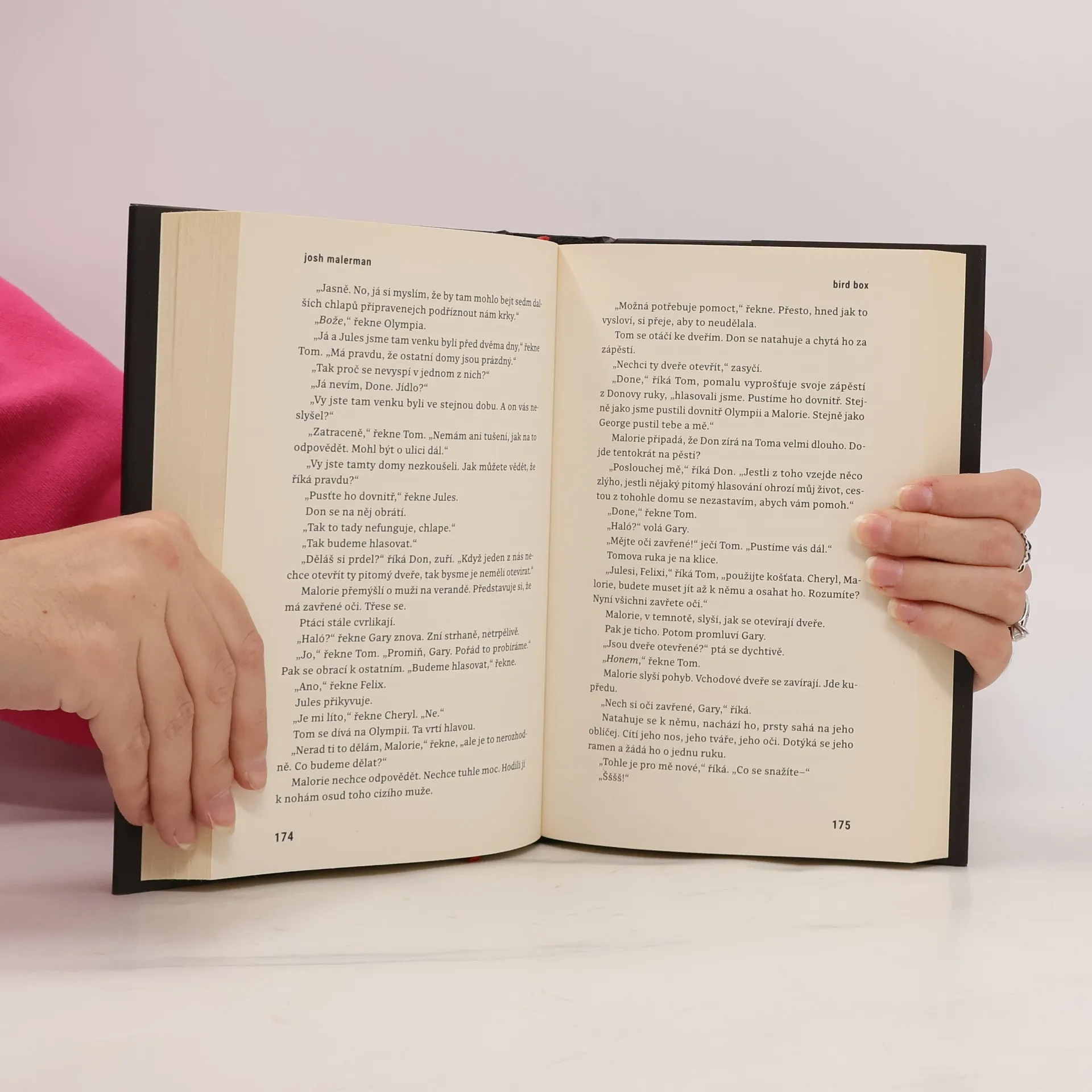 Malorie sleduje silnici před sebou. Snaží se dojet do bezpečí. Nesmí se rozhlédnout. Jediný pohled by ji mohl stát život. Tam venku totiž žijí prazvláštní tvorové. Kdokoli je zahlédne, zešílí. Ublíží svým blízkým. Ublíží sám sobě. Malorie vzhlíží od volantu, vidí domy s okny zakrytými dekami nebo dřevem. Ruku si klade na břicho, ve kterém roste nový život. Je sama. Její sestra je mrtvá. Její rodiče jsou mrtví. Nemá nikoho. Existuje vůbec to místo, to útočiště, které hledá? Napravo se něco pohne, a ona to zahlédne koutkem oka. Nedívá se na to. Zavírá pravé oko. Pták přeletí příliš nízko, málem narazí do čelního skla. Malorie zakřičí, zavře obě oči a otevře je. Když to udělá, zahlédne ulici, kterou hledá. 273 Shillingham. Zavírá oči a dupe na brzdy. Vystupuje, opatrně jde tam, kde si myslí, že jsou vchodové dveře. Má pravdu. Pouští kufr na verandu, osahává cihly, nachází zvonek. Zvoní. Nejdřív žádná odpověď. Začíná si zoufat. Možná to je konec. Jela tak daleko - odvážila se do světa - pro nic? Znovu zvoní na zvonek. A pak znovu. Znovu. Žádná odpověď. Zoufale buší do dveří…