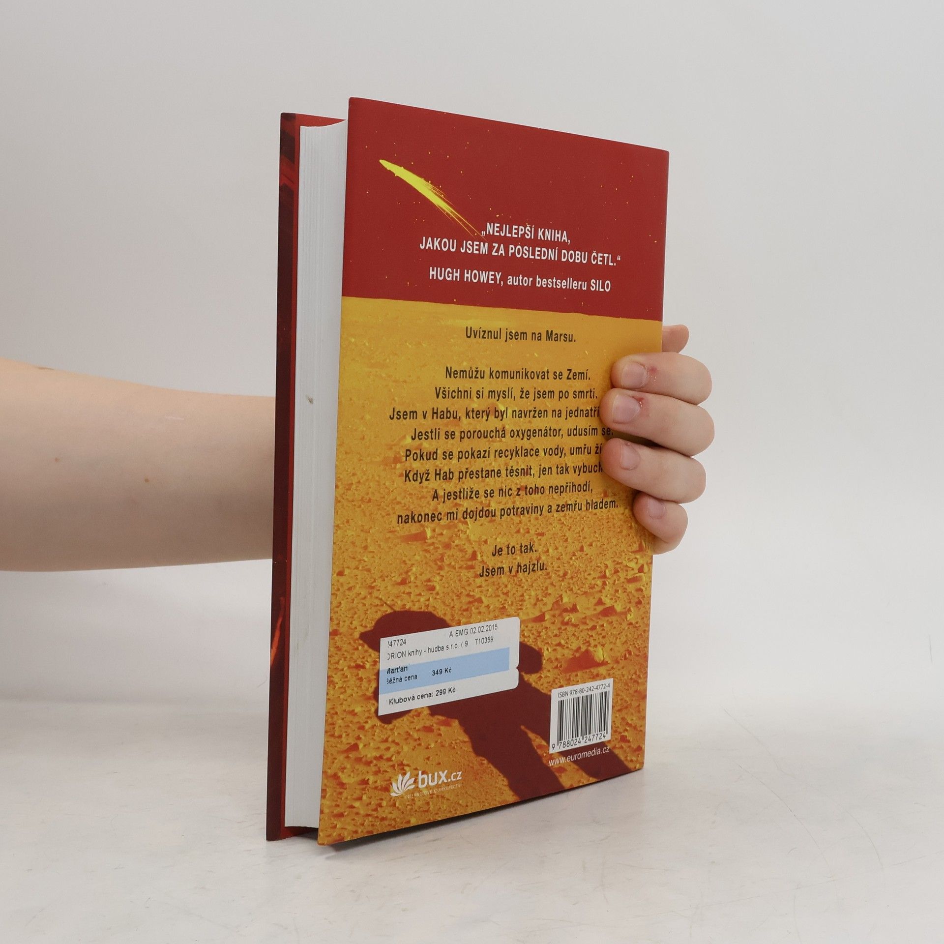 Je nejslavnějším mužem na Zemi. Má to však háček: není na Zemi… Před šesti dny se Mark Watney jako jeden z prvních lidí prošel po Marsu. Teď je přesvědčený, že bude prvním člověkem, který tam zemře. Málem zahynul v prašné bouři a zbytek jeho posádky odletěl v domnění, že je mrtvý. Mark nemá jak odeslat zprávu, že přežil. A i kdyby se s lidmi na Zemi spojit dokázal, zásoby mu dojdou mnohem dřív, než by stačila dorazit pomoc. Mark se však nevzdává. Vyzbrojen pouze svým důvtipem, technickými dovednostmi a nevyčerpatelným smyslem pro humor, který se pro něj stane nejcennějším zdrojem síly, se pouští do tvrdošíjného boje o přežití. Jak zdolává jednu zdánlivě nepřekonatelnou překážku za druhou, začíná věřit, že by na cizí planetě přece jen mohl obstát. Jenže Mars mu ještě přichystá nejedno překvapení… Strhující, podmanivý a přesvědčivý příběh o lidské nezdolnosti a vynalézavosti tváří v tvář beznadějné situaci obletěl celý čtenářský svět a ve všech zemích, kde vychází, sklízí nadšený ohlas. Zaujal i filmové tvůrce, režisér Ridley Scott točí adaptaci s Mattem Damonem v hlavní roli.