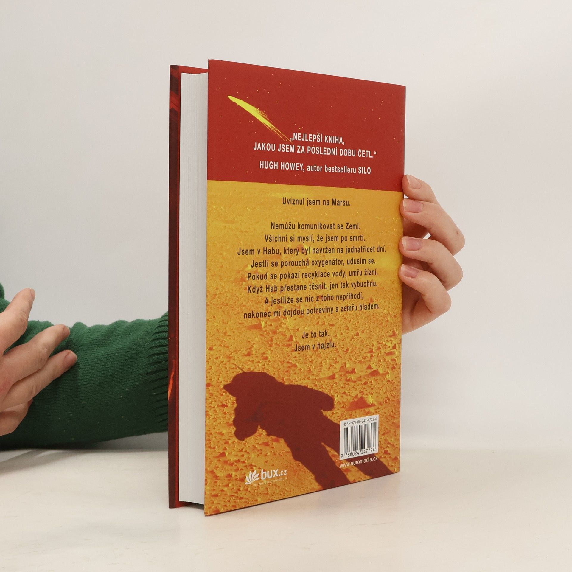 Je nejslavnějším mužem na Zemi. Má to však háček: není na Zemi… Před šesti dny se Mark Watney jako jeden z prvních lidí prošel po Marsu. Teď je přesvědčený, že bude prvním člověkem, který tam zemře. Málem zahynul v prašné bouři a zbytek jeho posádky odletěl v domnění, že je mrtvý. Mark nemá jak odeslat zprávu, že přežil. A i kdyby se s lidmi na Zemi spojit dokázal, zásoby mu dojdou mnohem dřív, než by stačila dorazit pomoc. Mark se však nevzdává. Vyzbrojen pouze svým důvtipem, technickými dovednostmi a nevyčerpatelným smyslem pro humor, který se pro něj stane nejcennějším zdrojem síly, se pouští do tvrdošíjného boje o přežití. Jak zdolává jednu zdánlivě nepřekonatelnou překážku za druhou, začíná věřit, že by na cizí planetě přece jen mohl obstát. Jenže Mars mu ještě přichystá nejedno překvapení… Strhující, podmanivý a přesvědčivý příběh o lidské nezdolnosti a vynalézavosti tváří v tvář beznadějné situaci obletěl celý čtenářský svět a ve všech zemích, kde vychází, sklízí nadšený ohlas. Zaujal i filmové tvůrce, režisér Ridley Scott točí adaptaci s Mattem Damonem v hlavní roli.