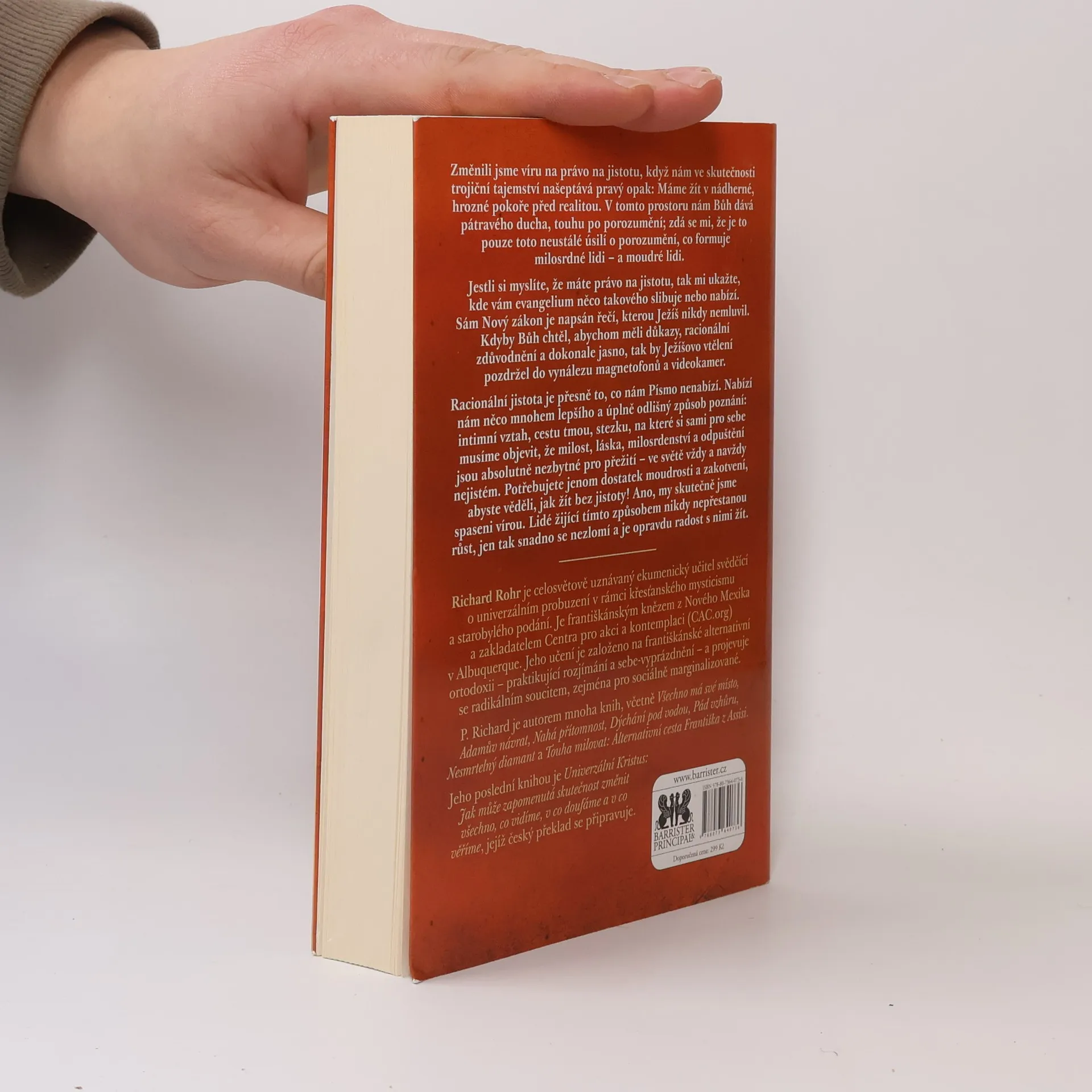 Změnili jsme víru na právo na jistotu, když nám ve skutečnosti trojiční tajemství našeptává pravý opak: Máme žít v nádherné, hrozné pokoře před realitou. V tomto prostoru nám Bůh dává pátravého ducha, touhu po porozumění; zdá se mi, že je to pouze toto neustálé úsilí o porozumění, co formuje milosrdné lidi - a moudré lidi. Jestli si myslíte, že máte právo na jistotu, tak mi ukažte, kde vám evangelium něco takového slibuje nebo nabízí. Sám Nový zákon je napsán řečí, kterou Ježíš nikdy nemluvil. Kdyby Bůh chtěl, abychom měli důkazy, racionální zdůvodnění a dokonale jasno, tak by Ježíšovo vtělení pozdržel do vynálezu magnetofonů a videokamer. Racionální jistota je přesně to, co nám Písmo nenabízí. Nabízí nám něco mnohem lepšího a úplně odlišný způsob poznání: intimní vztah, cestu tmou, stezku, na které si sami pro sebe musíme objevit, že milost, láska, milosrdenství a odpuštění jsou absolutně nezbytné pro přežití - ve světě vždy a navždy nejistém. Potřebujete jenom dostatek moudrosti a zakotvení, abyste věděli, jak žít bez jistoty! Ano, my skutečně jsme spaseni vírou. Lidé žijící tímto způsobem nikdy nepřestanou růst, jen tak snadno se nezlomí a je opravdu radost s nimi žít. Richard Rohr je celosvětově uznávaný ekumenický učitel, františkánský kněz z Nového Mexika a autor mnoha knih.