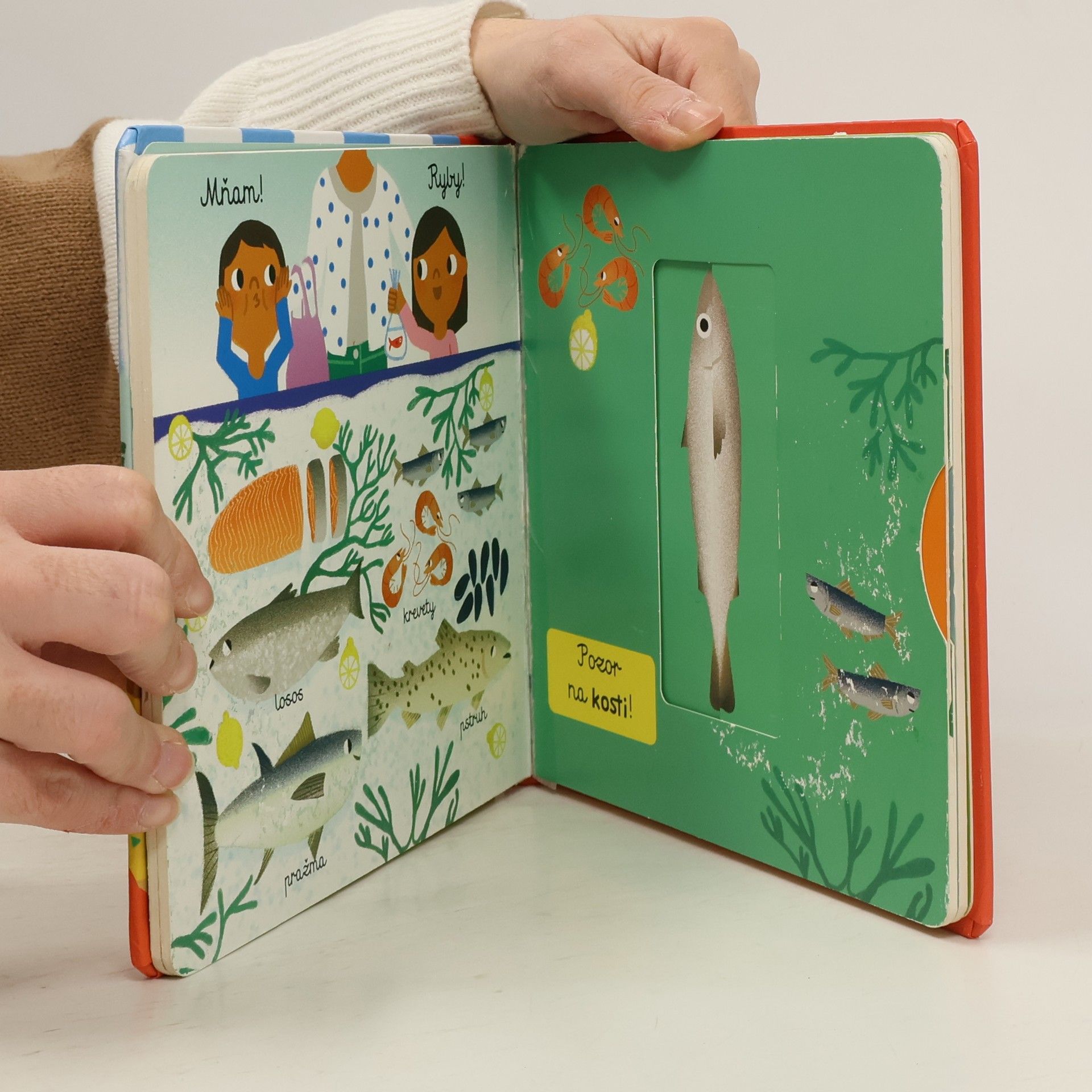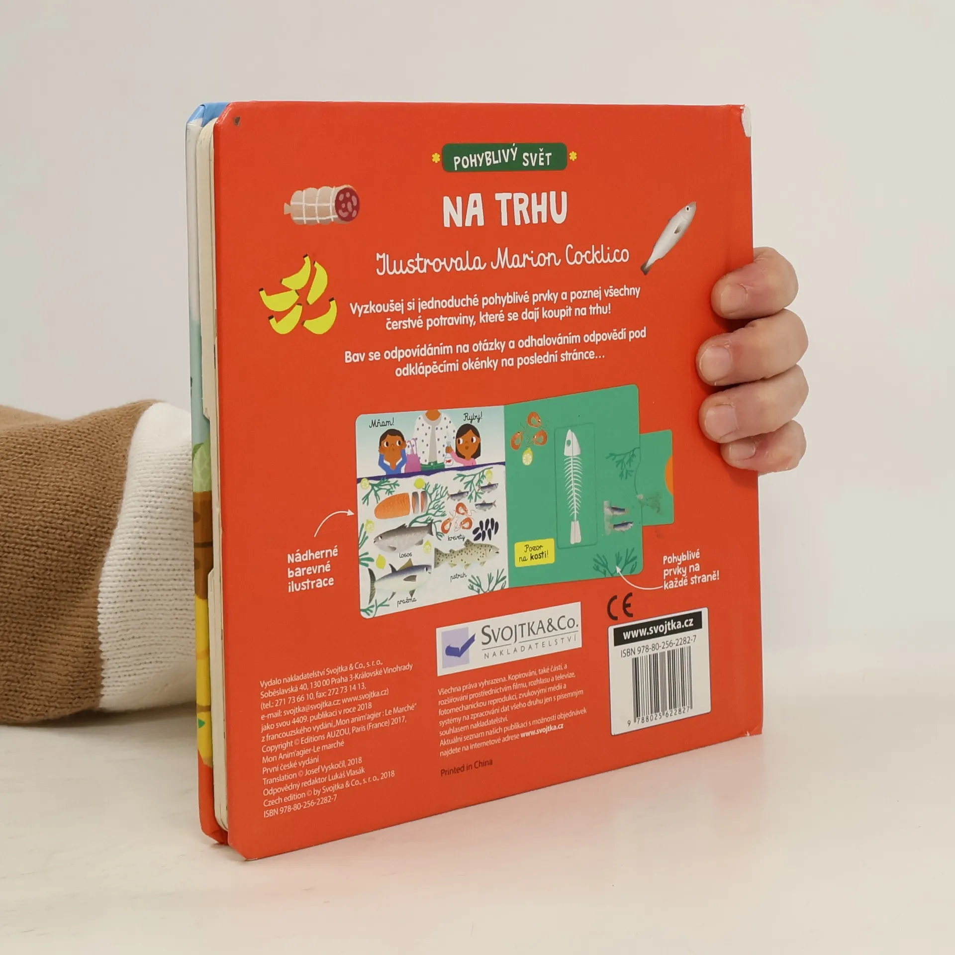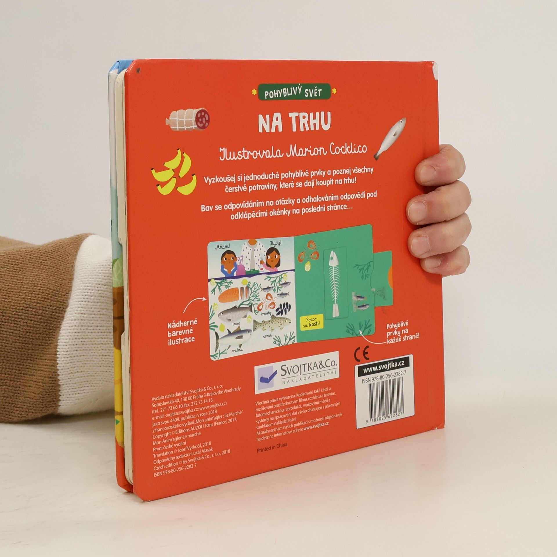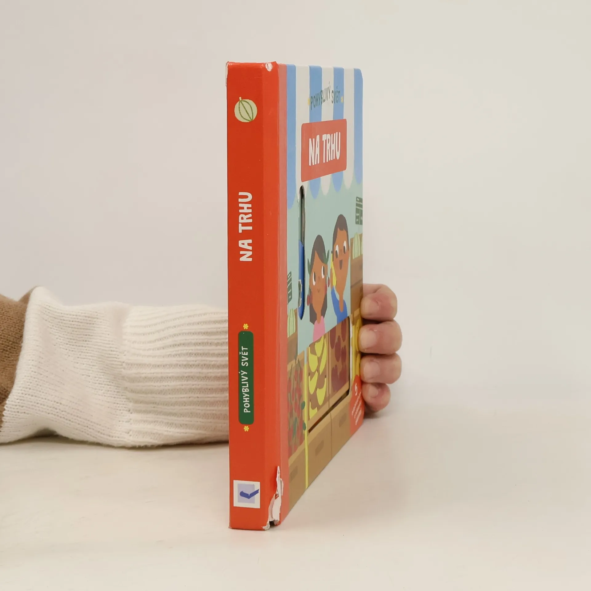 Leporelo s pohyblivými prvky seznámí malého čtenáře s čerstvými potravinami, které se dají na trhu koupit a pomůže mu se mezi jednotlivými stánky orientovat.
