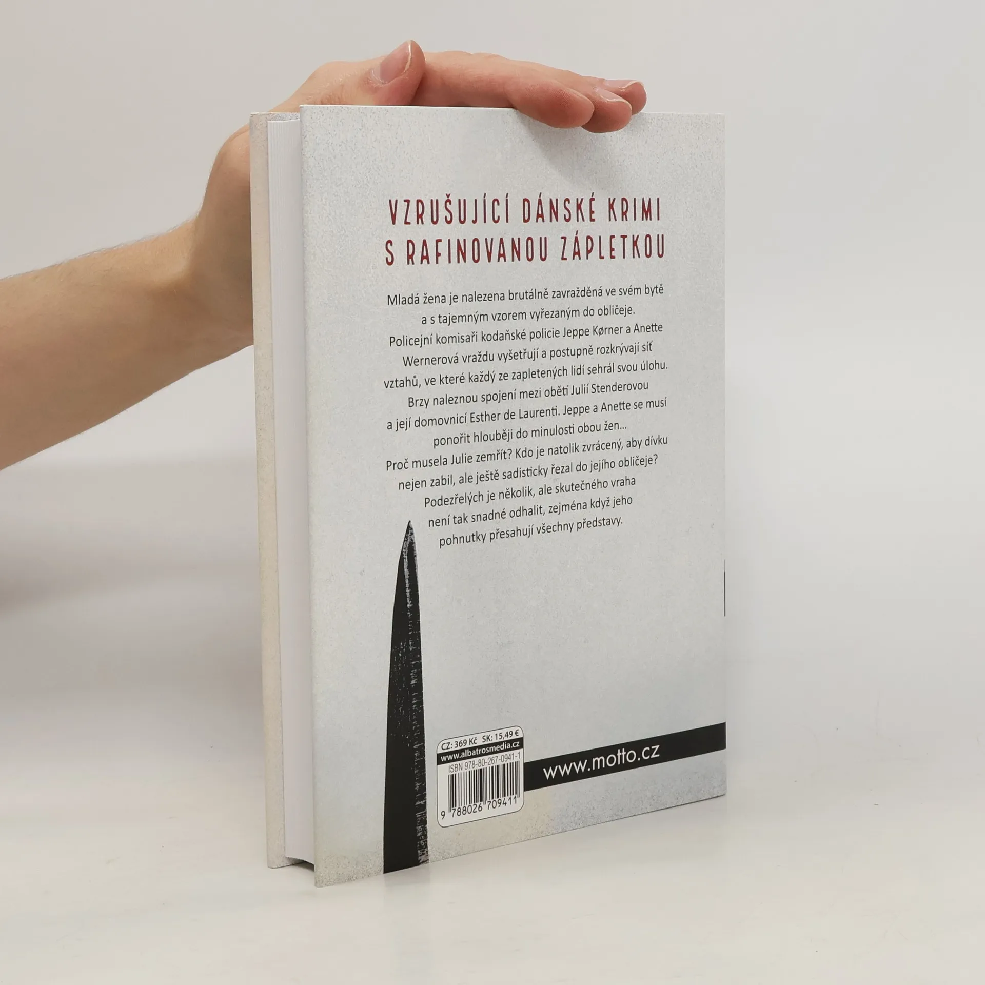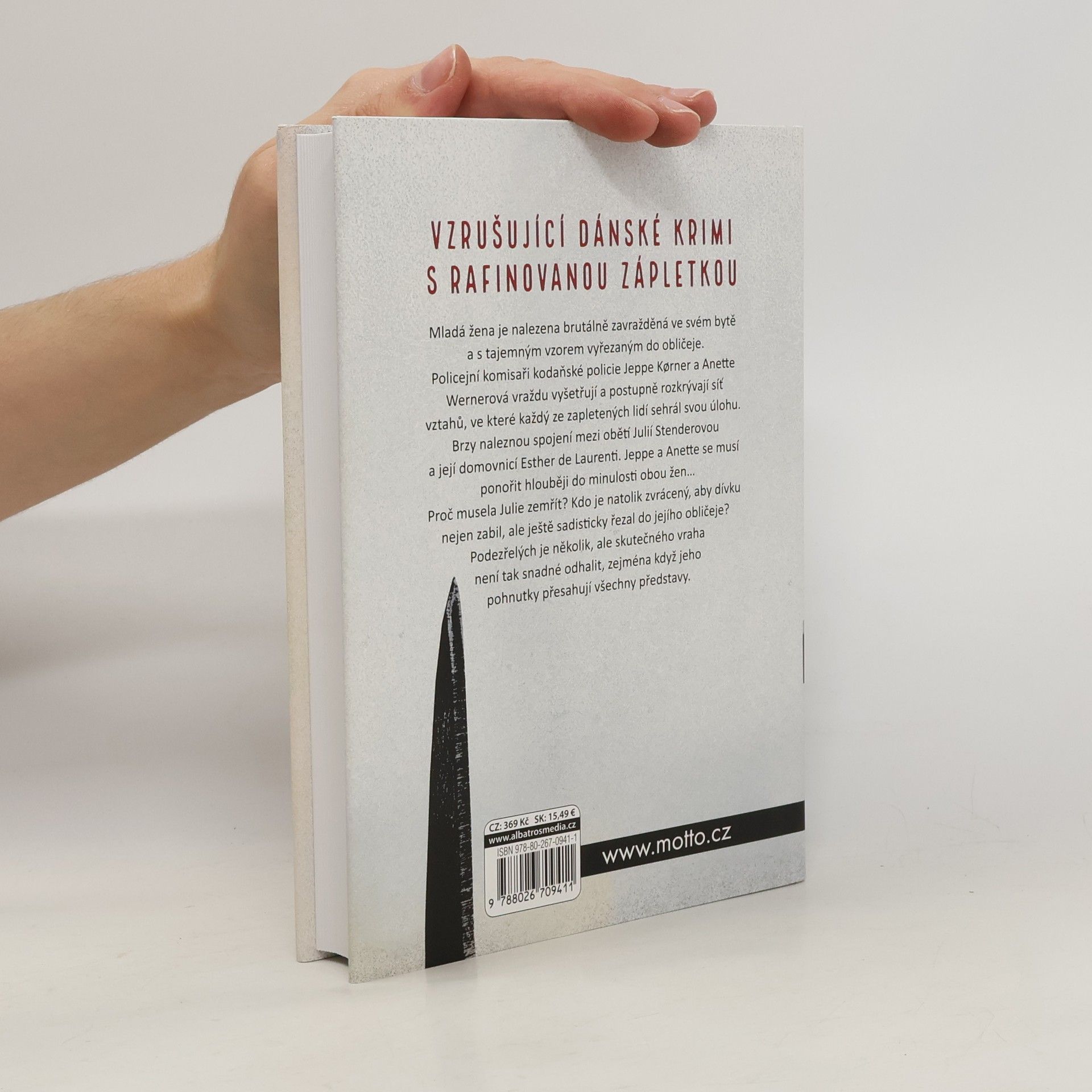 Mladá žena je nalezena brutálně zavražděná ve svém bytě s tajemným vzorem vyřezaným do obličeje. Policejní komisaři kodaňské policie Jeppe Korner a Anette Wernerová vraždu vyšetřují a postupně rozkrývají síť vztahů, ve které každý ze zapletených lidí sehrál svou úlohu. Brzy naleznou spojení mezi obětí Julií Stenderovou a její domovnicí Esther de Laurenti. Jeppe a Anette se musí ponořit hlouběji do minulosti obou žen… Proč musela Julie zemřít? Kdo je natolik zvrácený, aby dívku nejen zabil, ale ještě sadisticky řezal do jejího obličeje? Podezřelých je několik, ale skutečného vraha není tak snadné odhalit, zejména když jeho pohnutky přesahují všechny představitelné scénáře. Debut dánské spisovatelky Katrine Engbergové překvapí mrazivým napětím, rafinovanou zápletkou i citlivě vykreslenými lidskými osudy. Román je první knihou z očekávané trilogie o policejních komisařích Jeppem Kornerovi a Anette Wernerové.