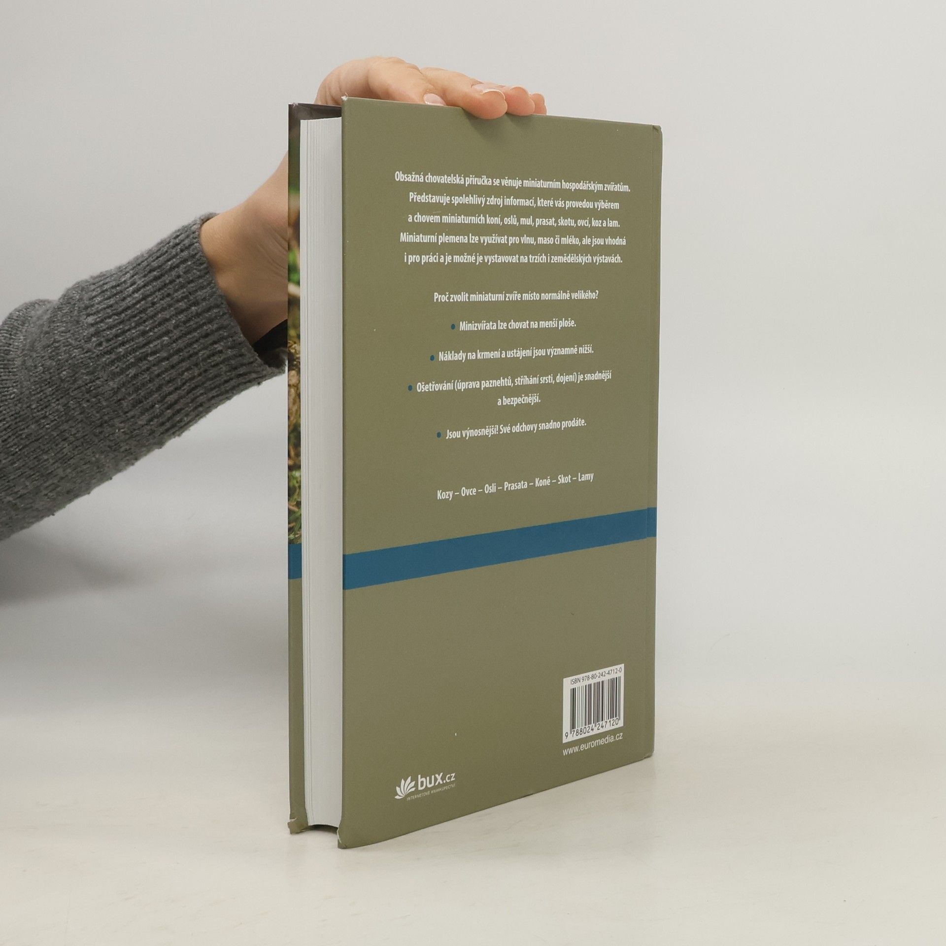 Praktická černobílá publikace nabízí podrobné informace o všem, co je potřeba při chovu vědět: výběr zvířete, ochrana před predátory, ustájení, krmení, označování, zdraví, mléko, jednotlivé druhy (skot, koně, kozy, lamy, prasata, ovce). Chov miniaturních zvířat je celosvětový trend.