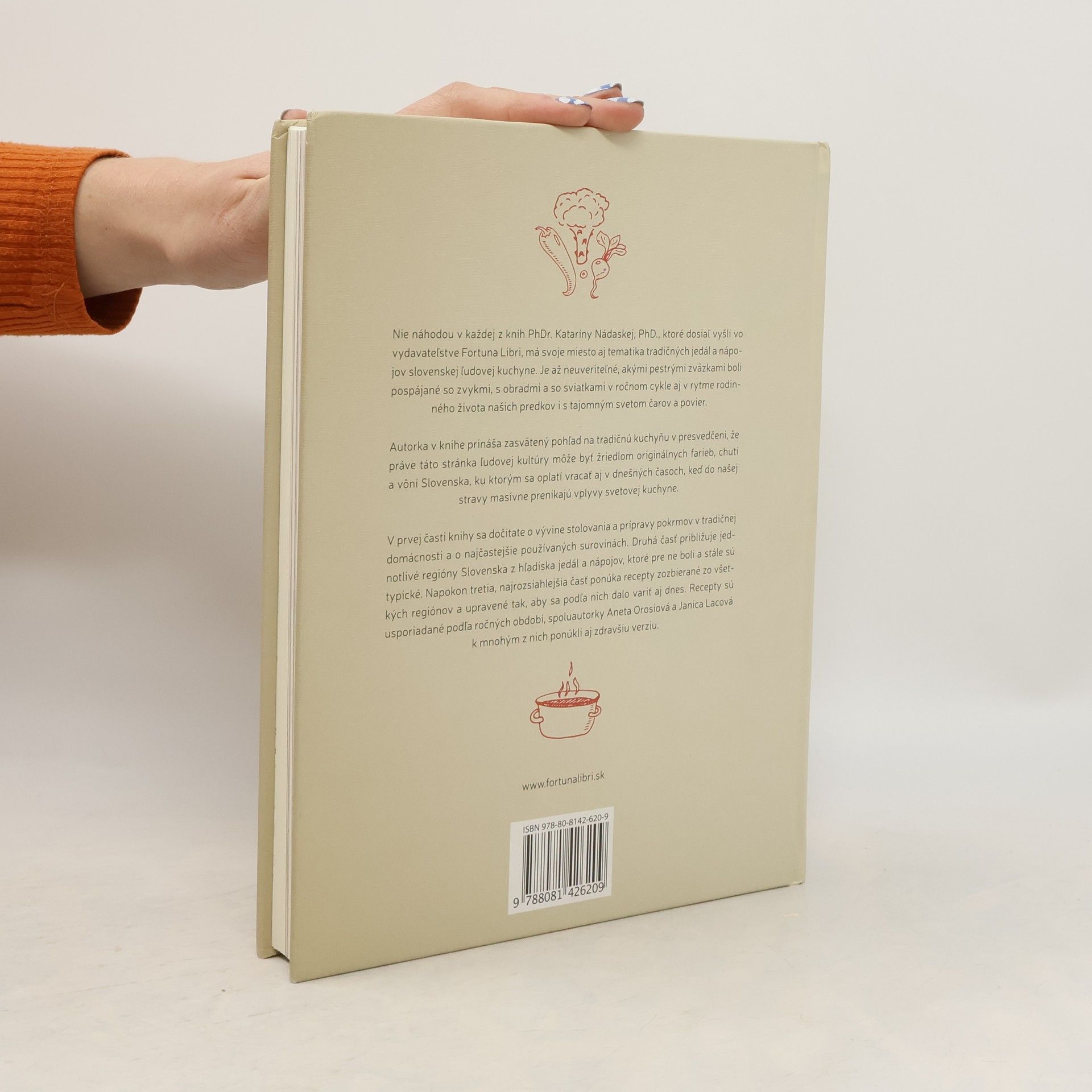 Ako chutí Slovensko na tanieri? Známa etnologička Katarína Nádaská v knihe prináša zasvätený pohľad na tradičnú kuchyňu v presvedčení, že práve táto stránka ľudovej kultúry môže byť žriedlom originálnych farieb, chutí a vôní Slovenska, ku ktorým sa oplatí vracať aj v dnešných časoch, keď do našej stravy masívne prenikajú vplyvy svetovej kuchyne. Naša ľudová kuchyňa je okrem rodinného života našich predkov spätá aj so zvykmi, s obradmi, so sviatkami, či dokonca s poverami v ročnom cykle. V prvej časti knihy sa dočítate o vývine stolovania a prípravy pokrmov v tradičnej domácnosti a o najčastejšie používaných surovinách. Druhá časť približuje jednotlivé regióny Slovenska z hľadiska jedál a nápojov, ktoré pre ne boli a stále sú typické. Napokon tretia, najrozsiahlejšia časť ponúka recepty zozbierané zo všetkých regiónov a upravené tak, aby sa podľa nich dalo variť aj dnes. Recepty sú usporiadané podľa ročných období, spoluautorky Aneta Orosiová a Janica Lacová k mnohým z nich ponúkli aj zdravšiu verziu.