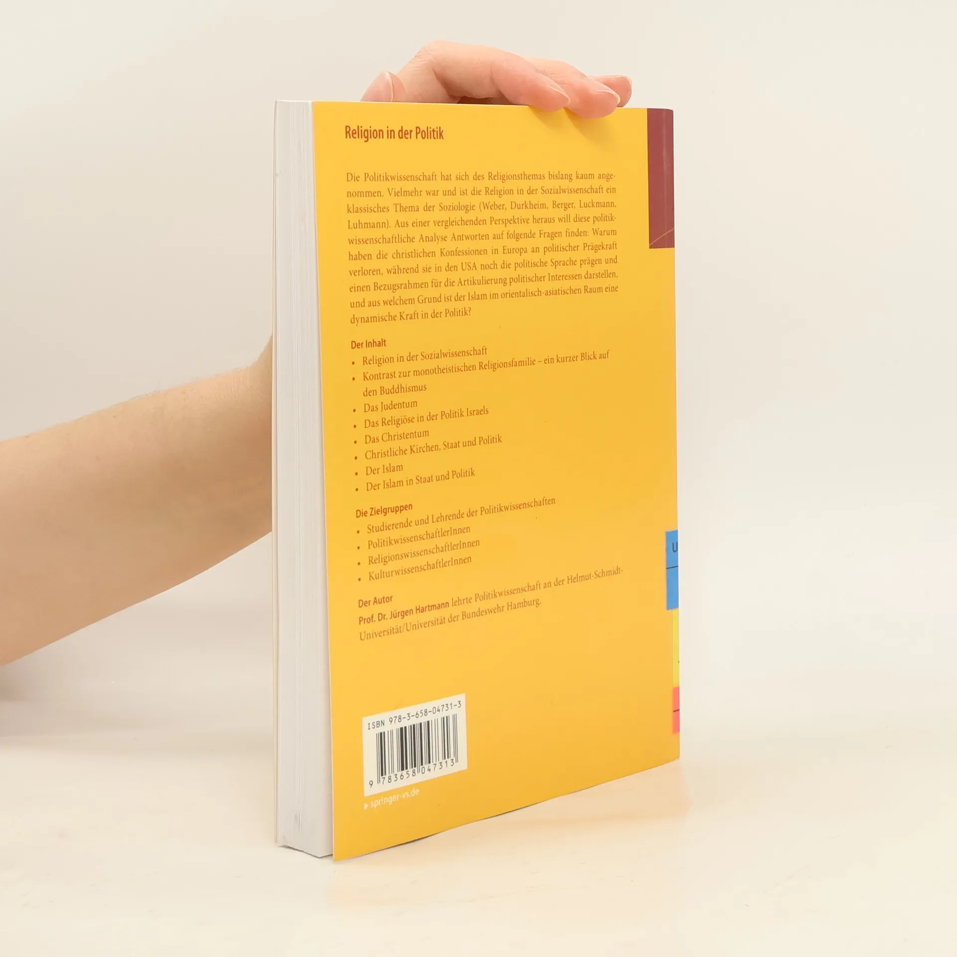 Die Politikwissenschaft hat sich des Religionsthemas bislang kaum angenommen. Vielmehr war und ist die Religion in der Sozialwissenschaft ein klassisches Thema der Soziologie (Weber, Durkheim, Berger, Luckmann, Luhmann). Aus einer vergleichenden Perspektive heraus will diese politikwissenschaftliche Analyse Antworten auf folgende Fragen finden: Warum haben die christlichen Konfessionen in Europa an politischer Prägekraft verloren, während sie in den USA noch die politische Sprache prägen und einen Bezugsrahmen für die Artikulierung politischer Interessen darstellen, und aus welchem Grund ist der Islam im orientalisch-asiatischen Raum eine dynamische Kraft in der Politik.