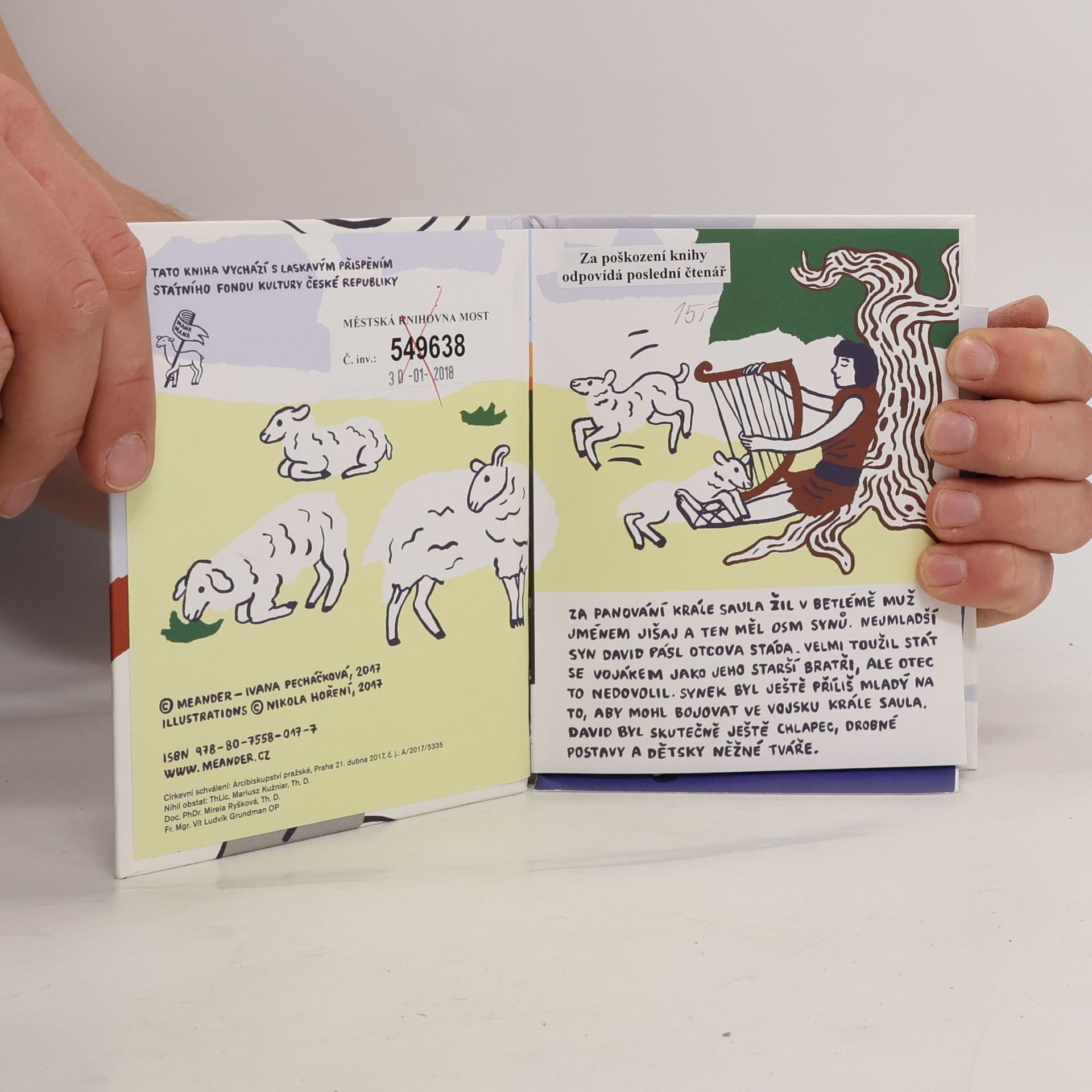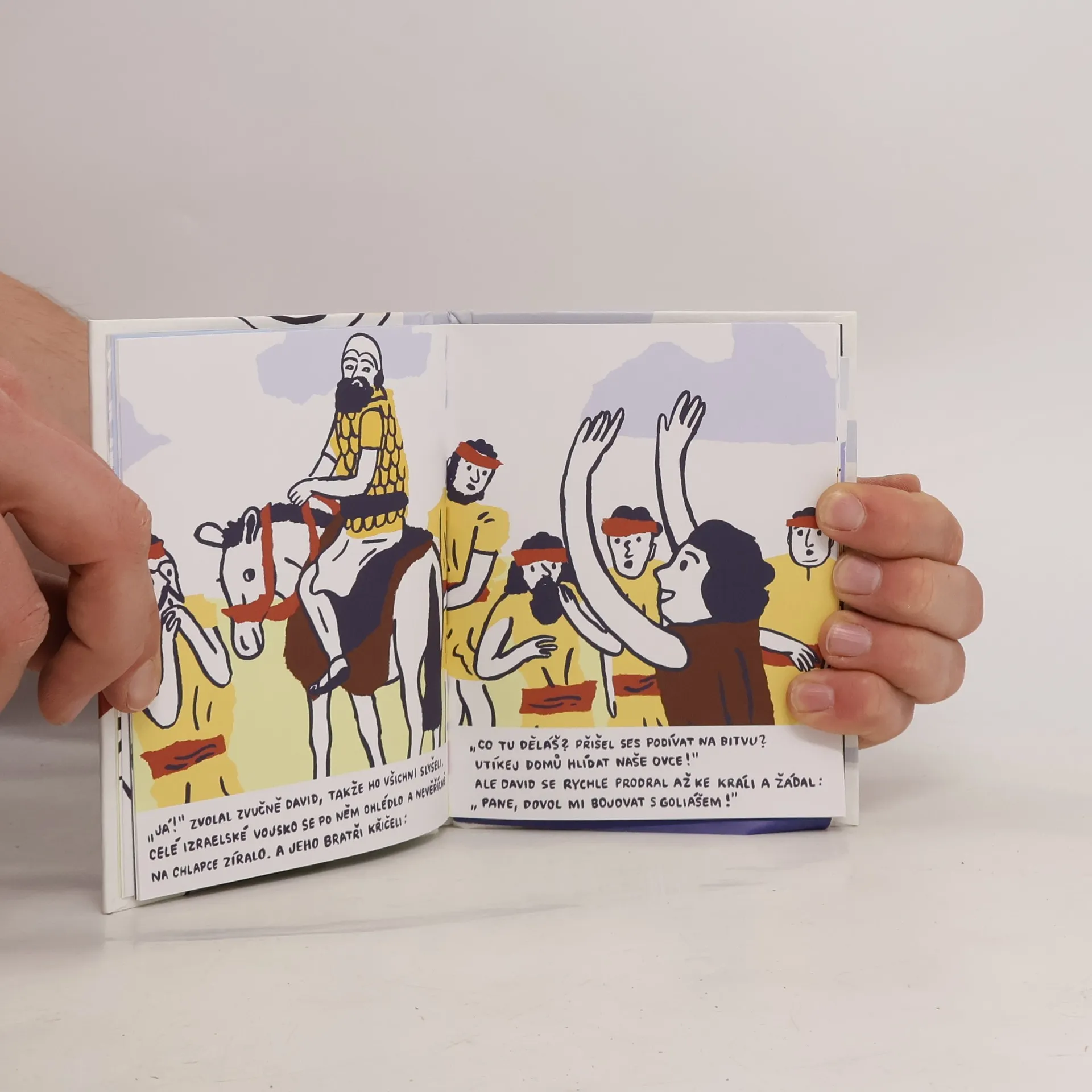 Dobrodružný příběh o tom, jak malý David přechytračil a porazil obra Goliáše, ilustrovala Nikola Hoření.