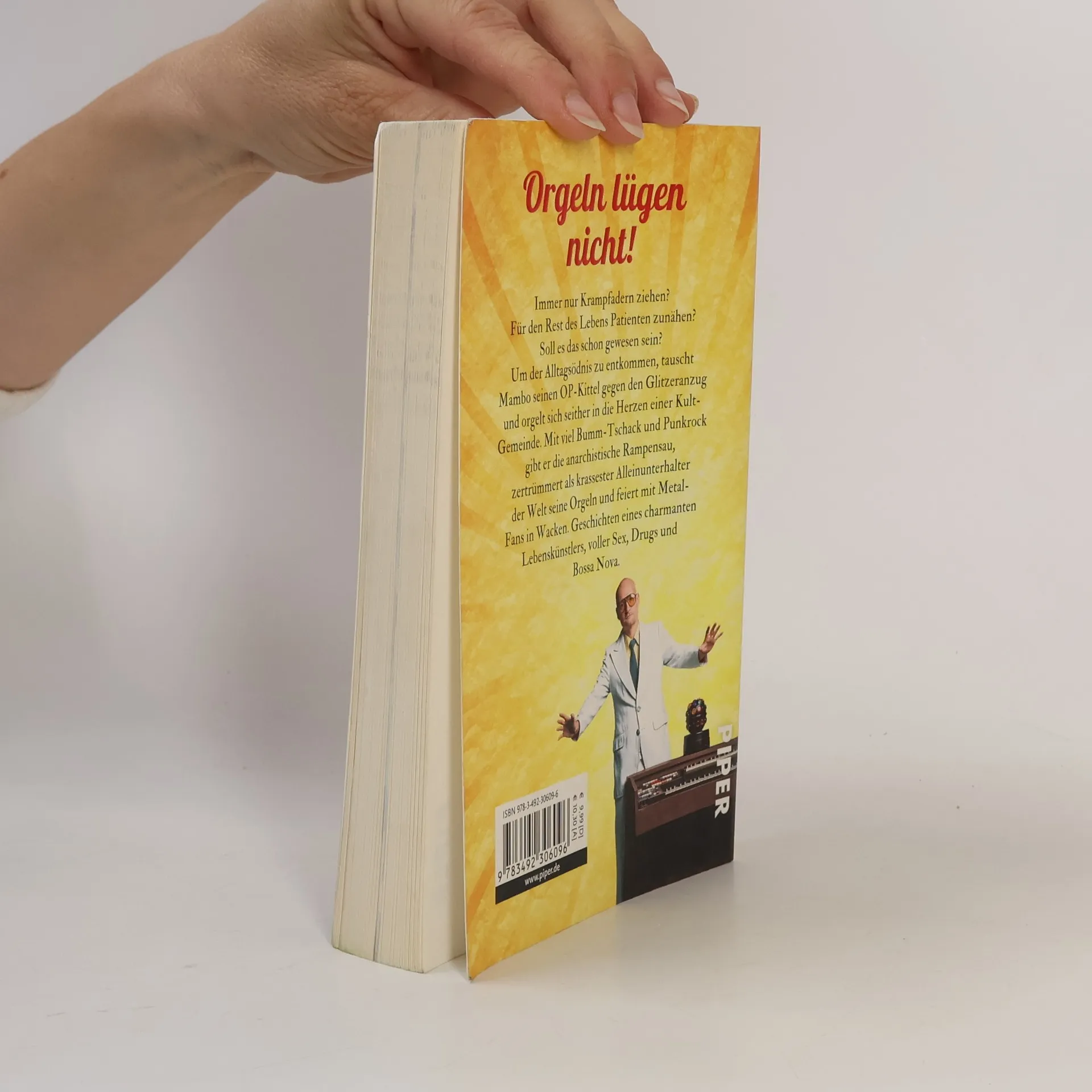 Immer nur Krampfadern ziehen? Für den Rest des Lebens Patienten zunähen? Soll es das schon gewesen sein? Um der Alltagsödnis zu entkommen, tauscht Mambo seinen OP-Kittel gegen den Glitzeranzug und orgelt sich seither in die Herzen einer Kult-Gemeinde. Mit viel Bumm-Tschack und Punkrock gibt er die anarchistische Rampensau, zertrümmert als krassester Alleinunterhalter der Welt seine Orgeln und feiert mit Metal-Fans zu „Alle Mädchen wollen nur das eine“. Geschichten eines charmanten Lebenskünstlers, voller Sex, Drugs und Bossa Nova.